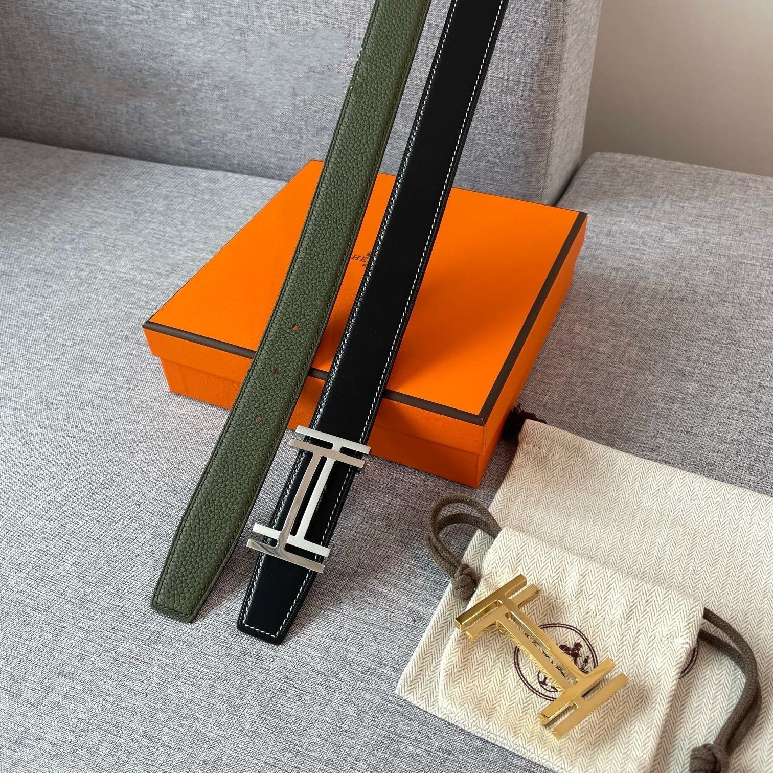 H MARIN REVERSIBLE BELT 32MM GOLD BUCKLE BLACK DARK GREEN LEATHER