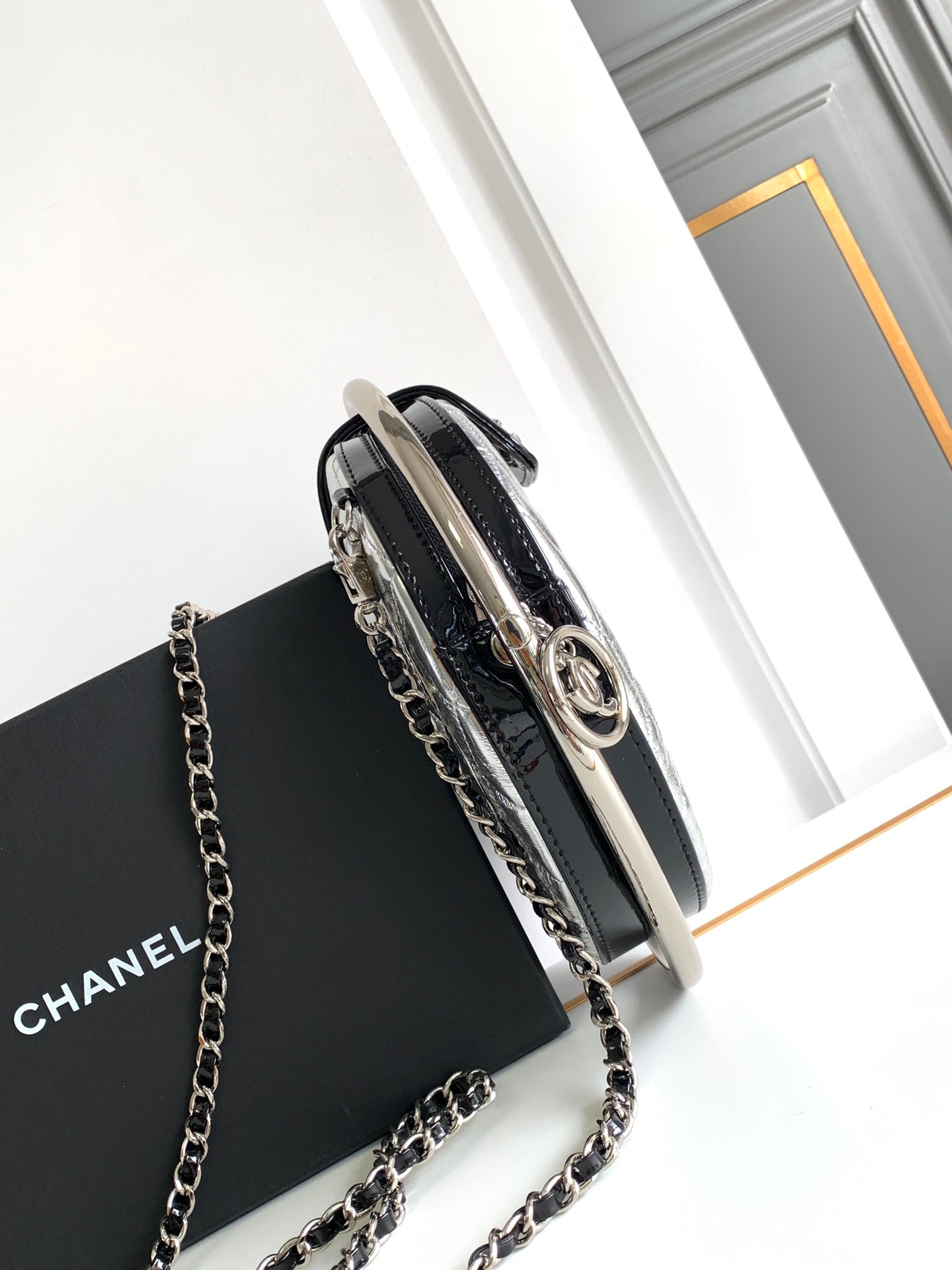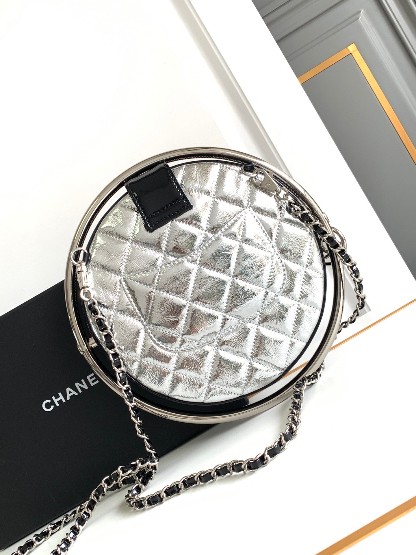 CC 22 EARTH GLOBE ORB CHAIN BAG IN SILVER CALFSKIN