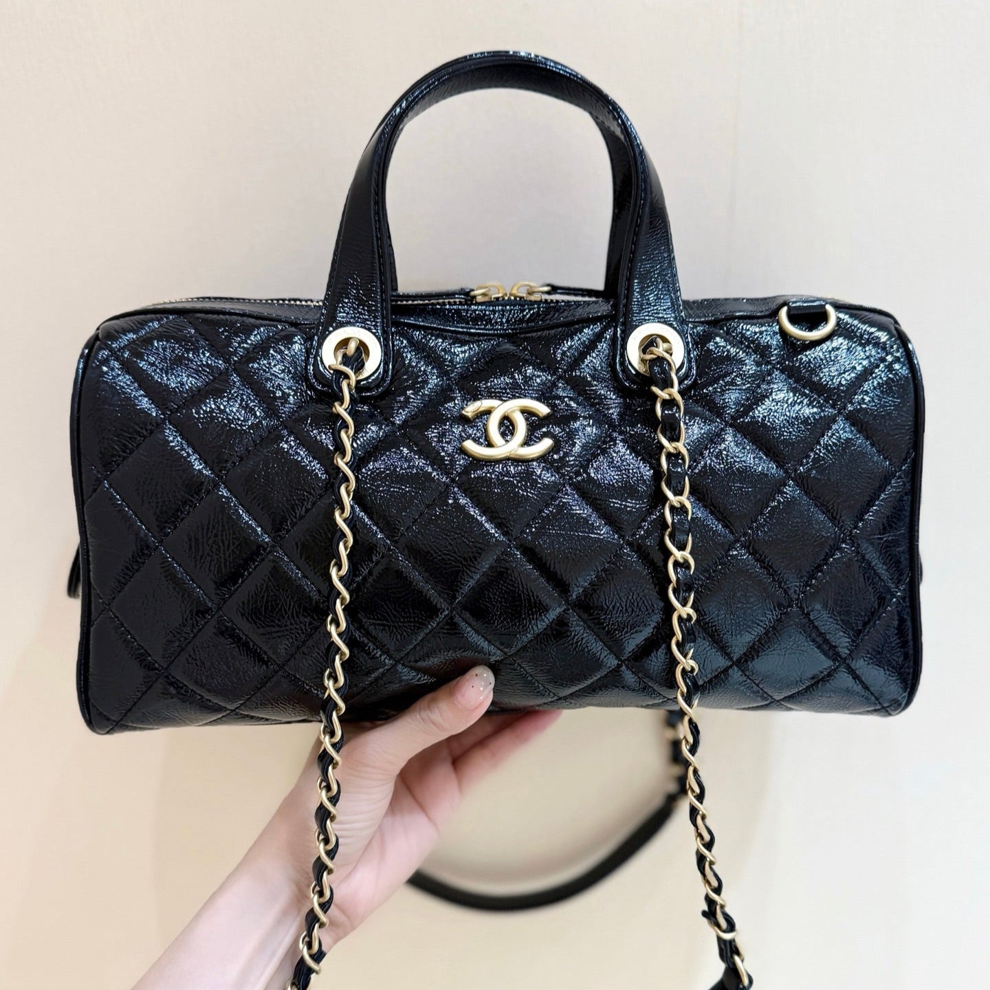 CC 25s Maxi Bowling Bag 31cm Black Patent Crumpled Calfskin