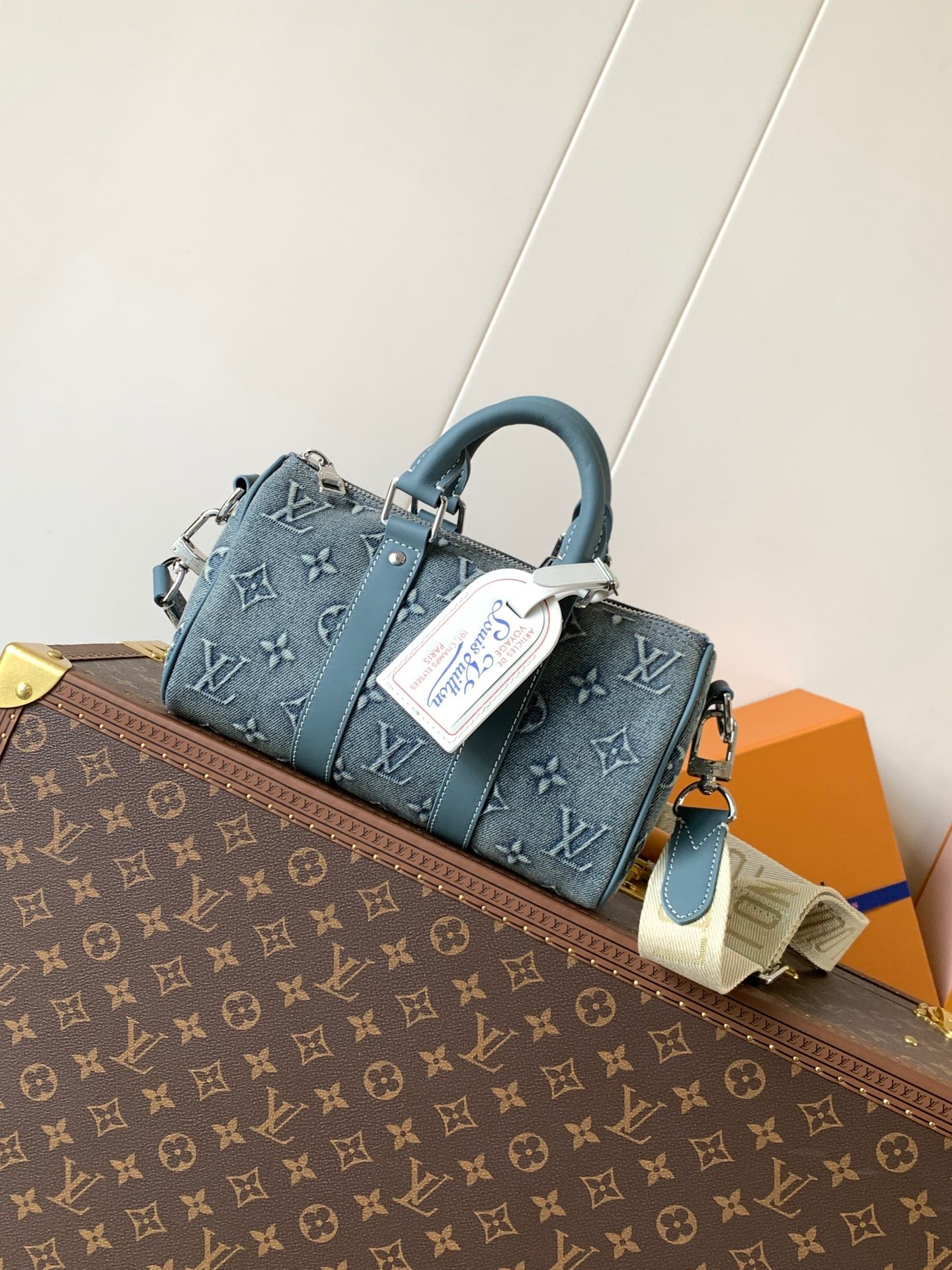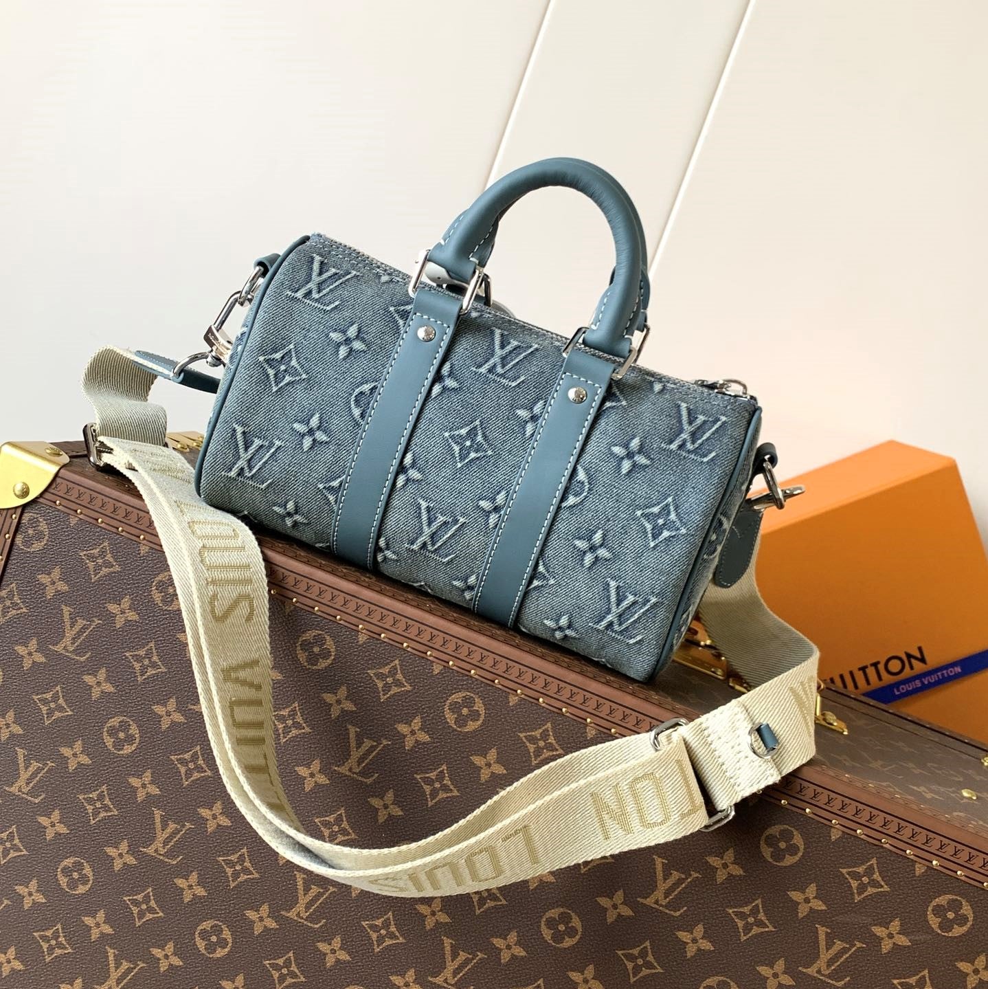 LV Keepall Bandoulière 25 Blue Monogram Washed Denim & Cowhide