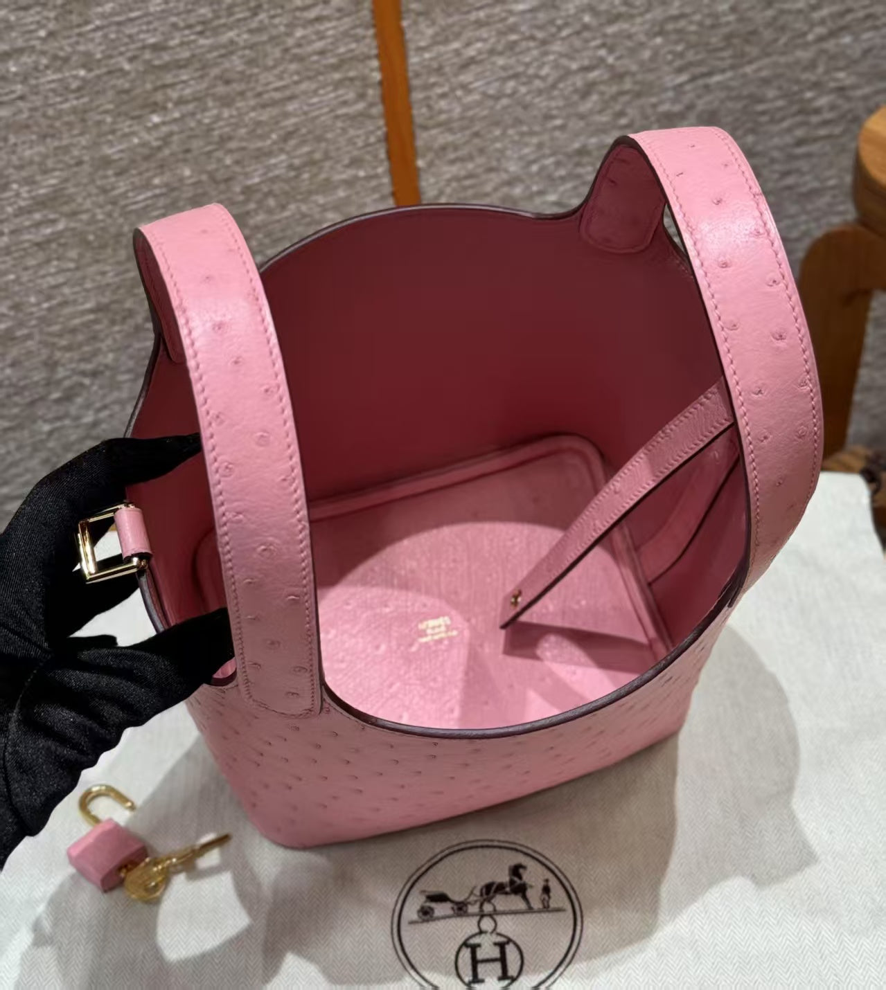 Picotin Lock Pink Ostrich Gold Hardware