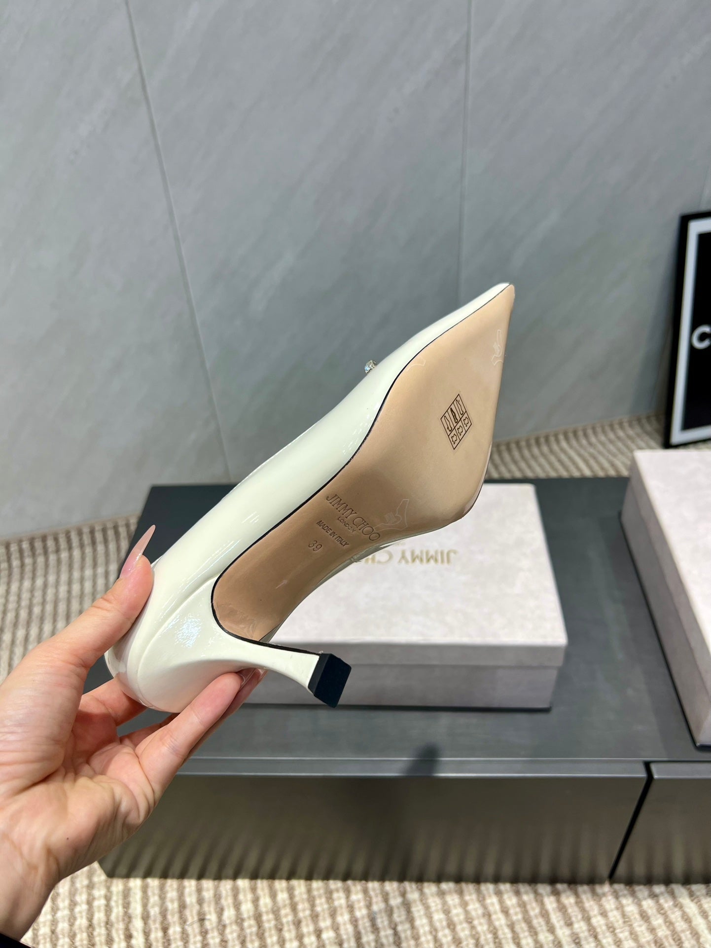 - Material: Patent Leather Crystal Studded Heels