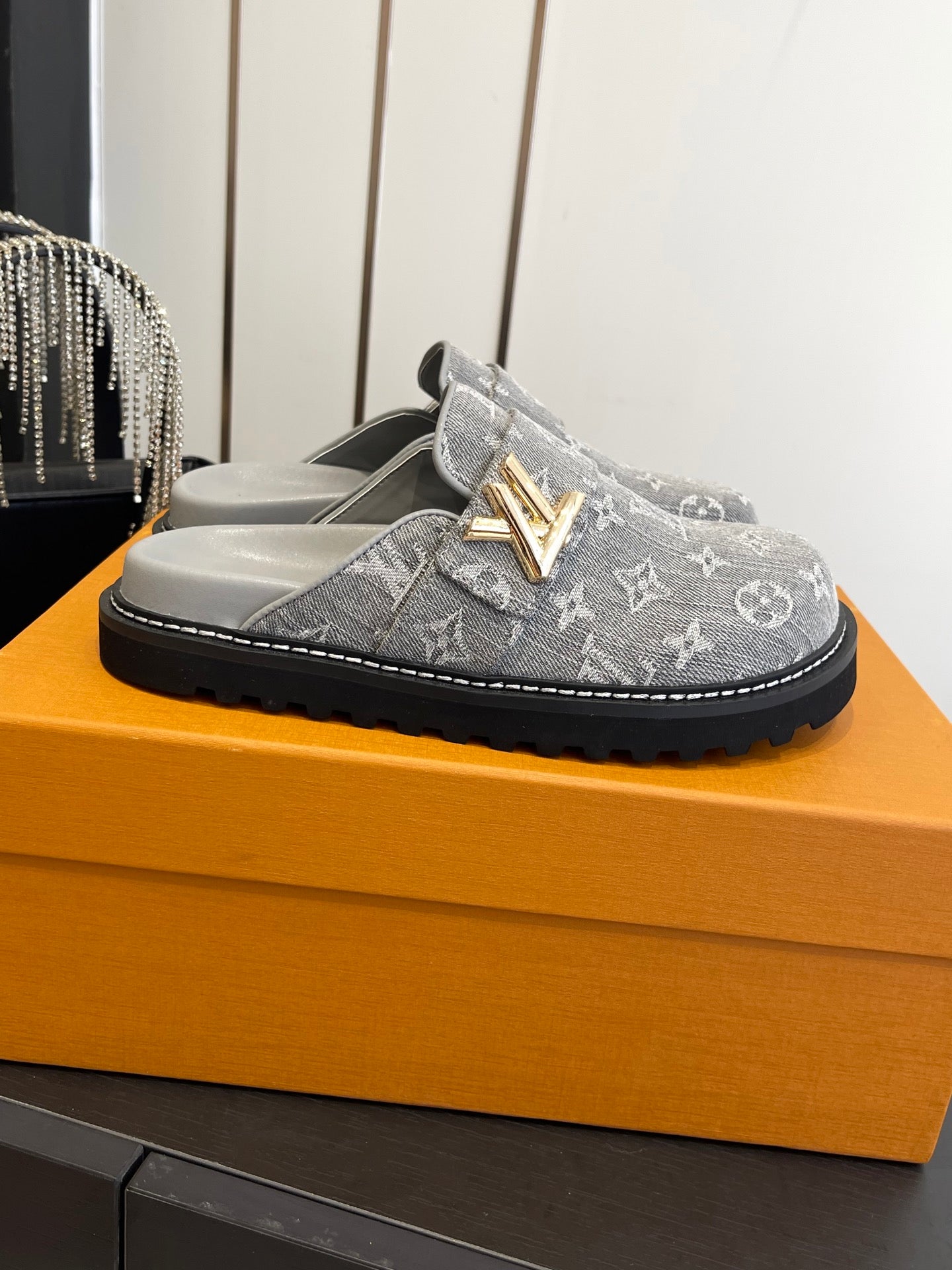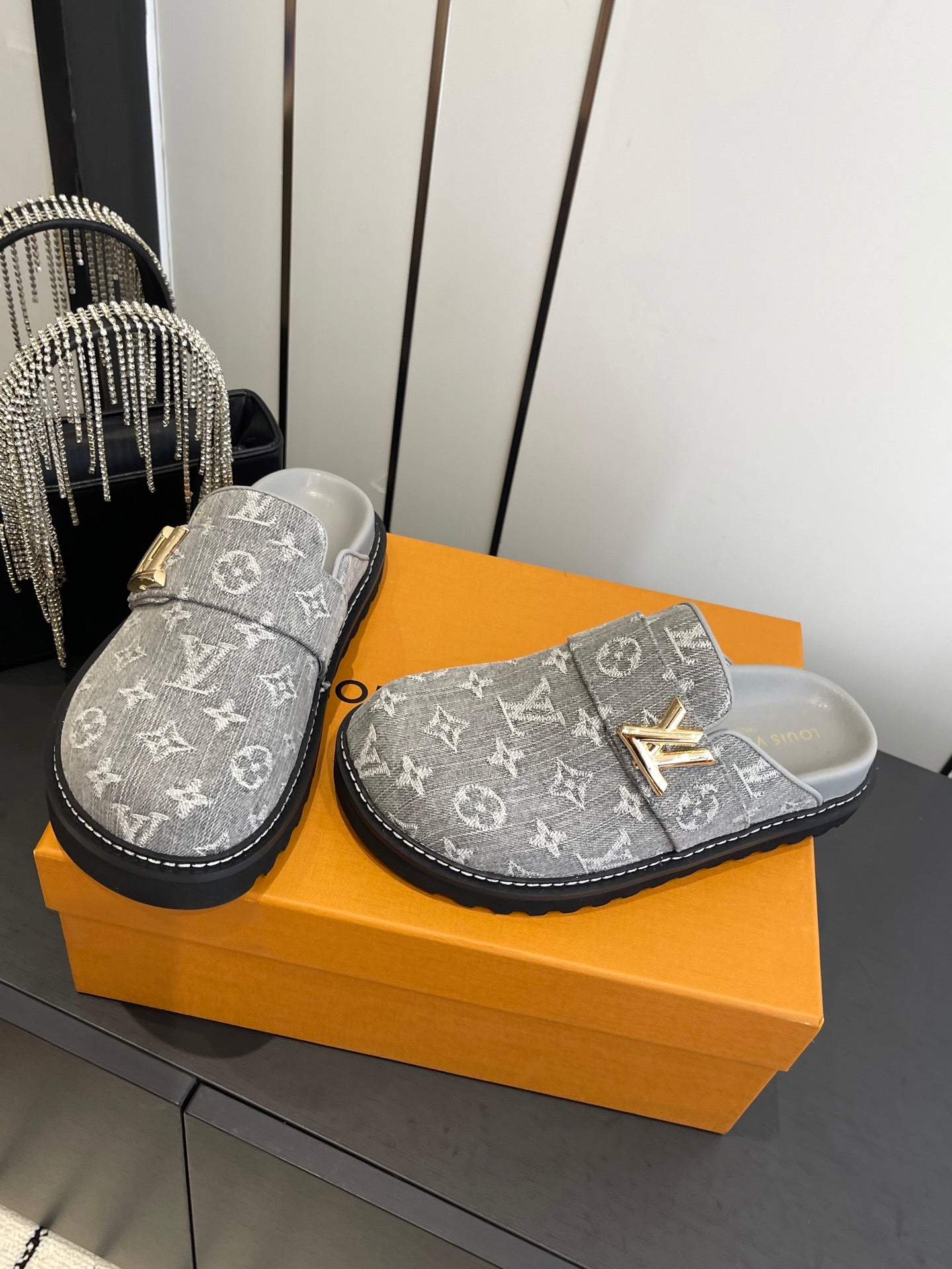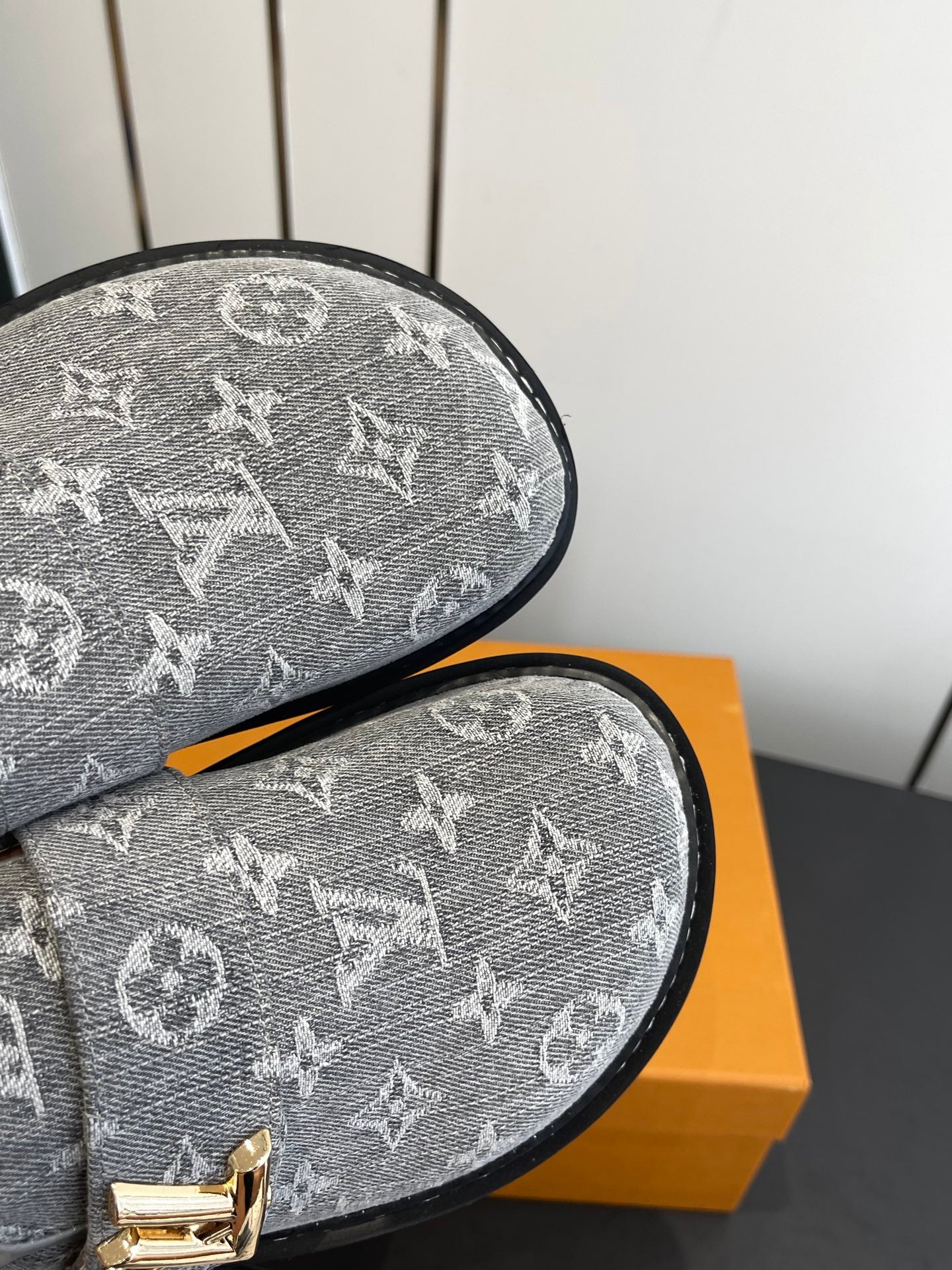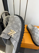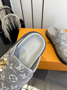 LV Cosy Comfort Mule Sandals Grey Gold Denim Monogrammed 533461