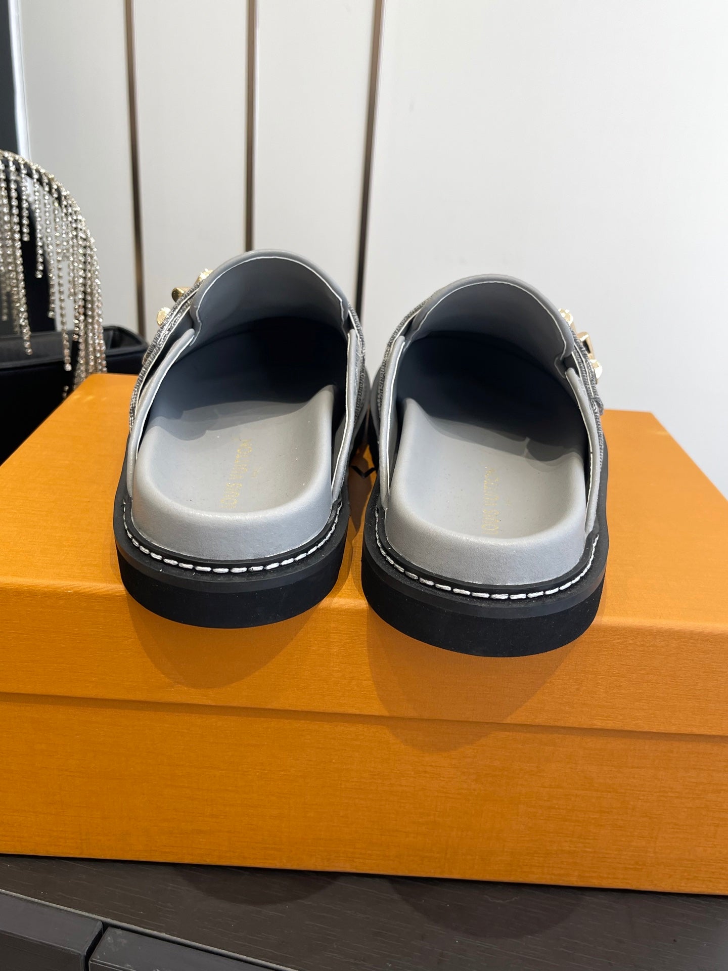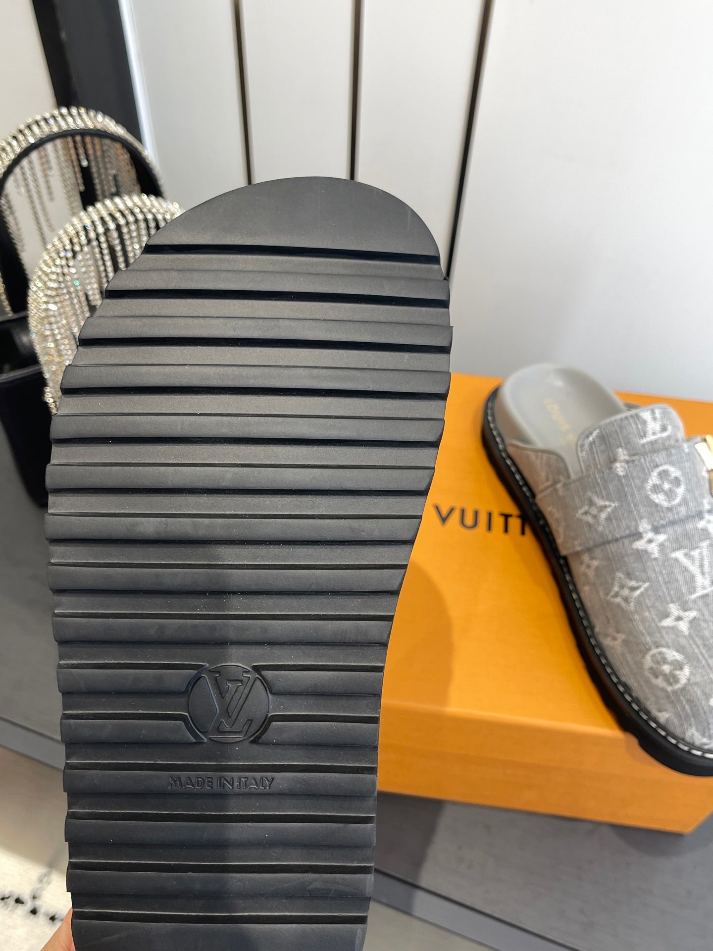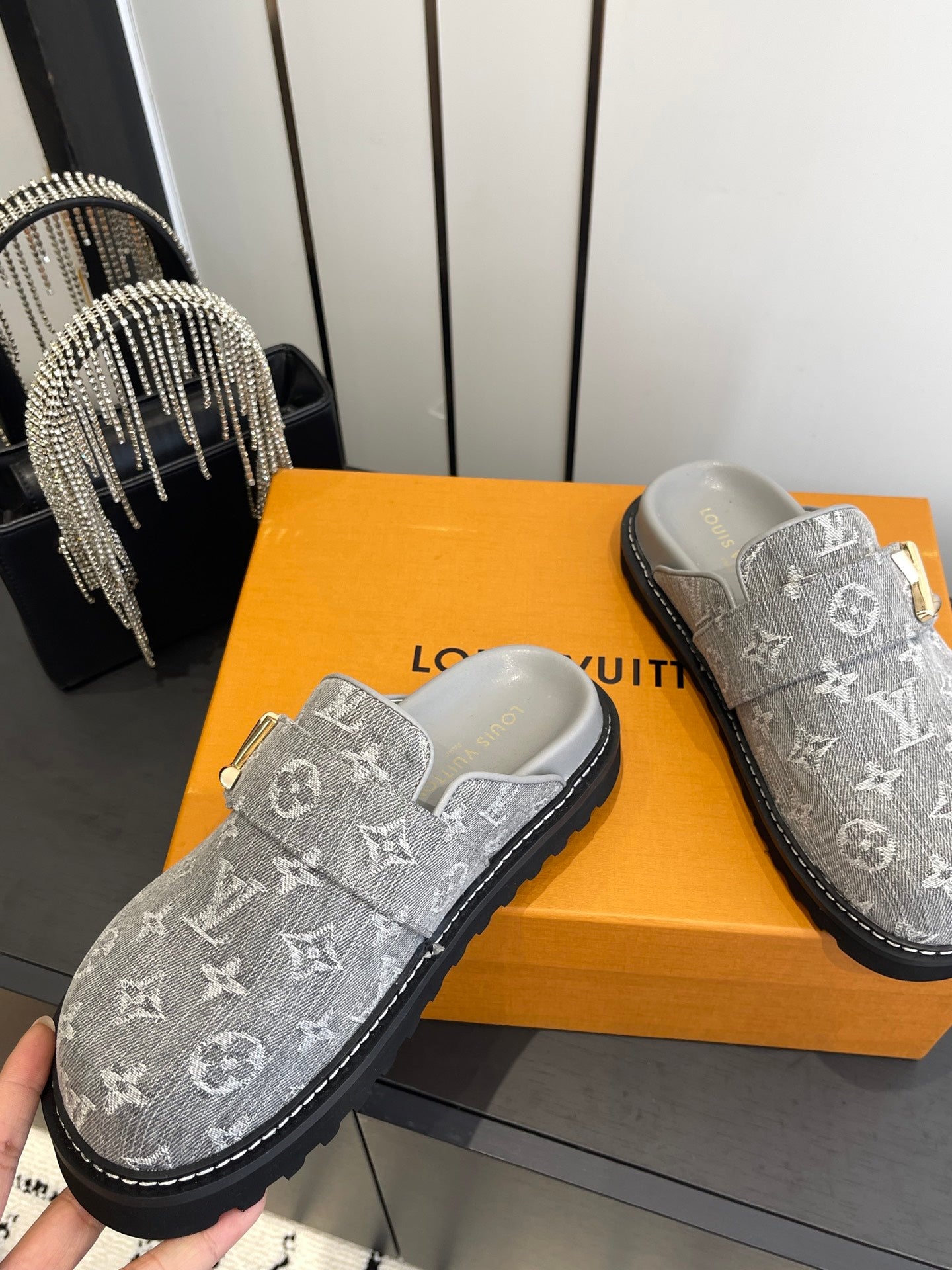 LV Cosy Comfort Mule Sandals Grey Gold Denim Monogrammed 533461