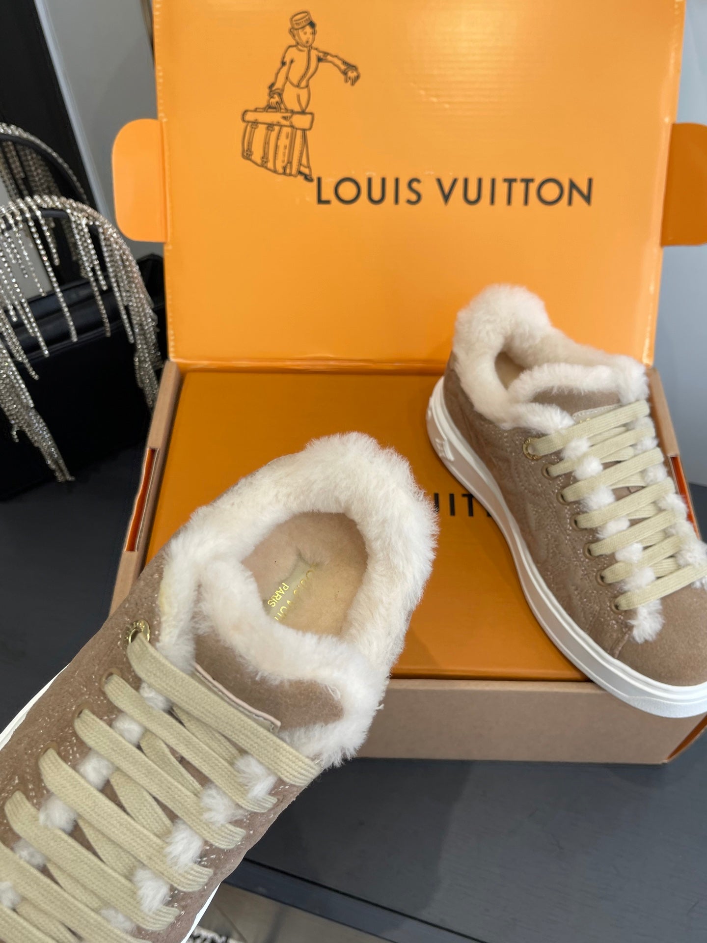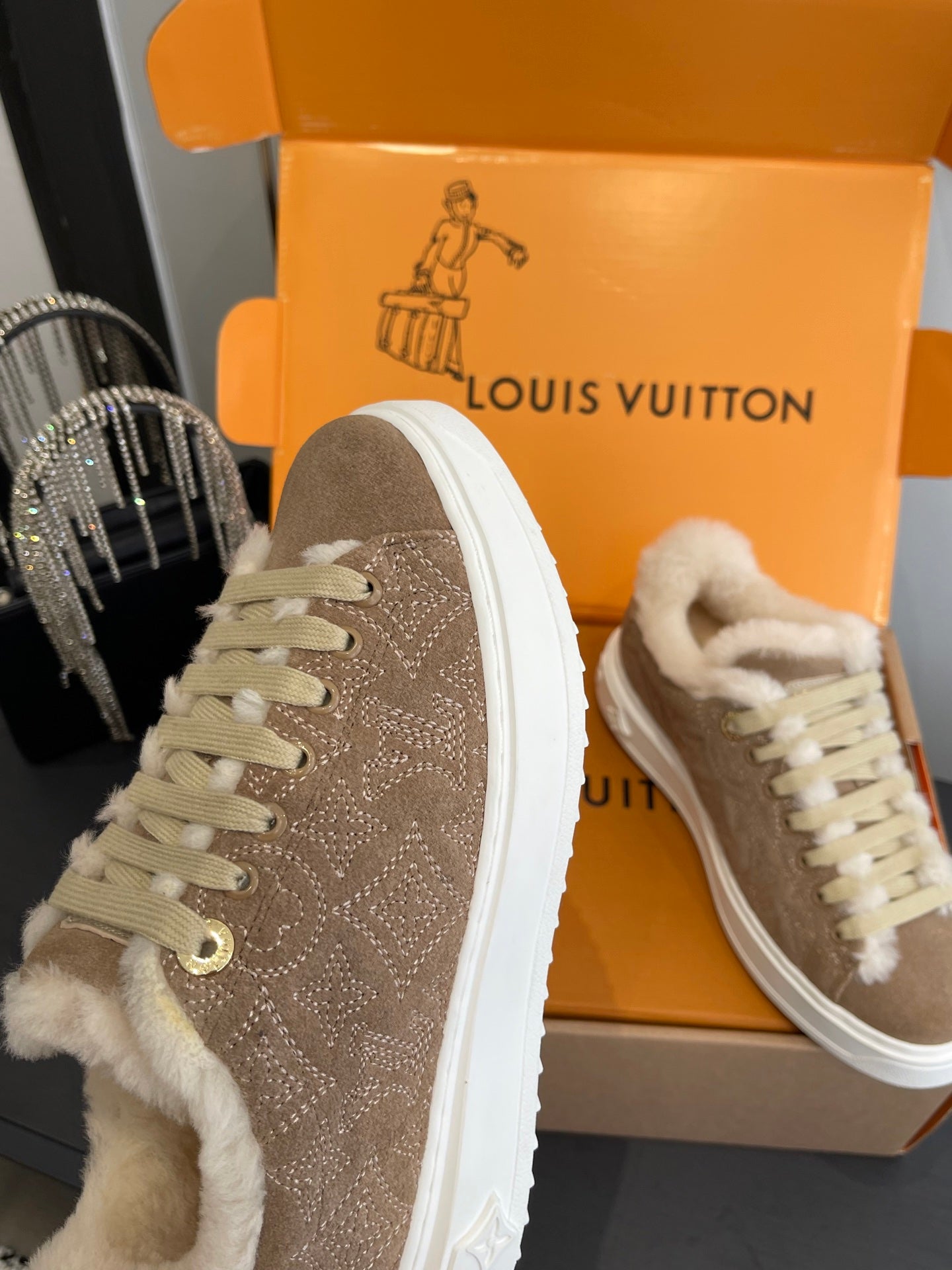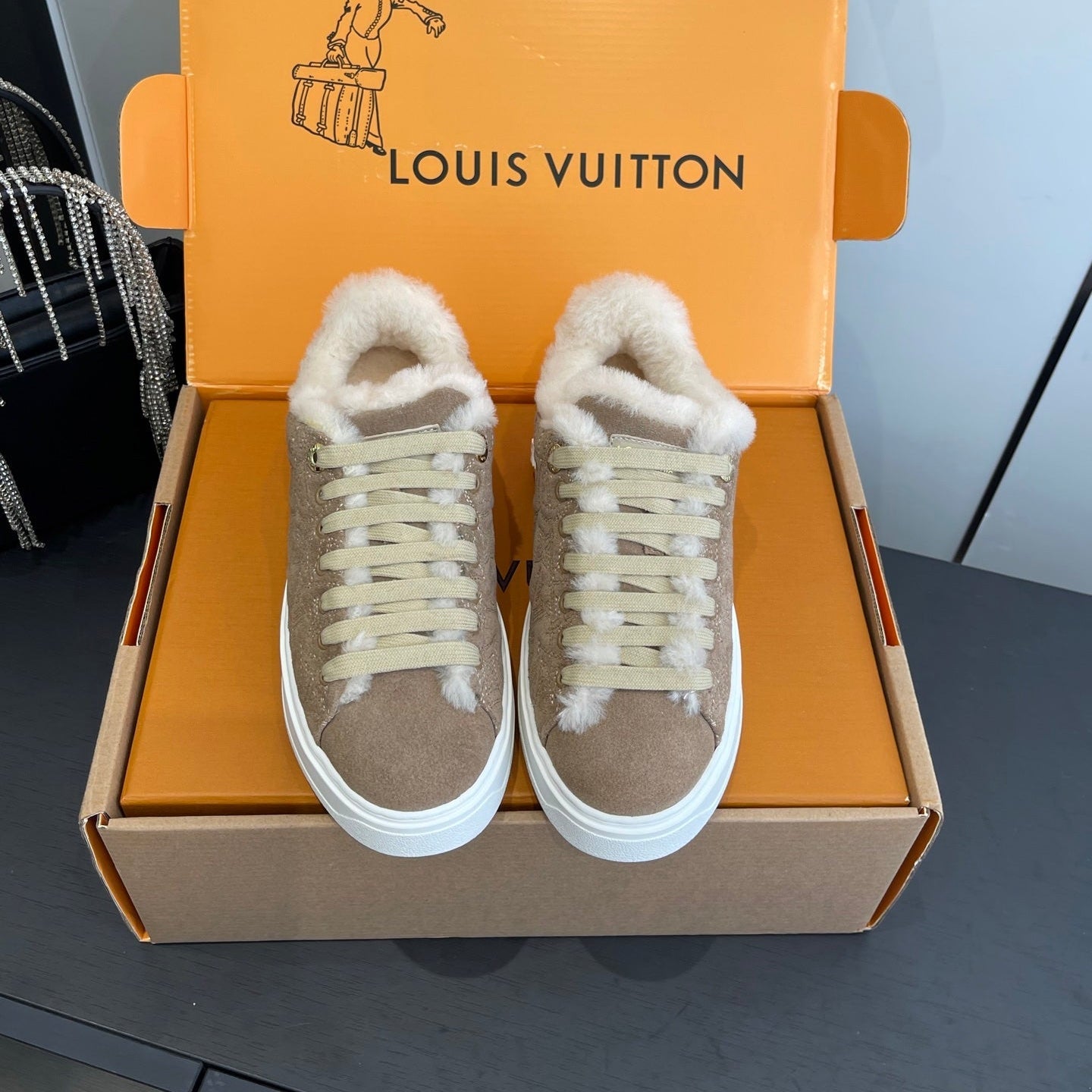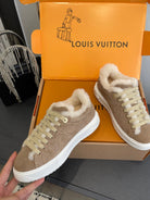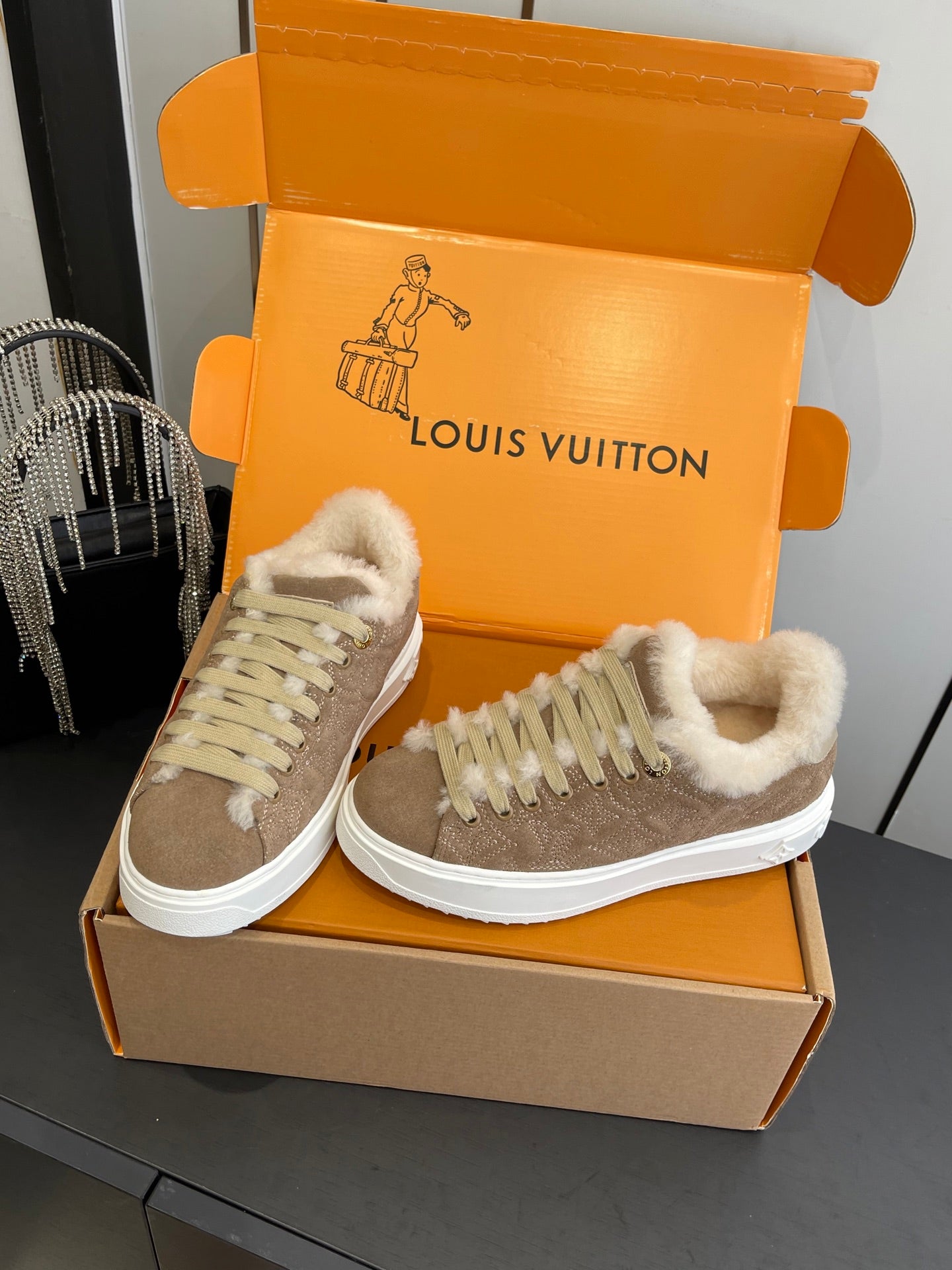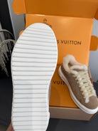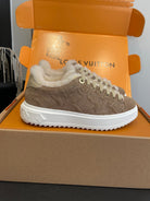 LV Time Out Sneaker 40mm Brown Cream Monogram Denim Suede Fleece Lined 533476