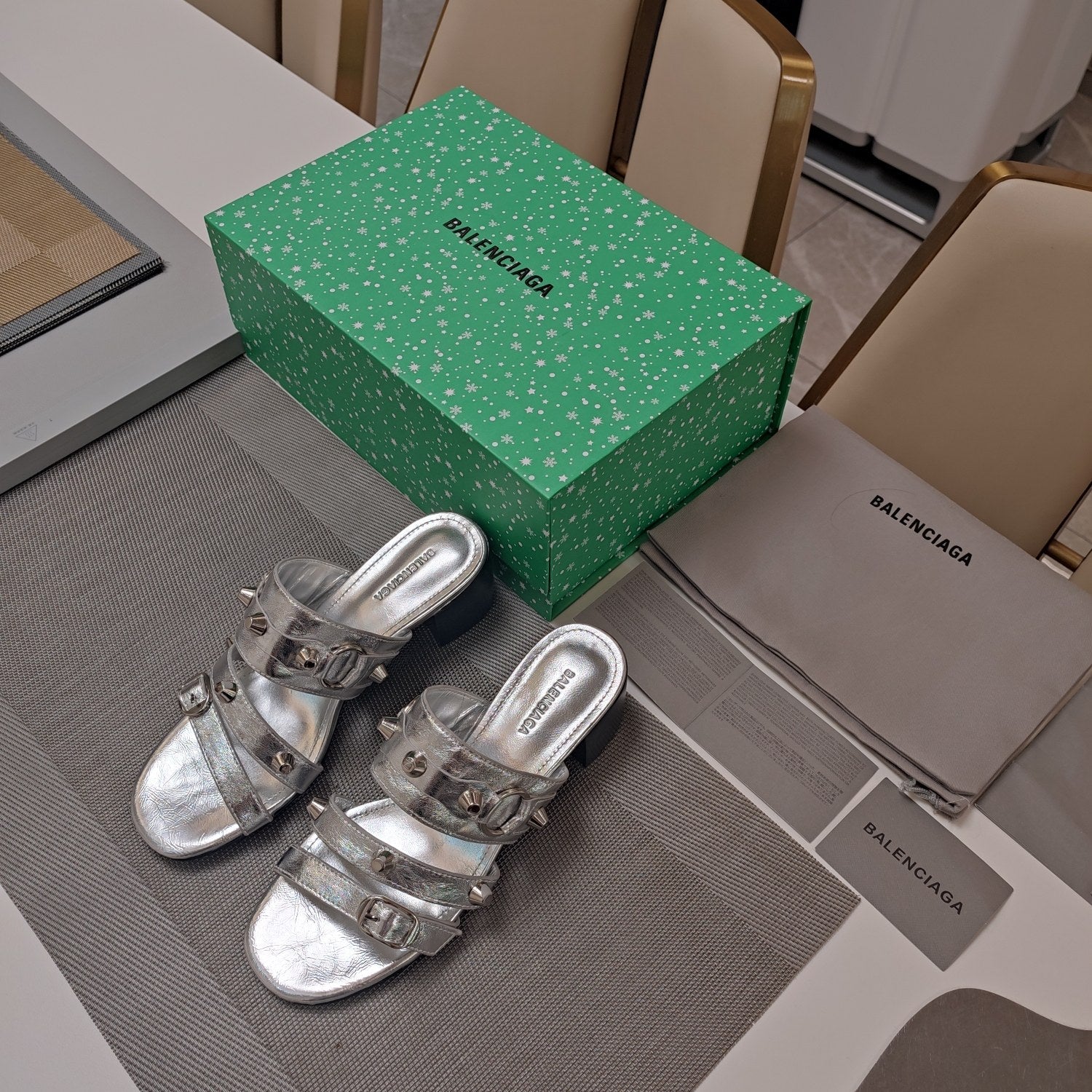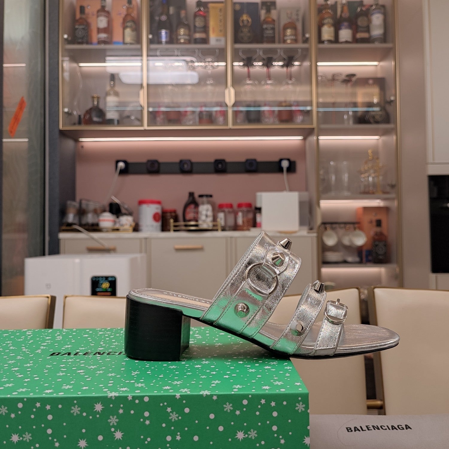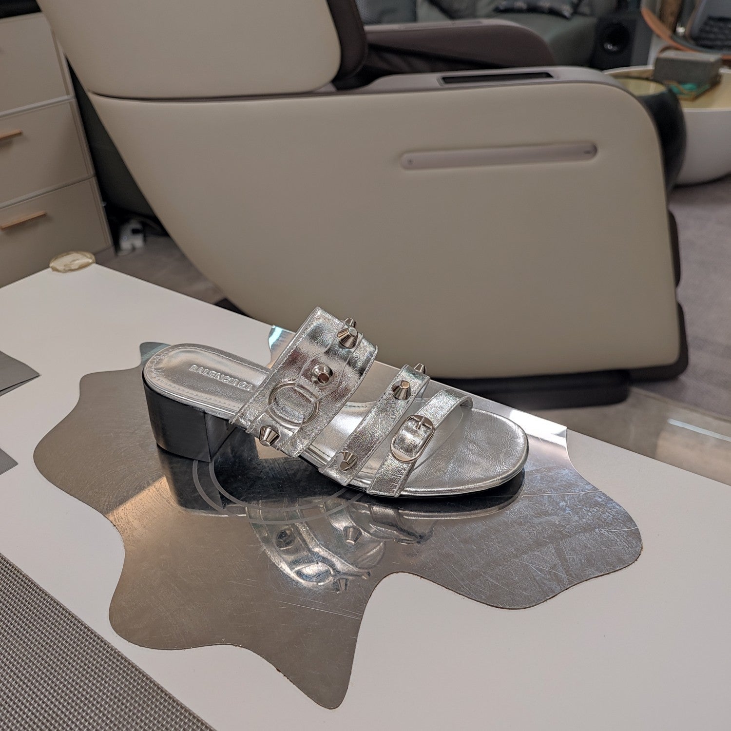STRAPPY MEDIUM HEELED SANDALS IN SILVER STUDDED WAX-OIL SHEEPSKIN