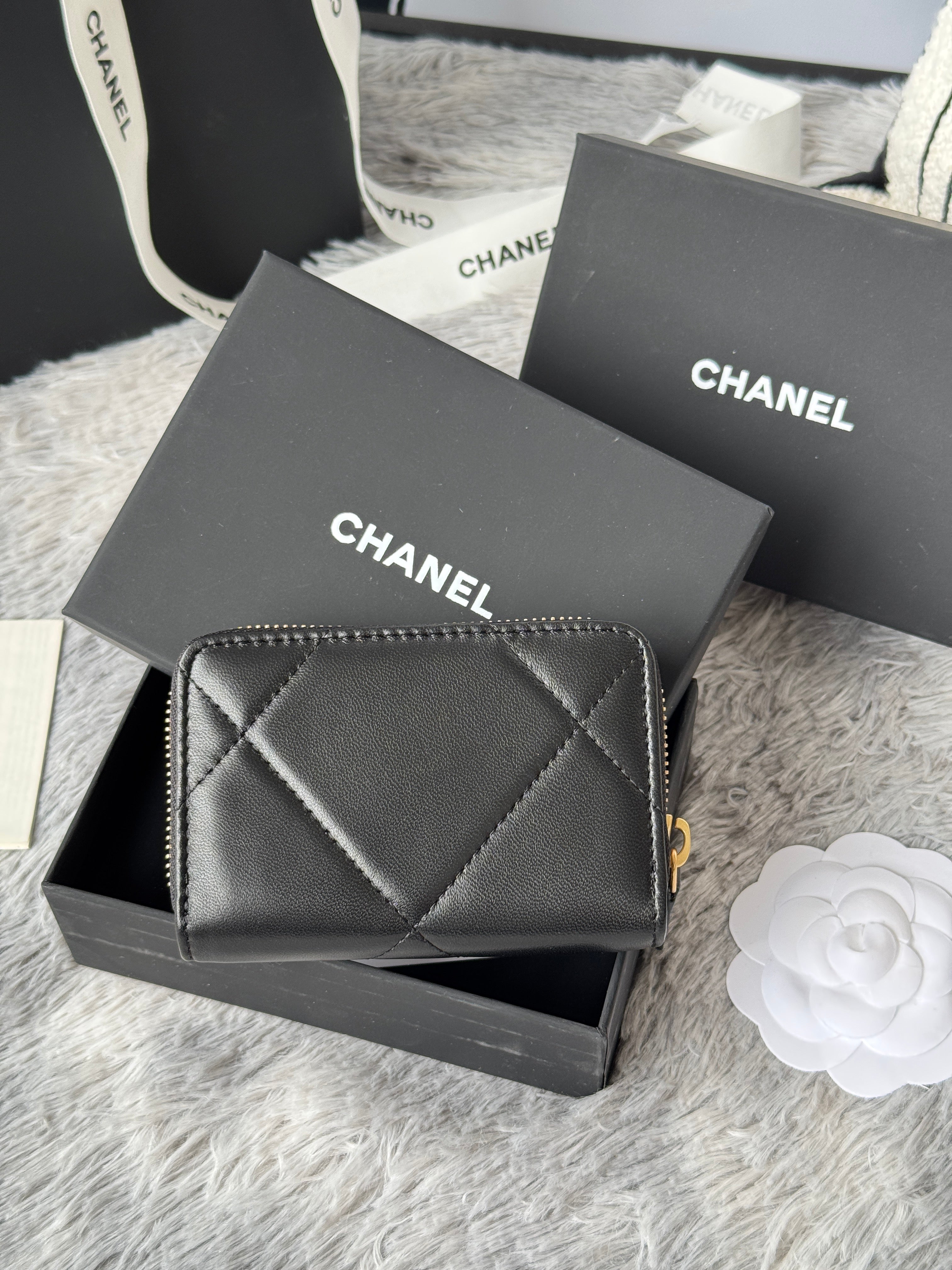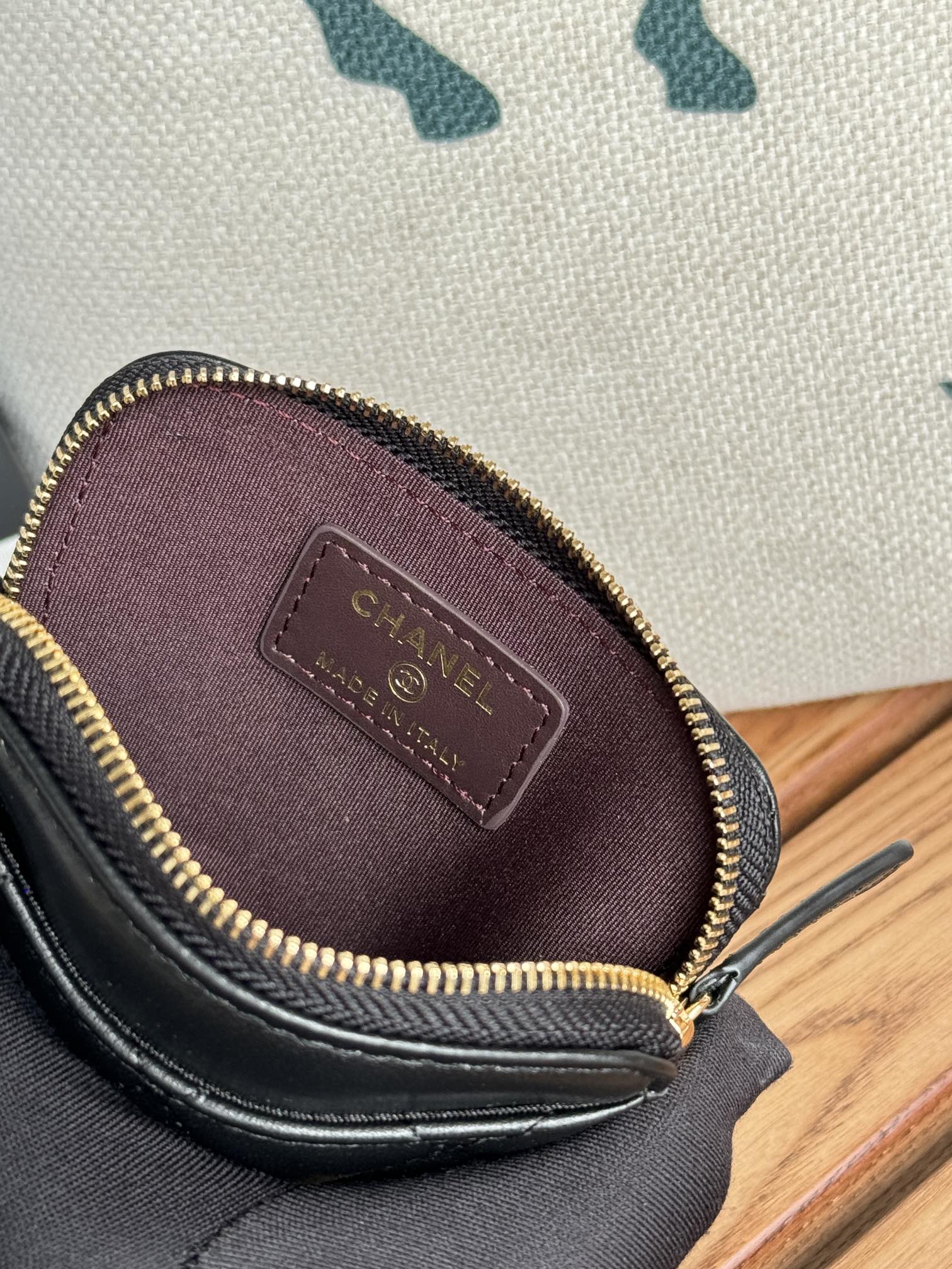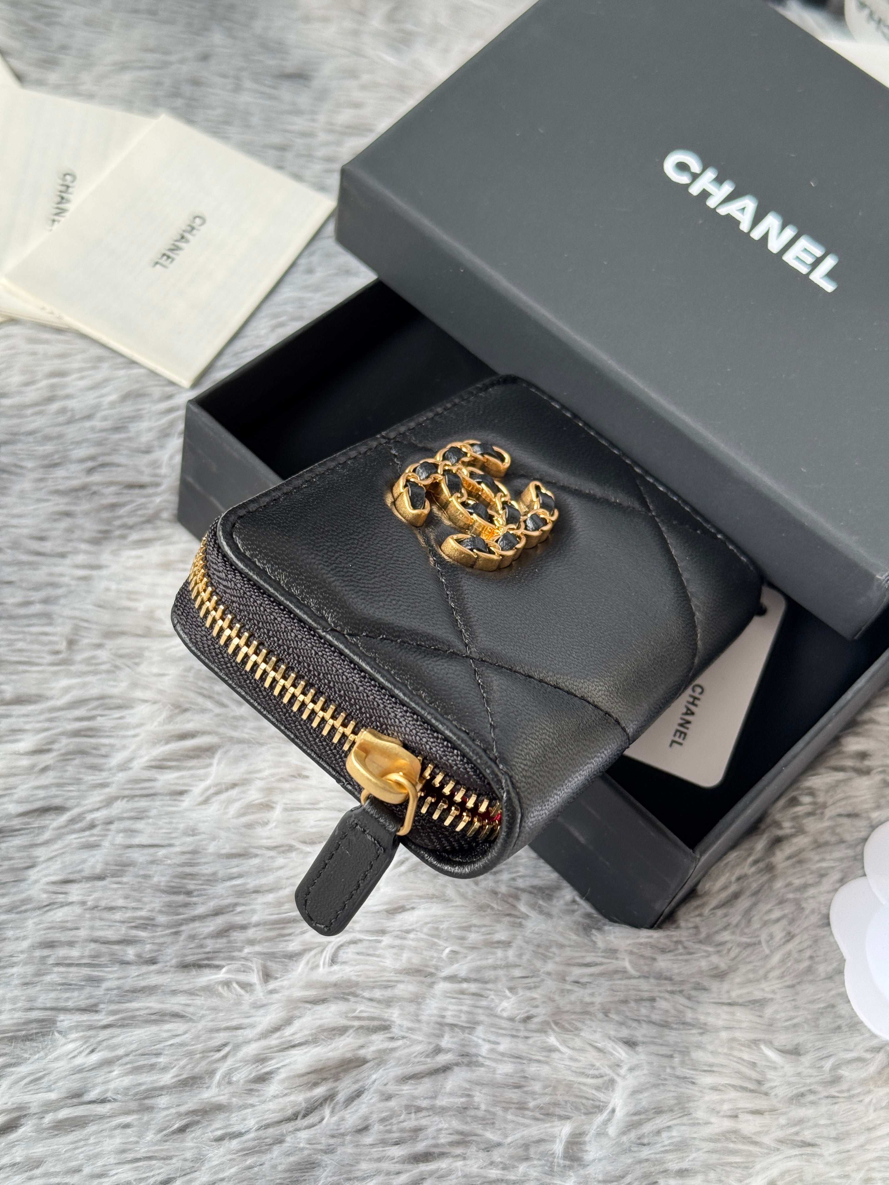 CC 19 Quilted Zipper Coin Purse Black Gold-Tone Sheepskin 242800