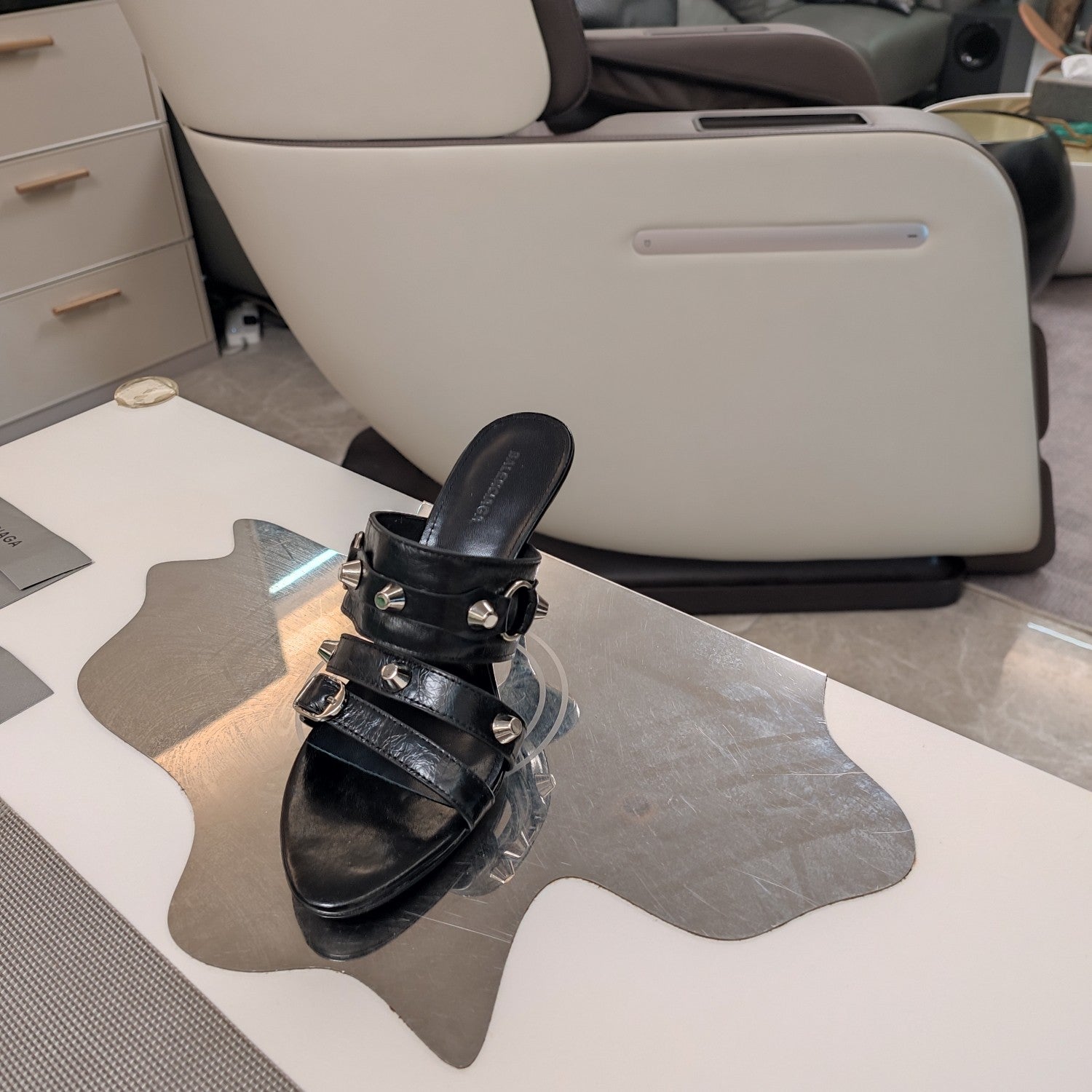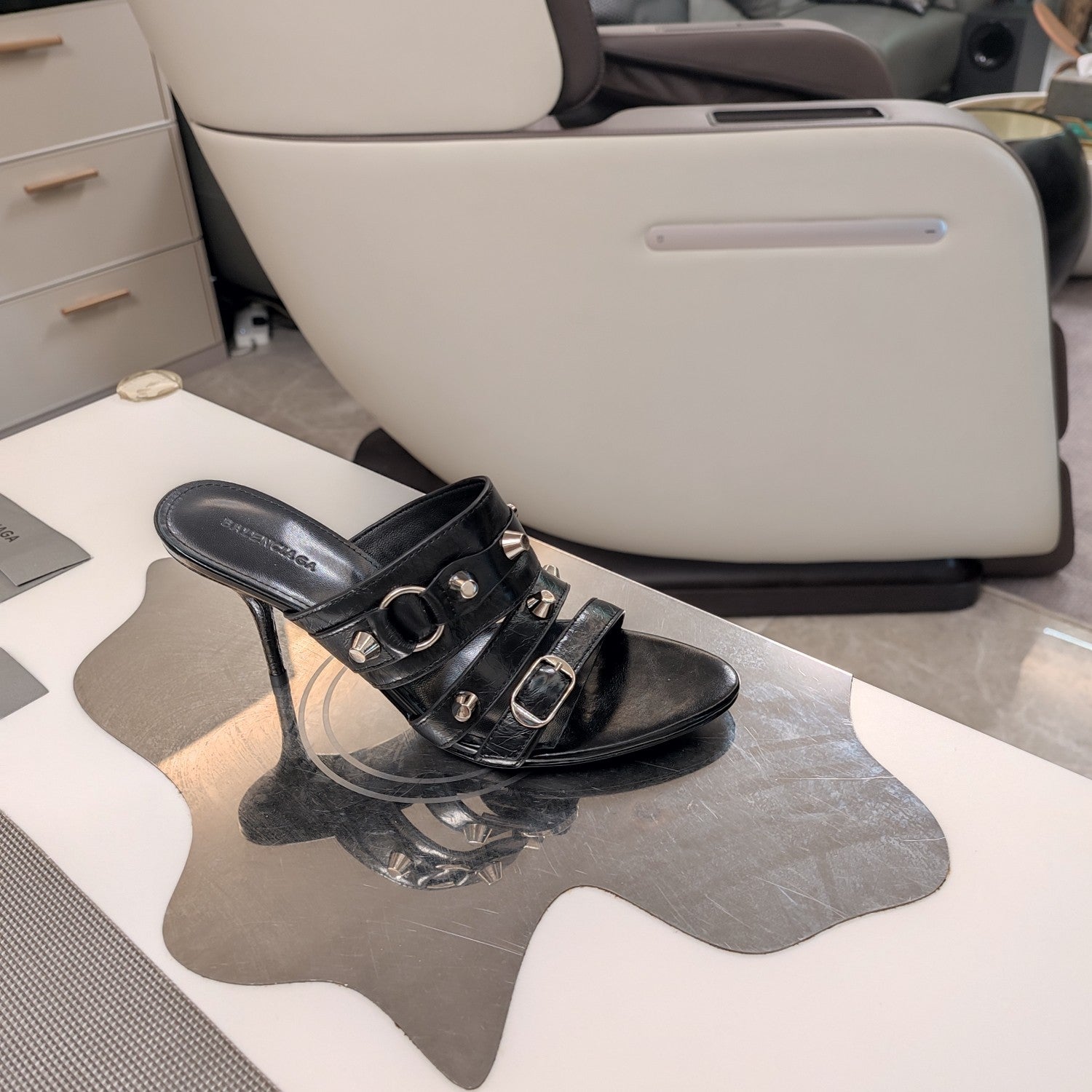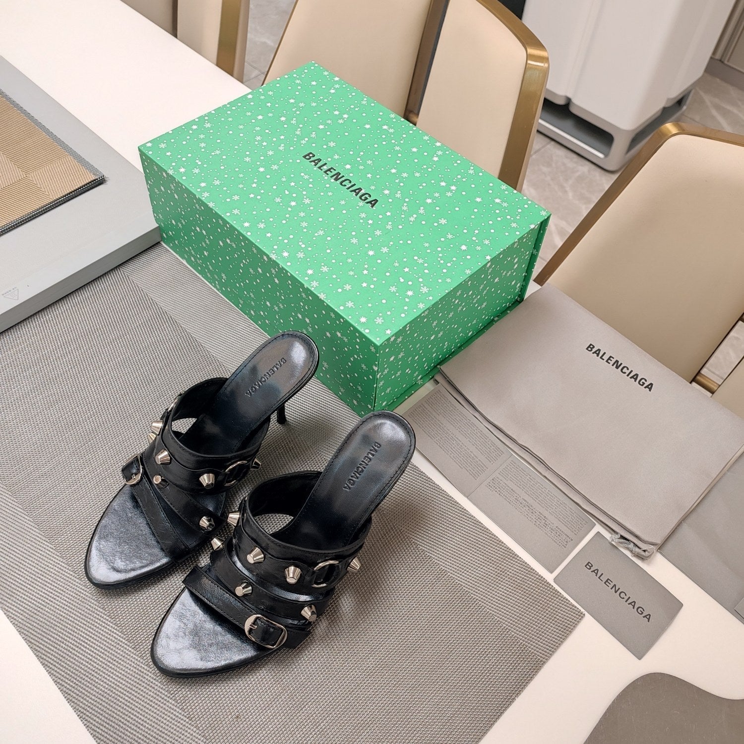 STRAPPY HIGH-HEELED SANDALS IN BLACK STUDDED WAX-OIL SHEEPSKIN