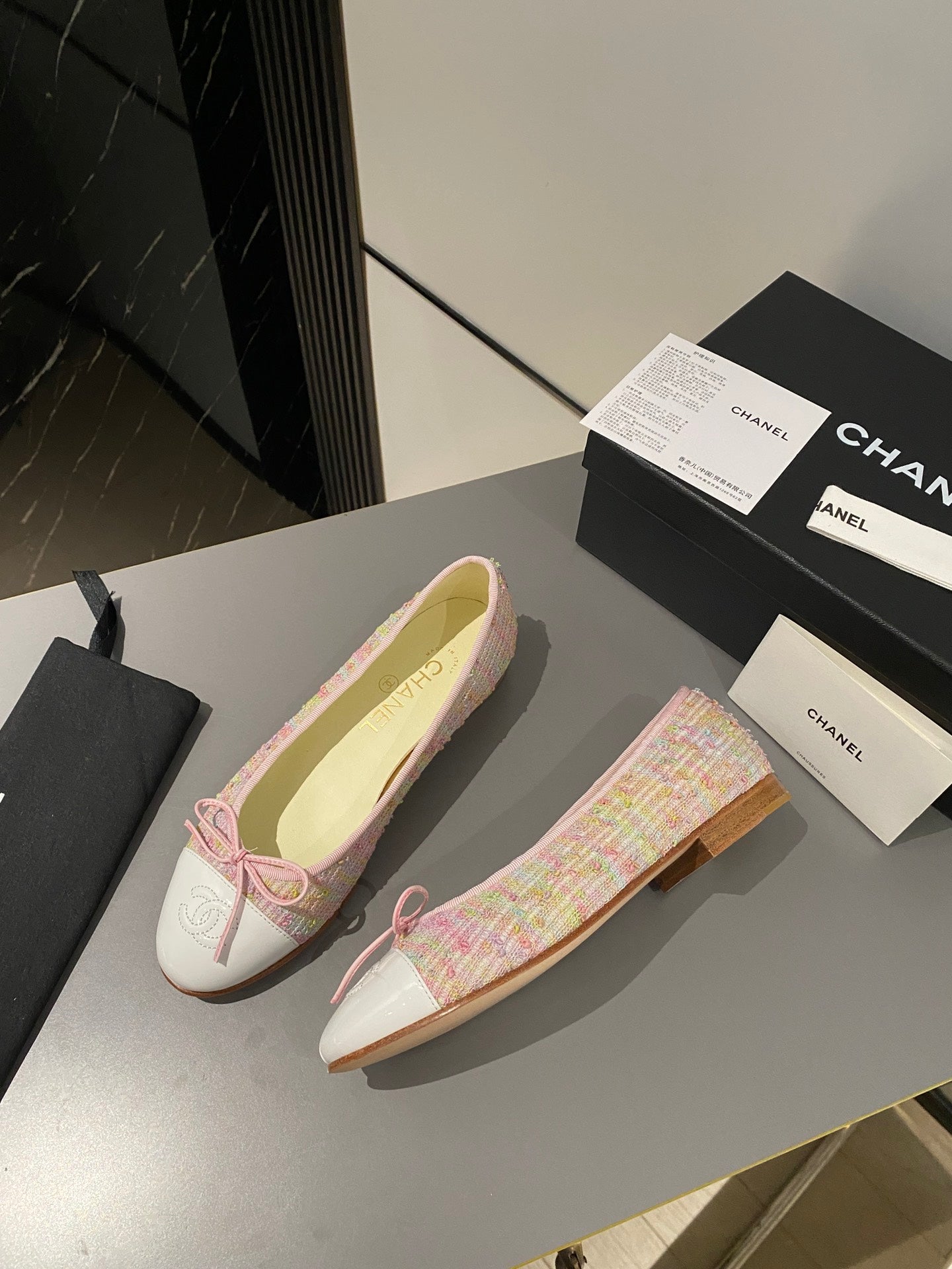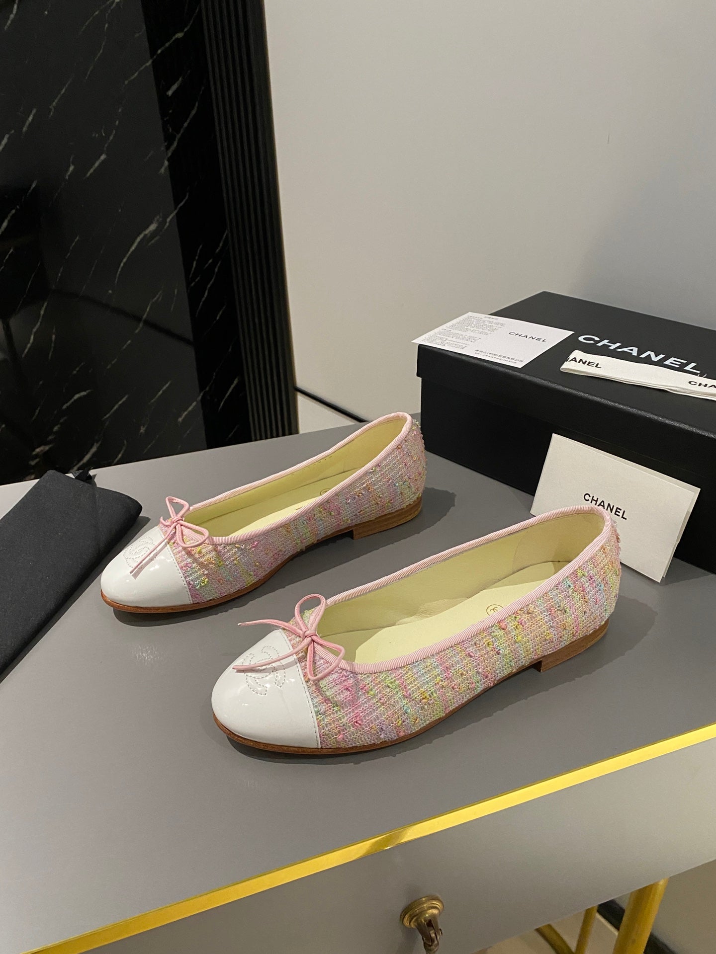 ballet flat pink yellow green tweed white calfskin