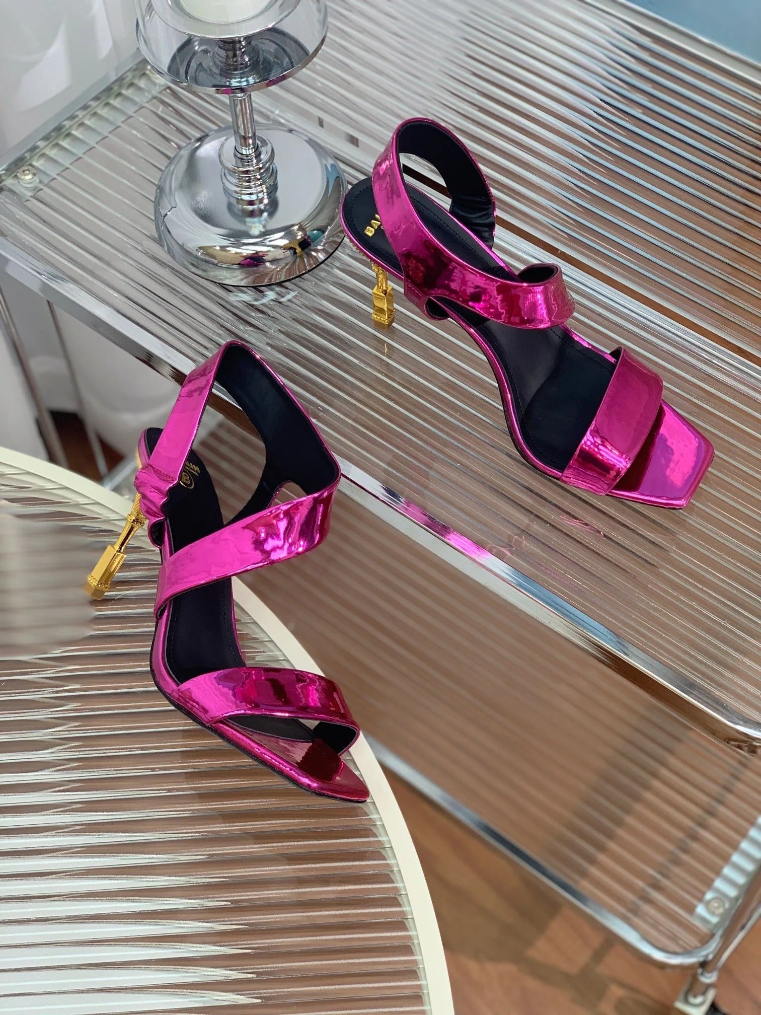 BALMAIN 25S HIGH HEEL SANDALS 95MM IN MAGENTA GLOSSY CALFSKIN