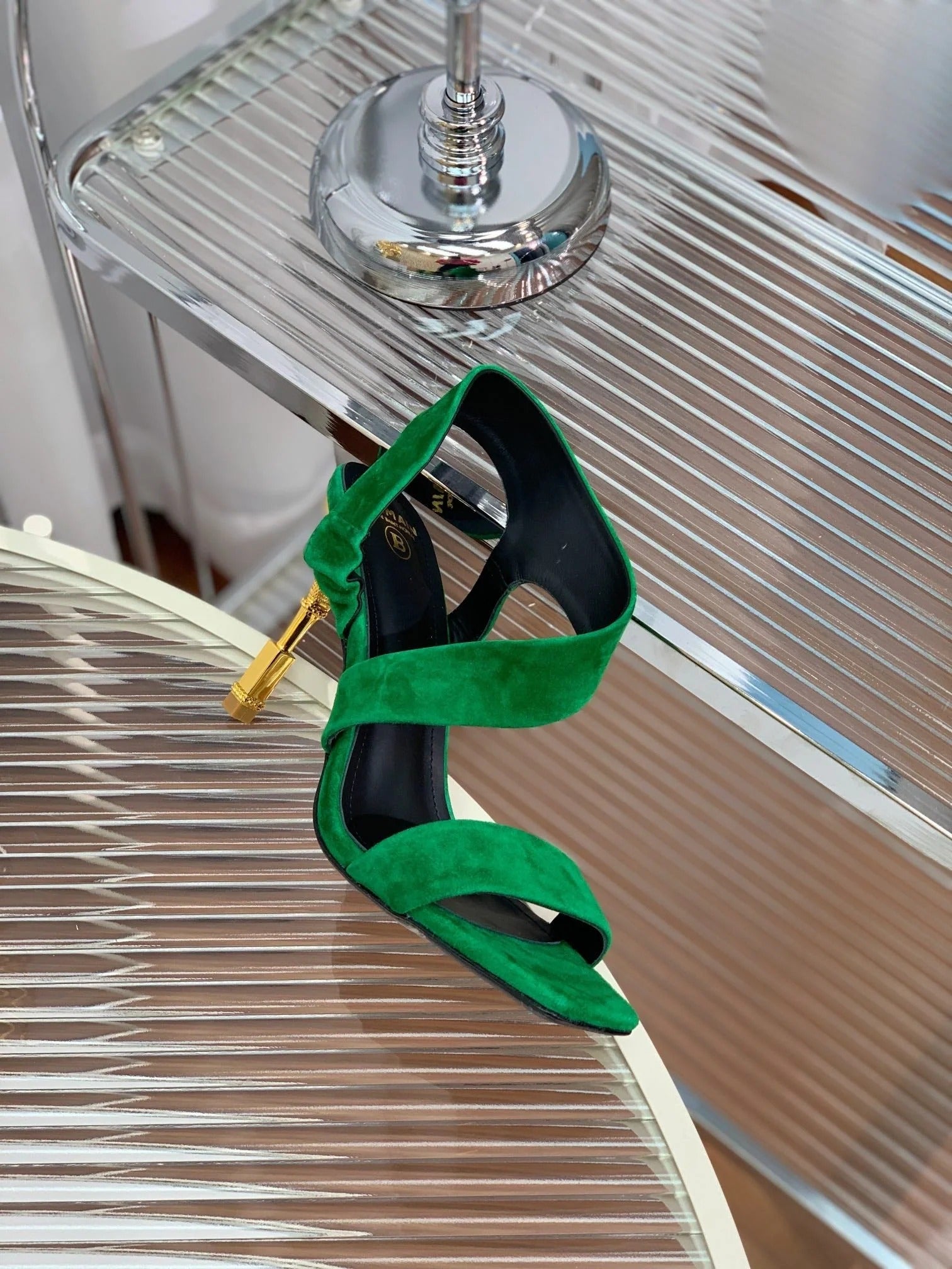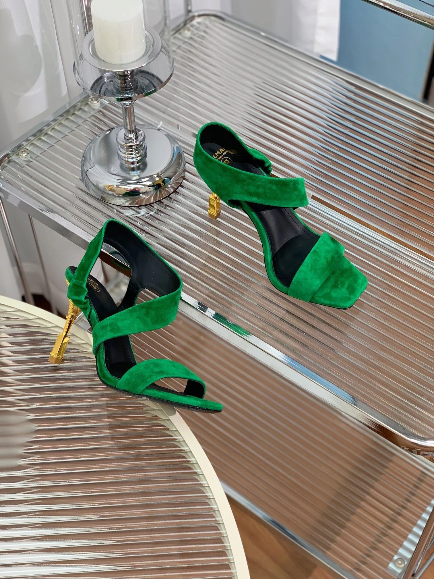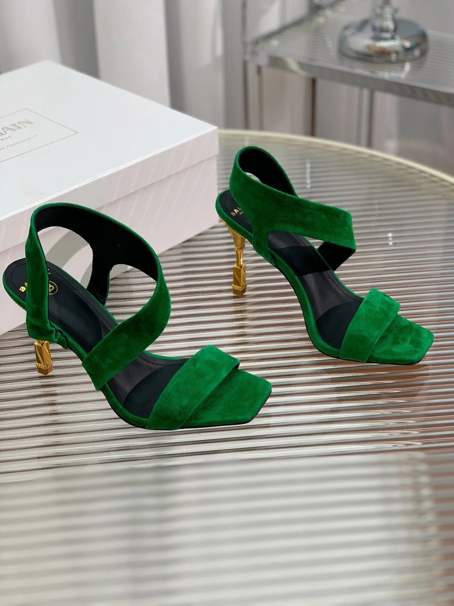 BALMAIN 25S HIGH HEEL SANDALS 95MM IN DARK GREEN SUEDE