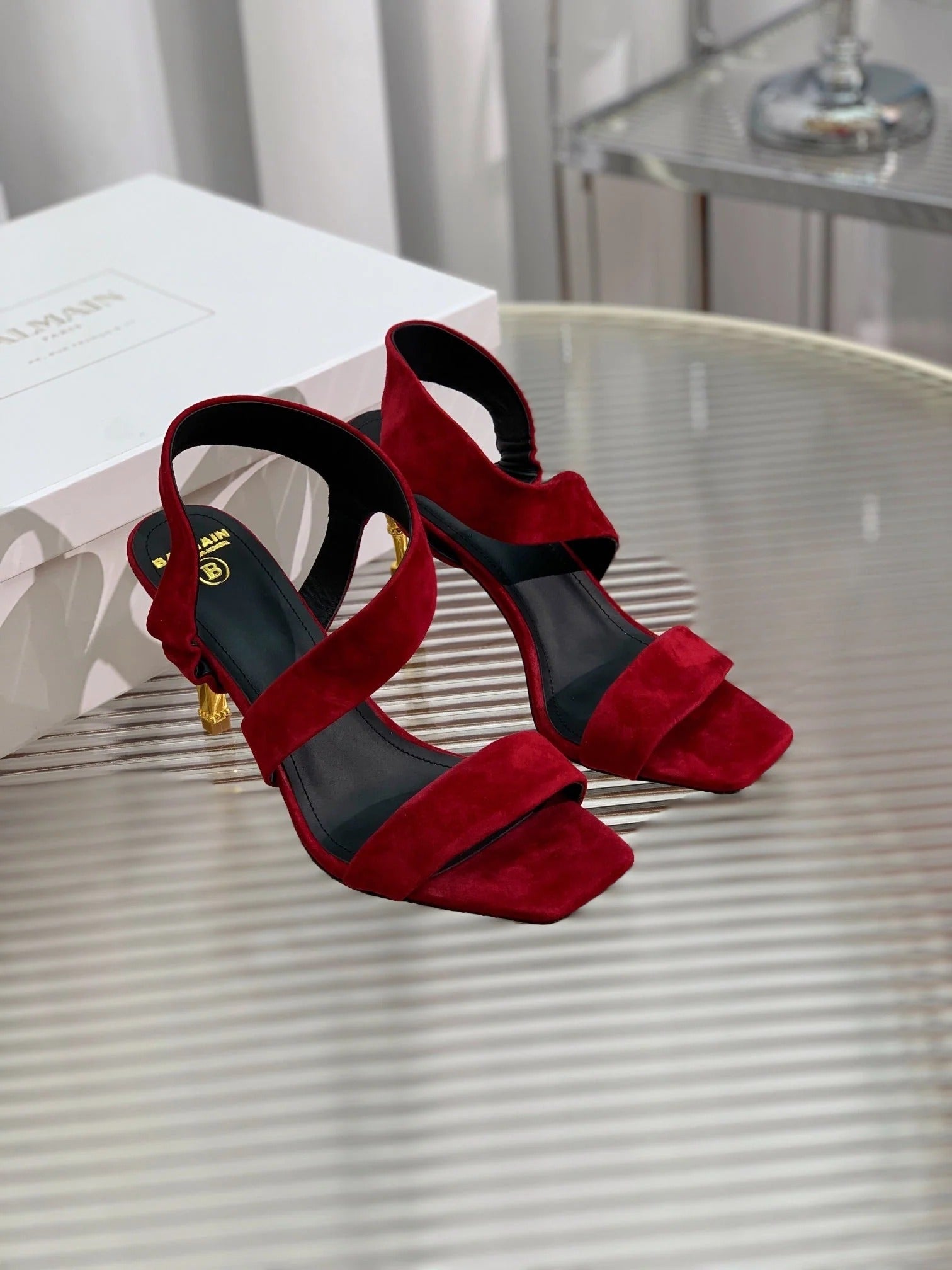 BALMAIN 25S HIGH HEEL SANDALS 95MM IN DARK CRIMSON SUEDE