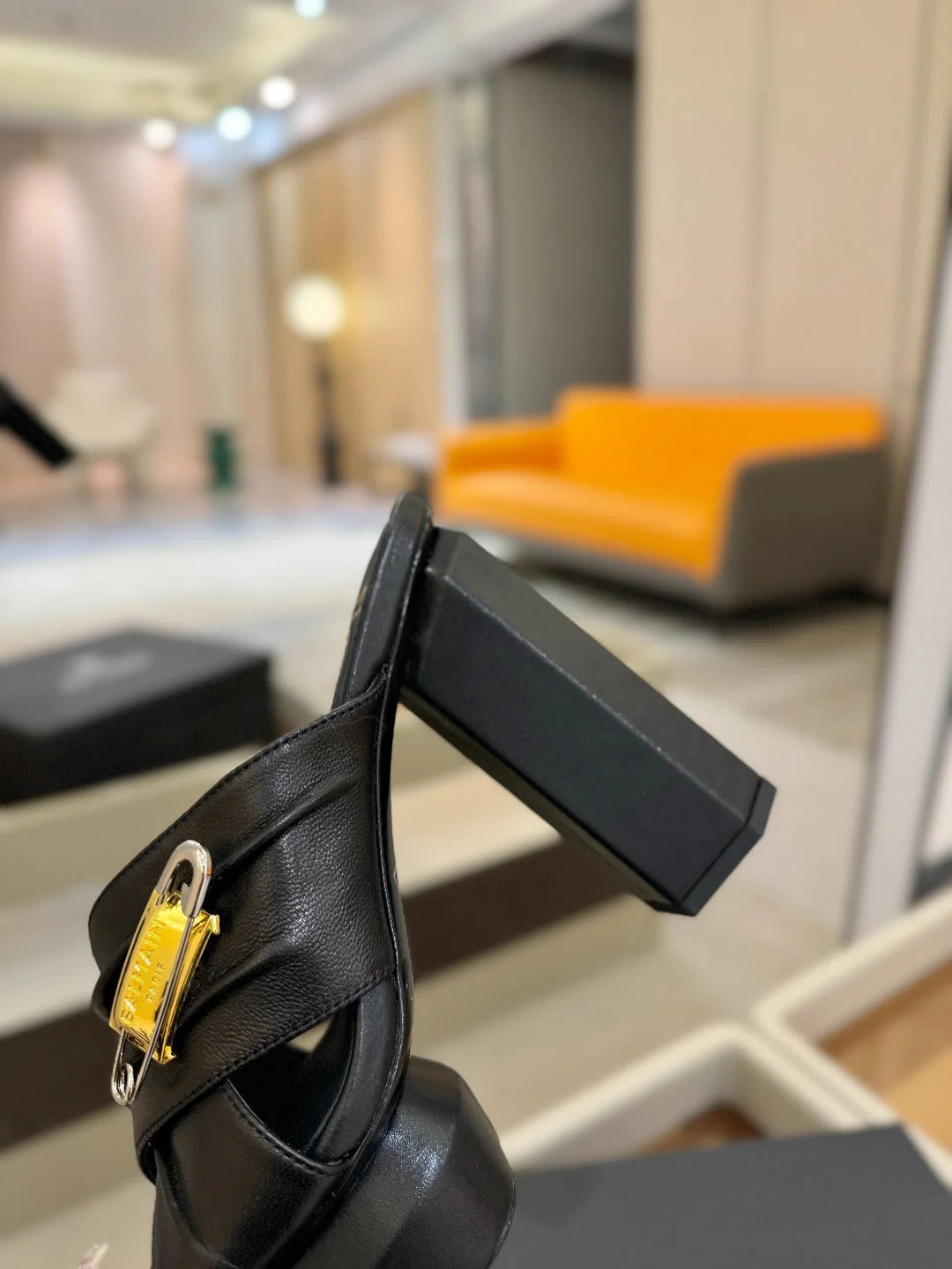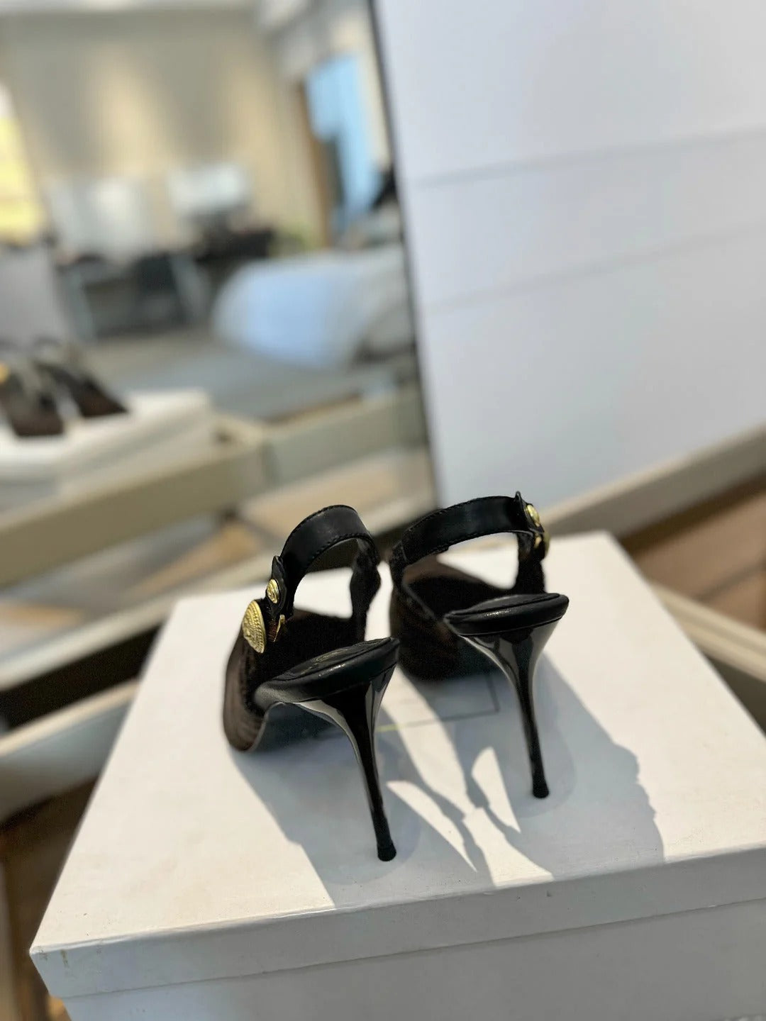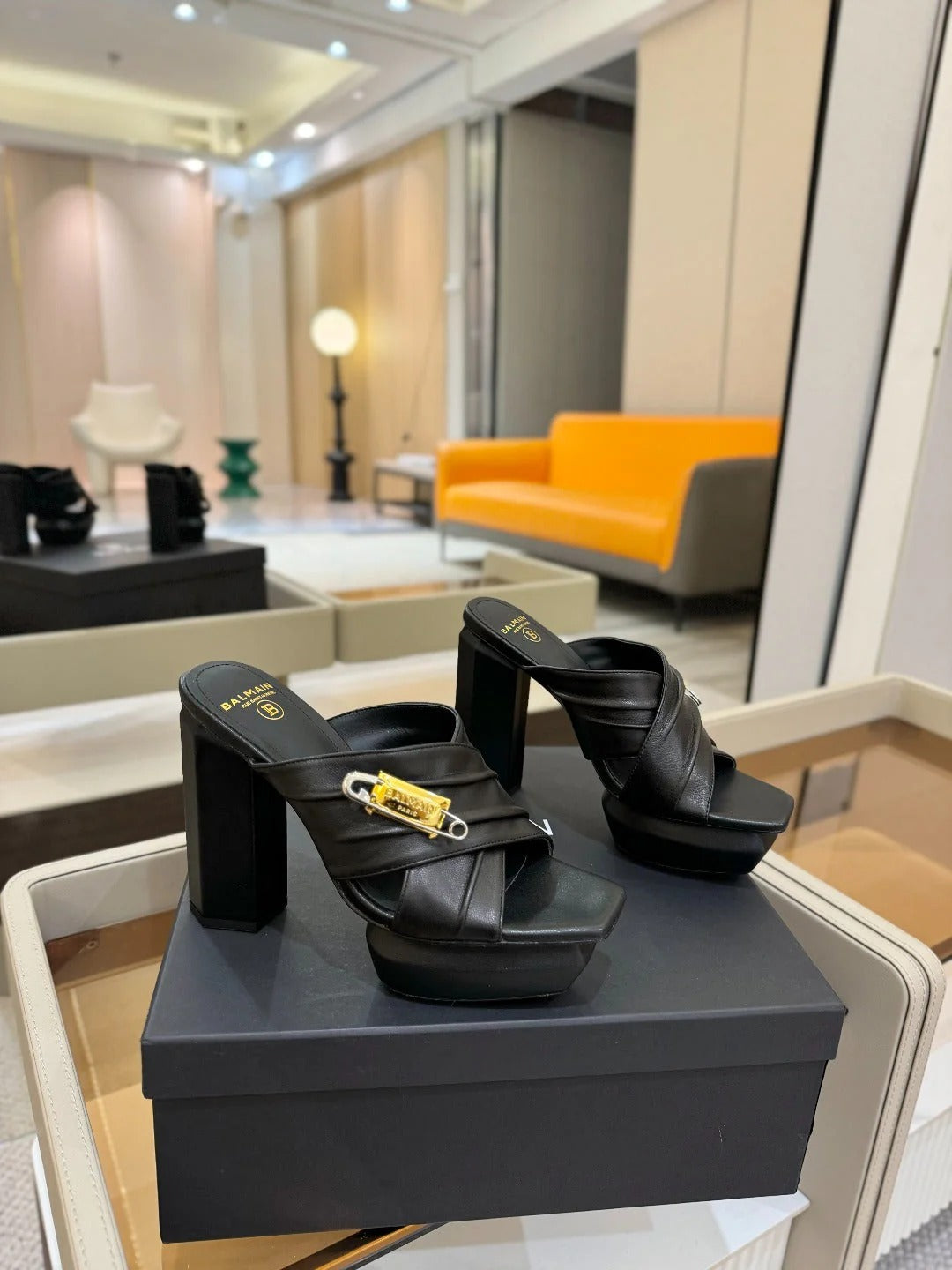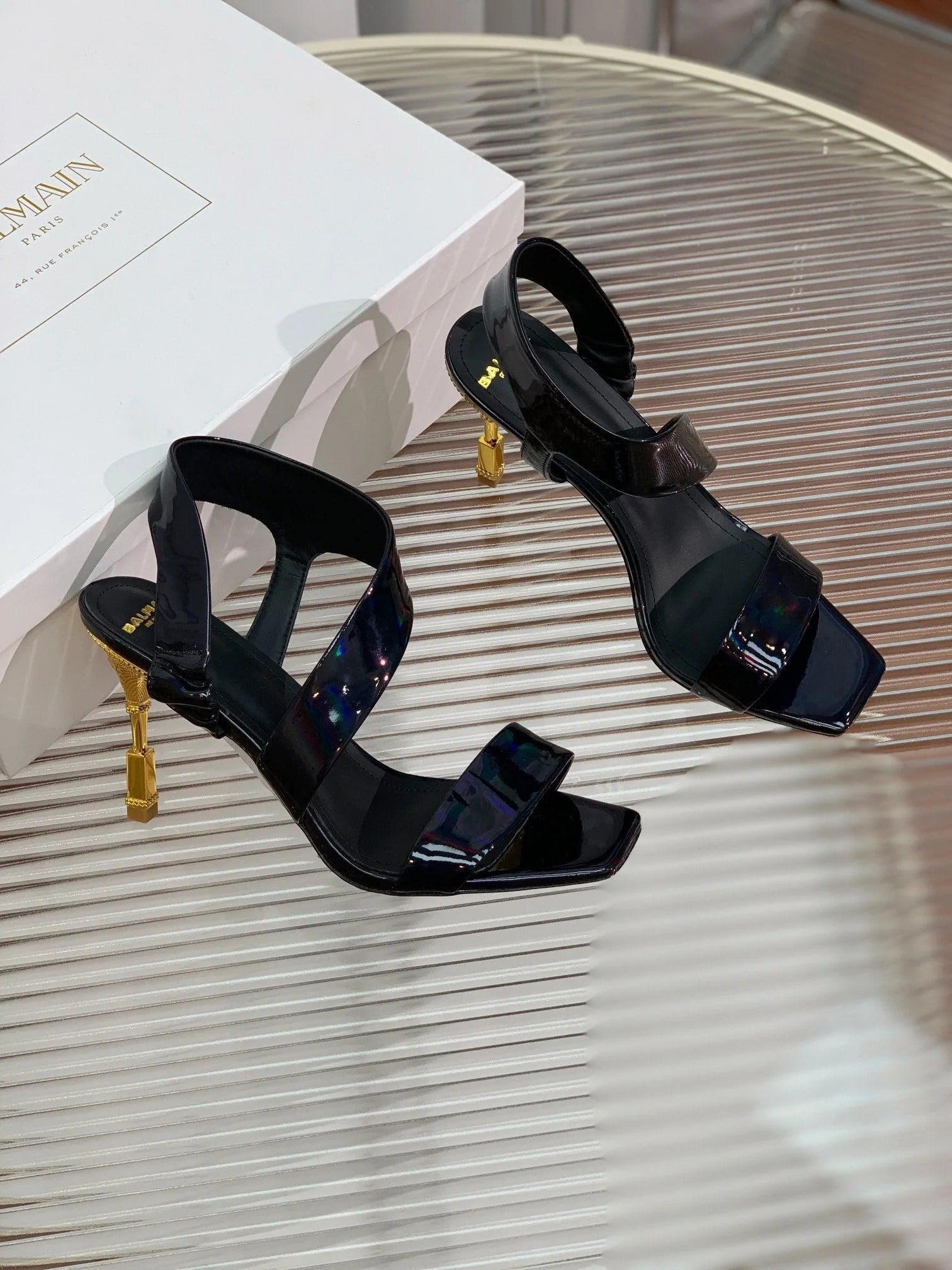BALMAIN 25S HIGH HEEL SANDALS 95MM IN BLACK GLOSSY CALFSKIN