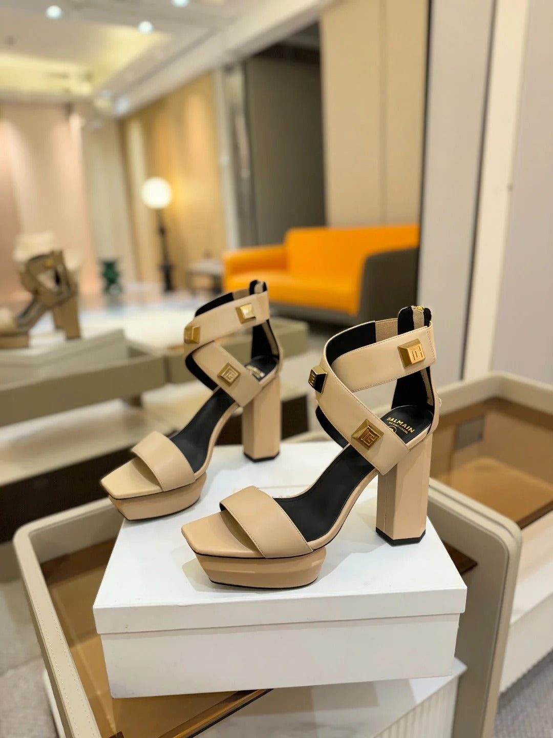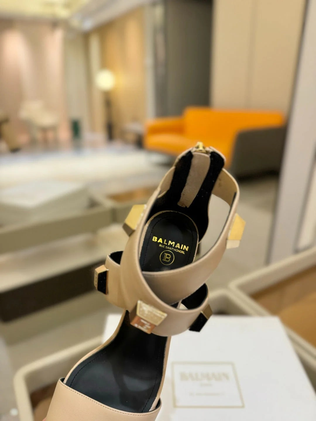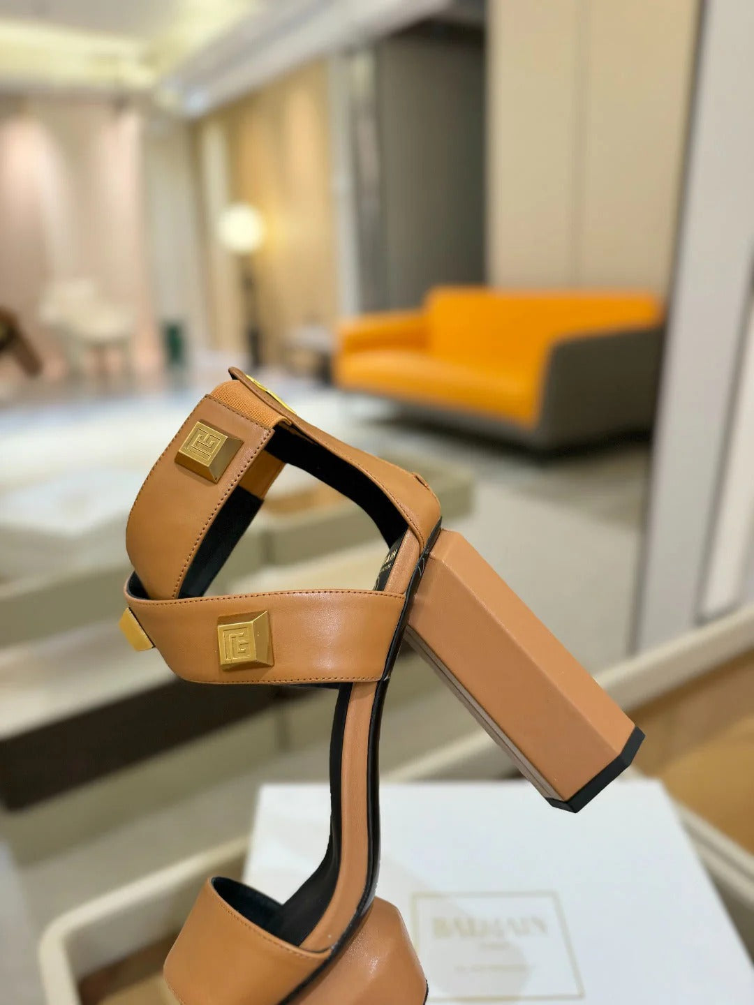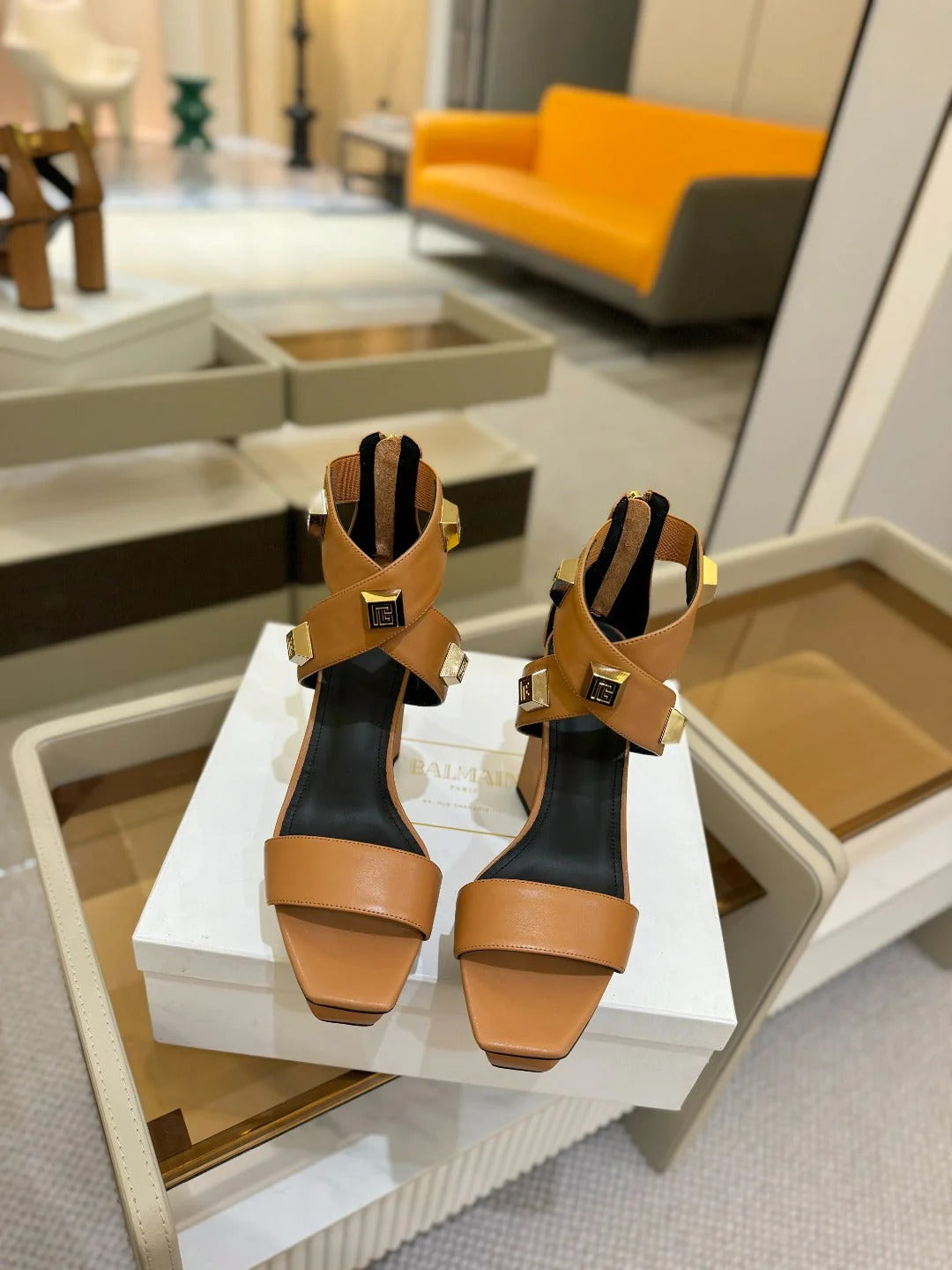 BALMAIN 25S HIGH HEEL SANDALS 95MM IN BURNT ORANGE GLOSSY CALFSKIN