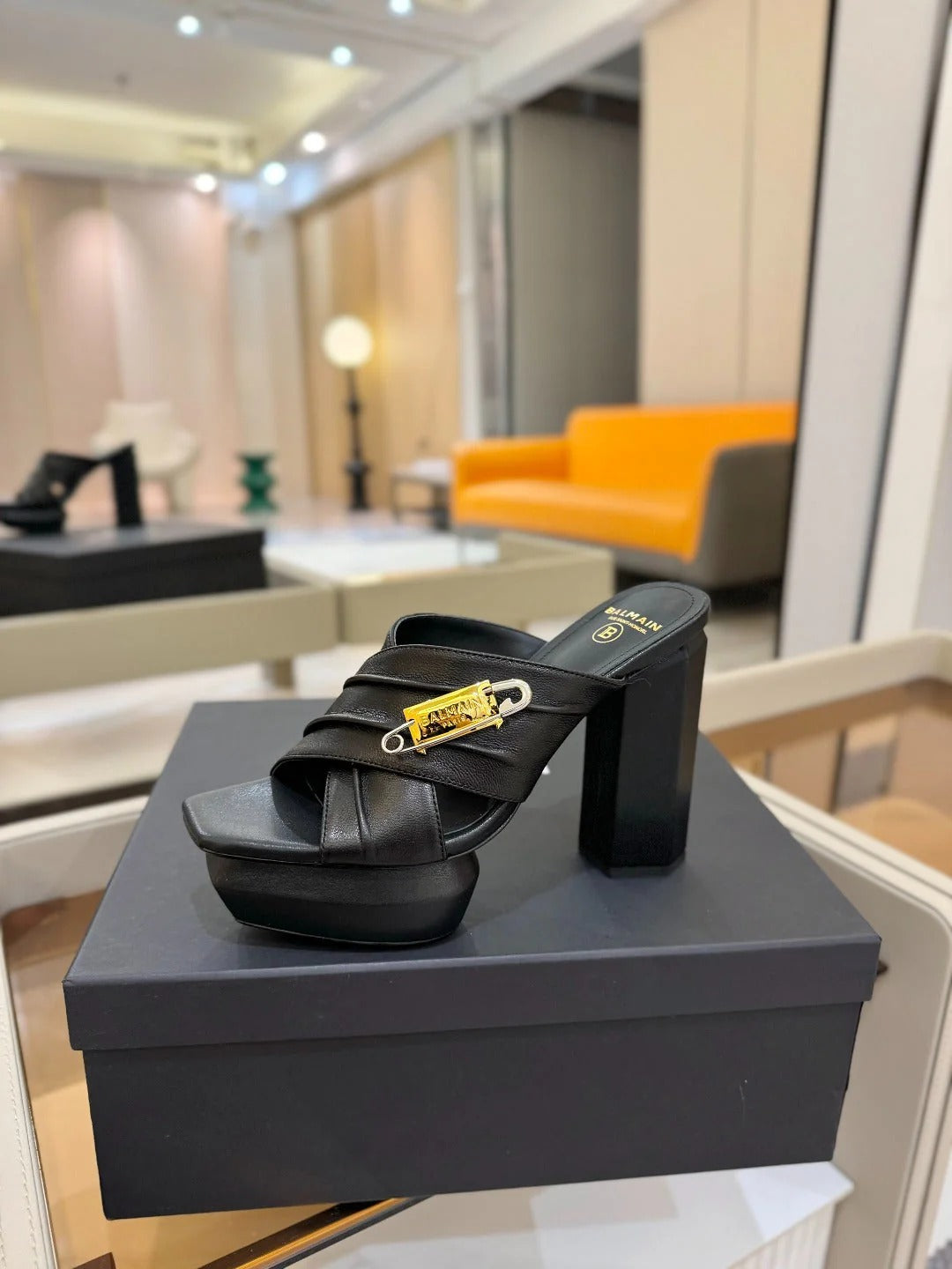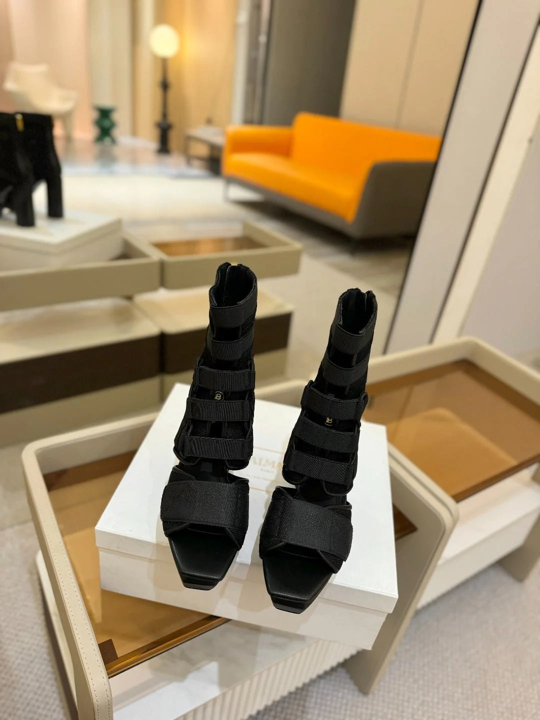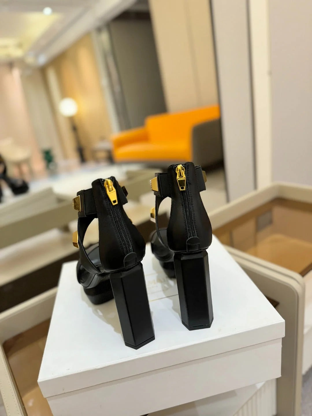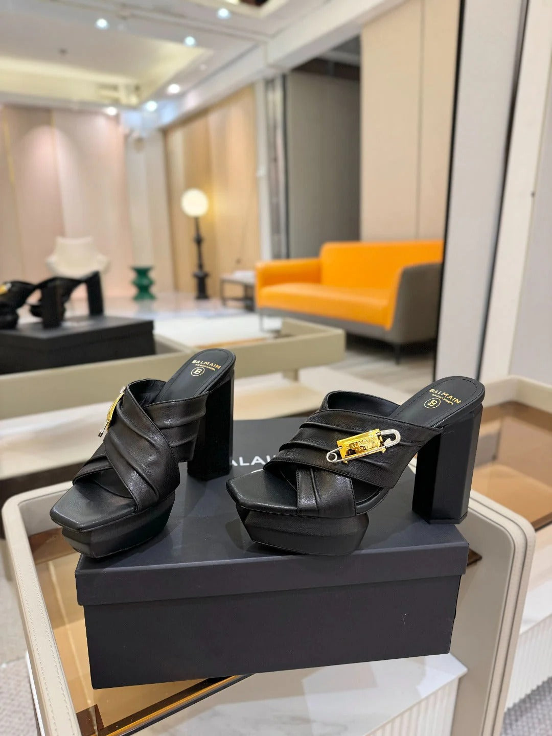 BALMAIN 25S HIGH HEEL SANDALS 95MM IN BURNT ORANGE GLOSSY CALFSKIN