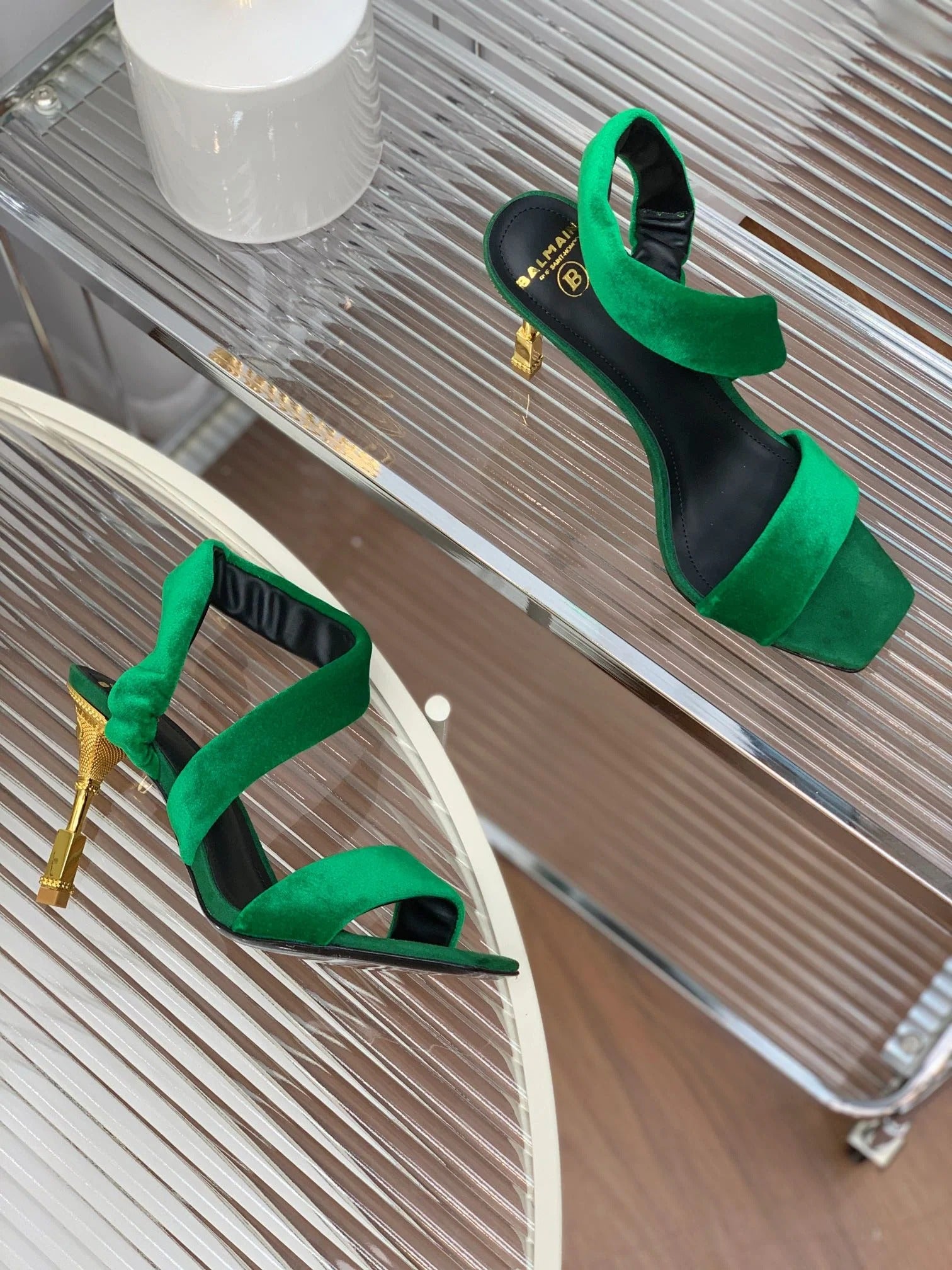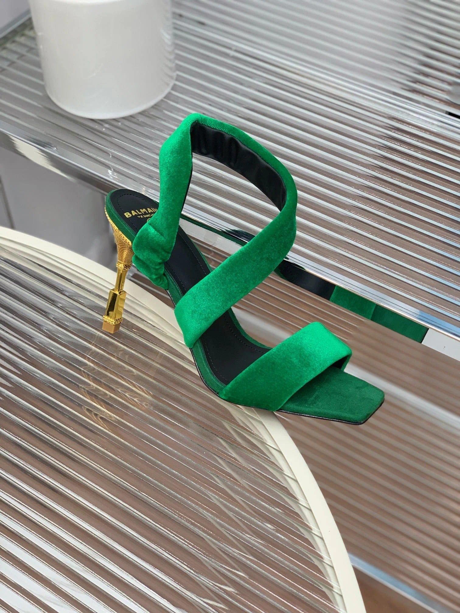 BALMAIN 25S MONETA HEELED SANDALS 95MM IN DARK GREEN VELVET