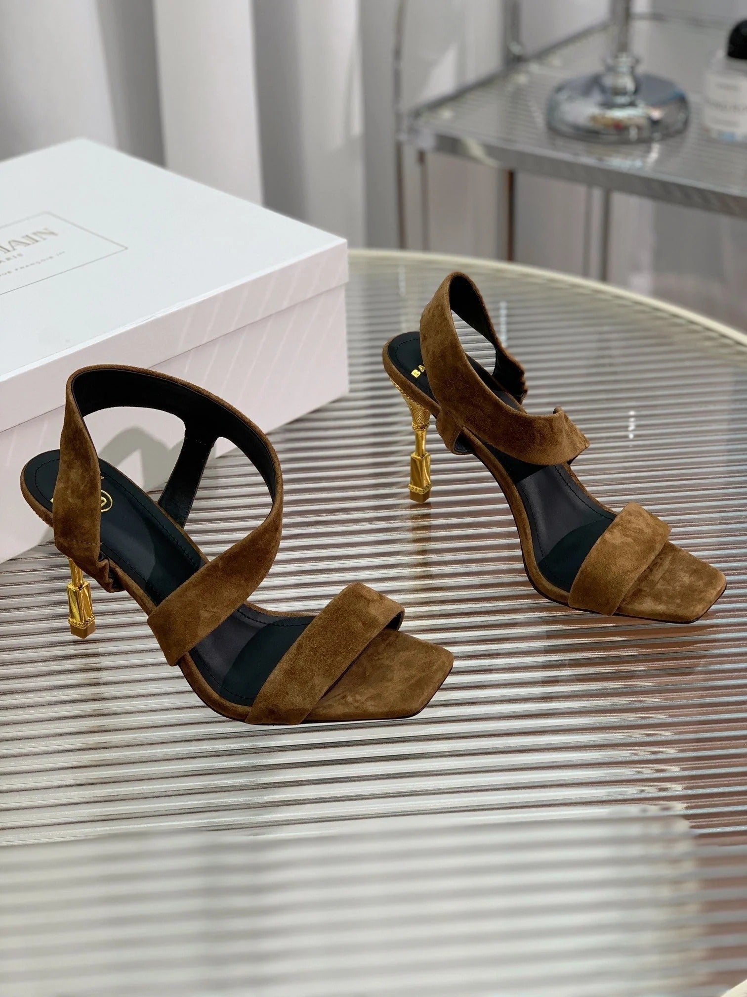 BALMAIN 25S HIGH HEEL SANDALS 95MM IN BROWN SUEDE
