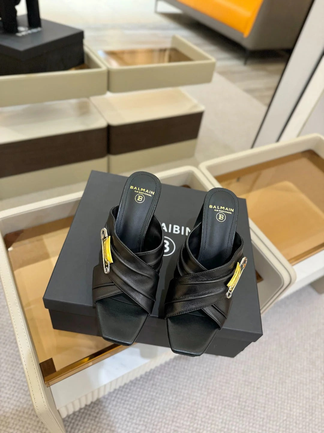 BALMAIN 25S BALMAIN MULES IN BLACK AND WHITE CALFSKIN