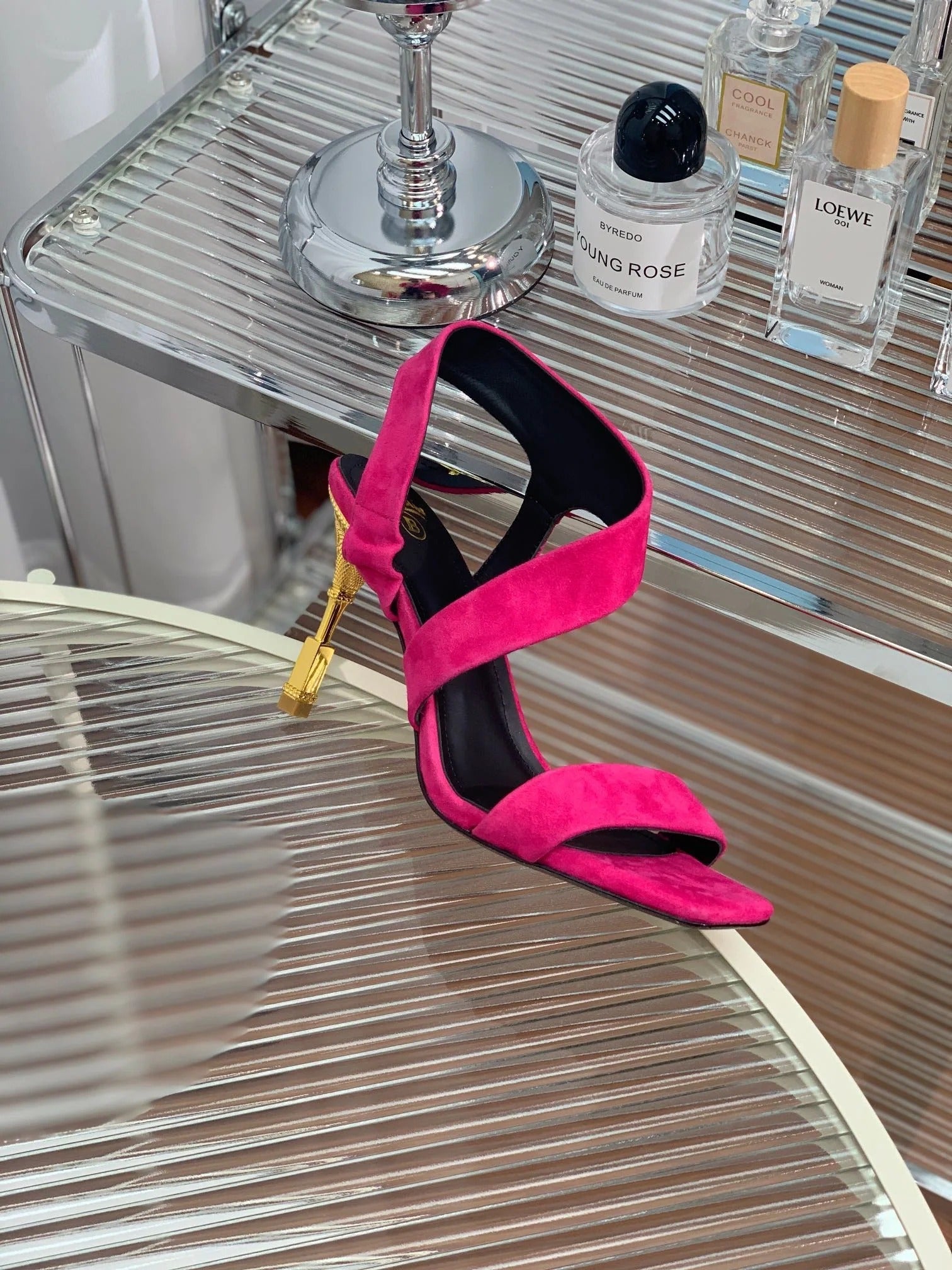BALMAIN 25S HIGH HEEL SANDALS 95MM IN FUCHSIA SUEDE