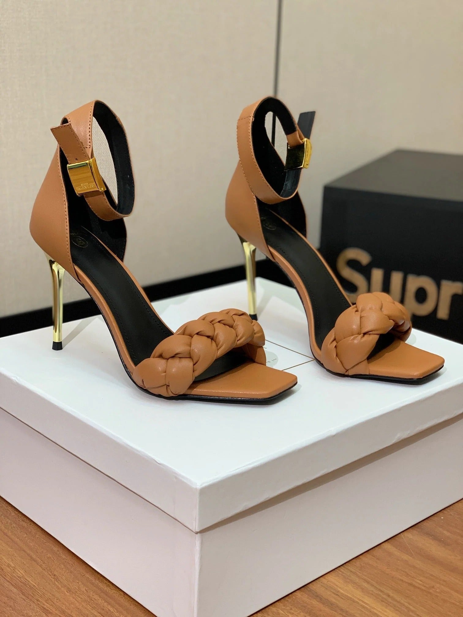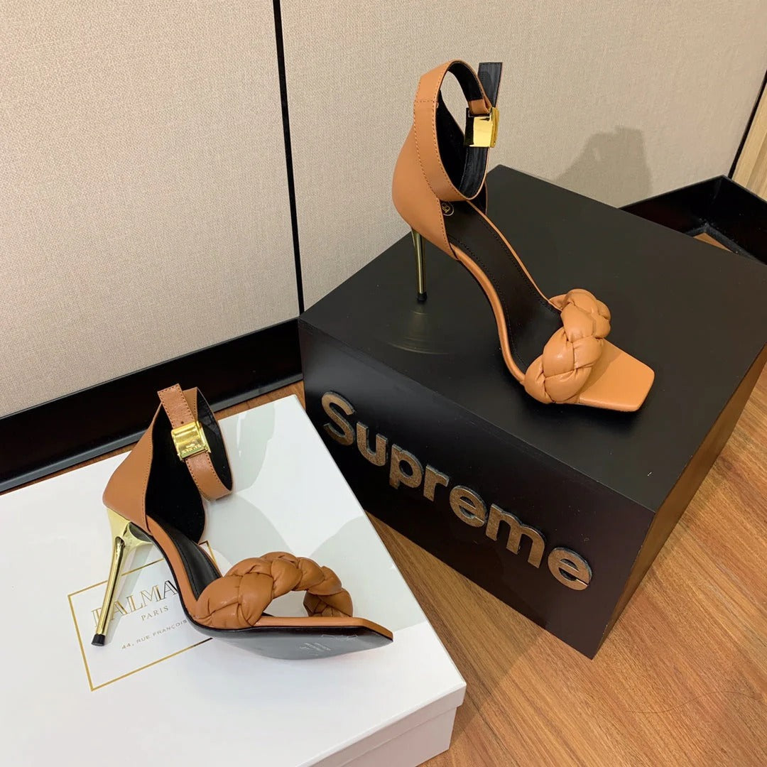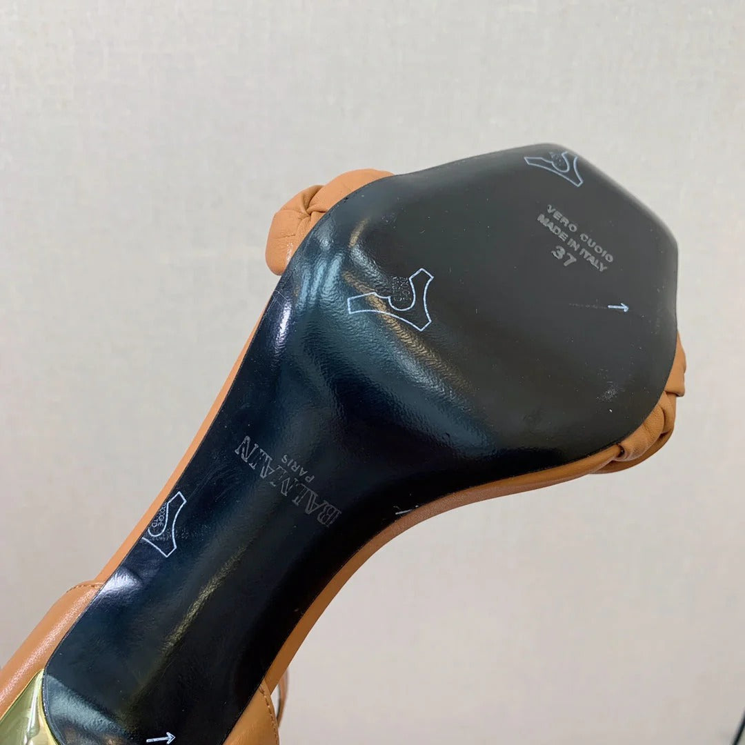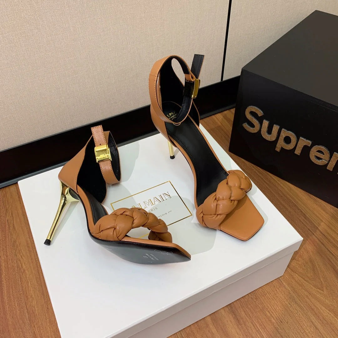BALMAIN 25S ANKLE STRAP HIGH HEEL 95MM IN BROWN CALFSKIN