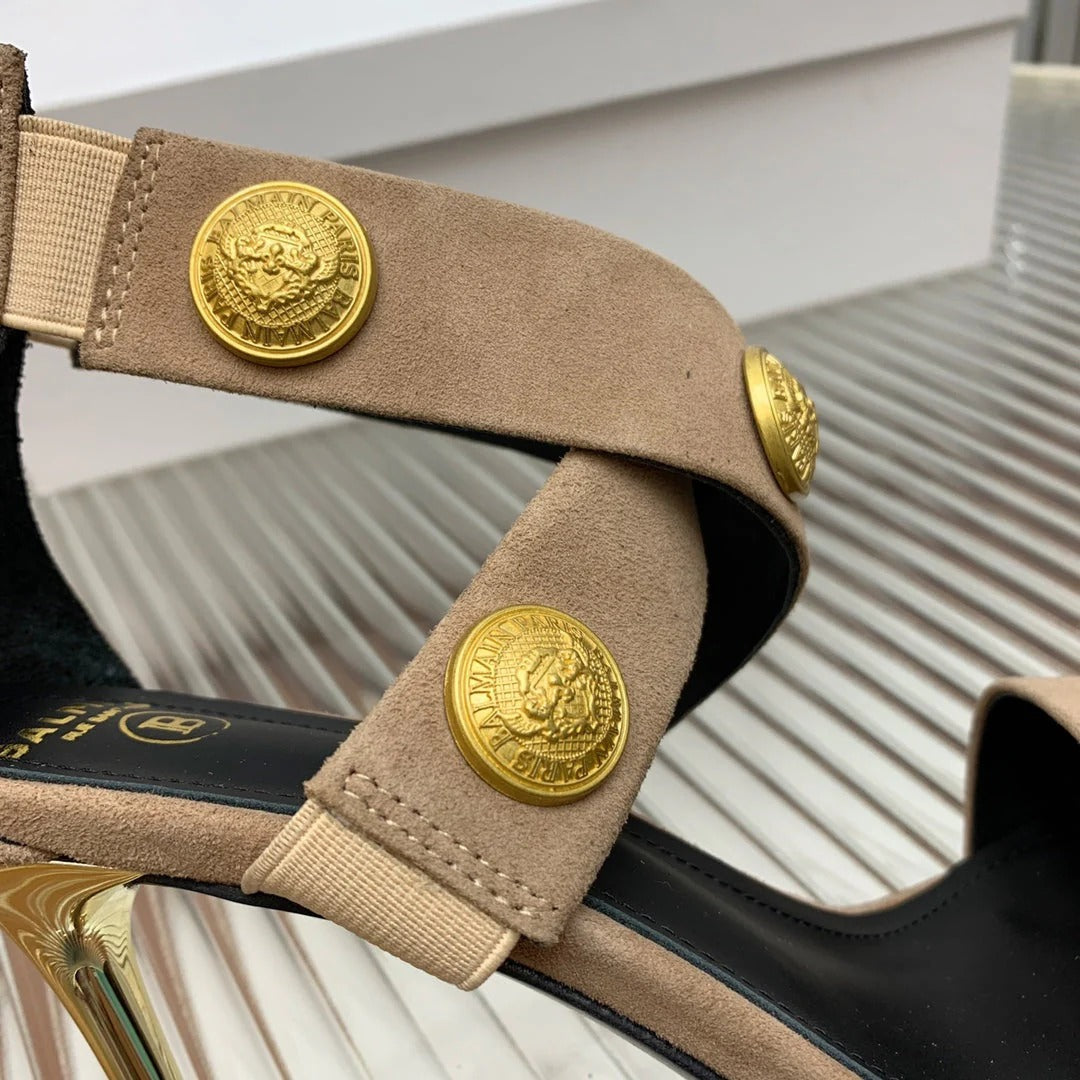 BALMAIN 25S CROSSOVER STRAP HIGH HEELS 95MM IN LIGHT BROWN SUEDE