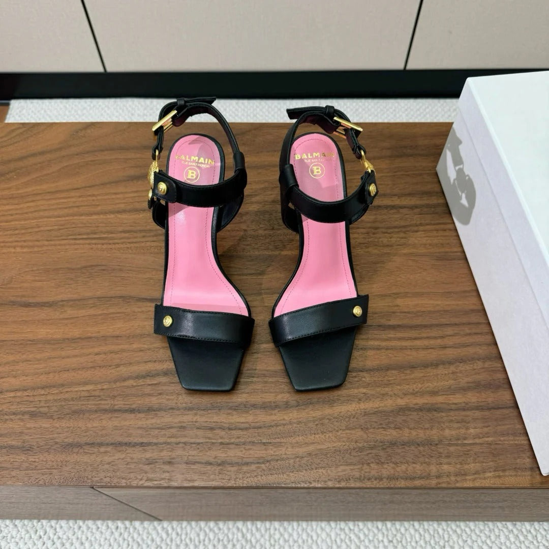 BALMAIN 25S HEELED EVA SANDALS 95MM IN BLACK AND PINK CALFSKIN