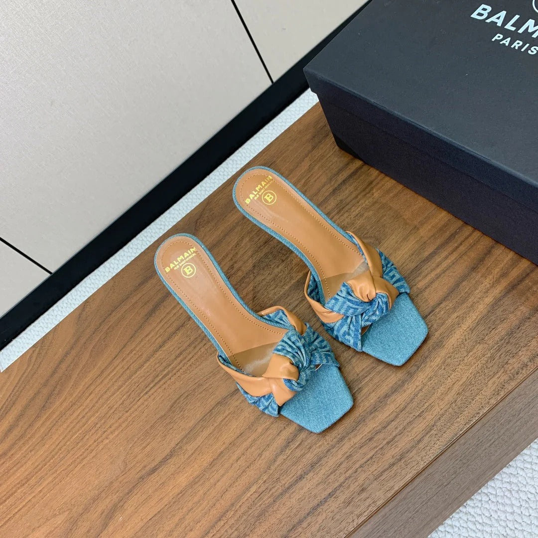 BALMAIN 25S HIGH HEEL MULES 95MM IN WARM CARAMEL DENIM AND CALFSKIN