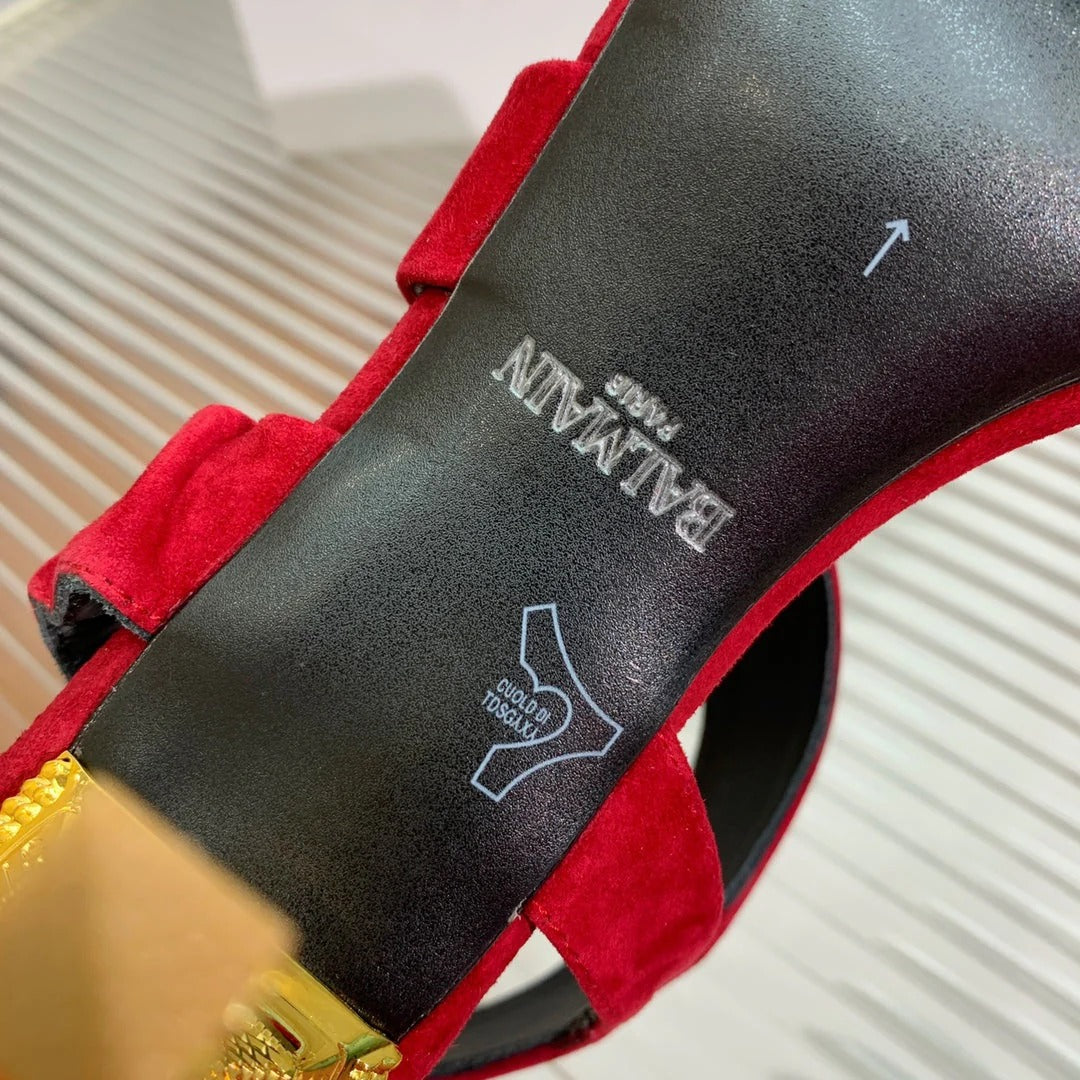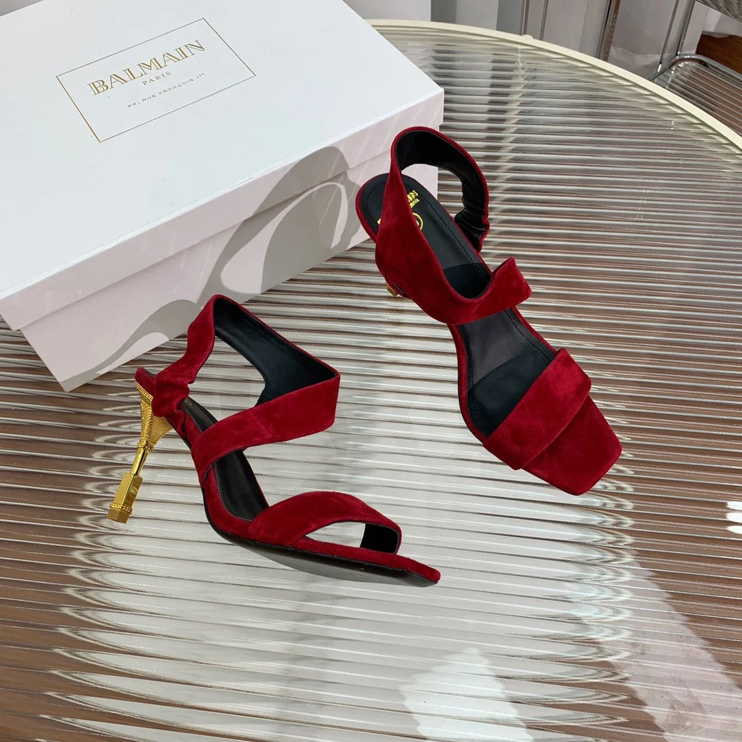 BALMAIN 25S HIGH HEEL SANDALS 95MM IN DARK CRIMSON SUEDE