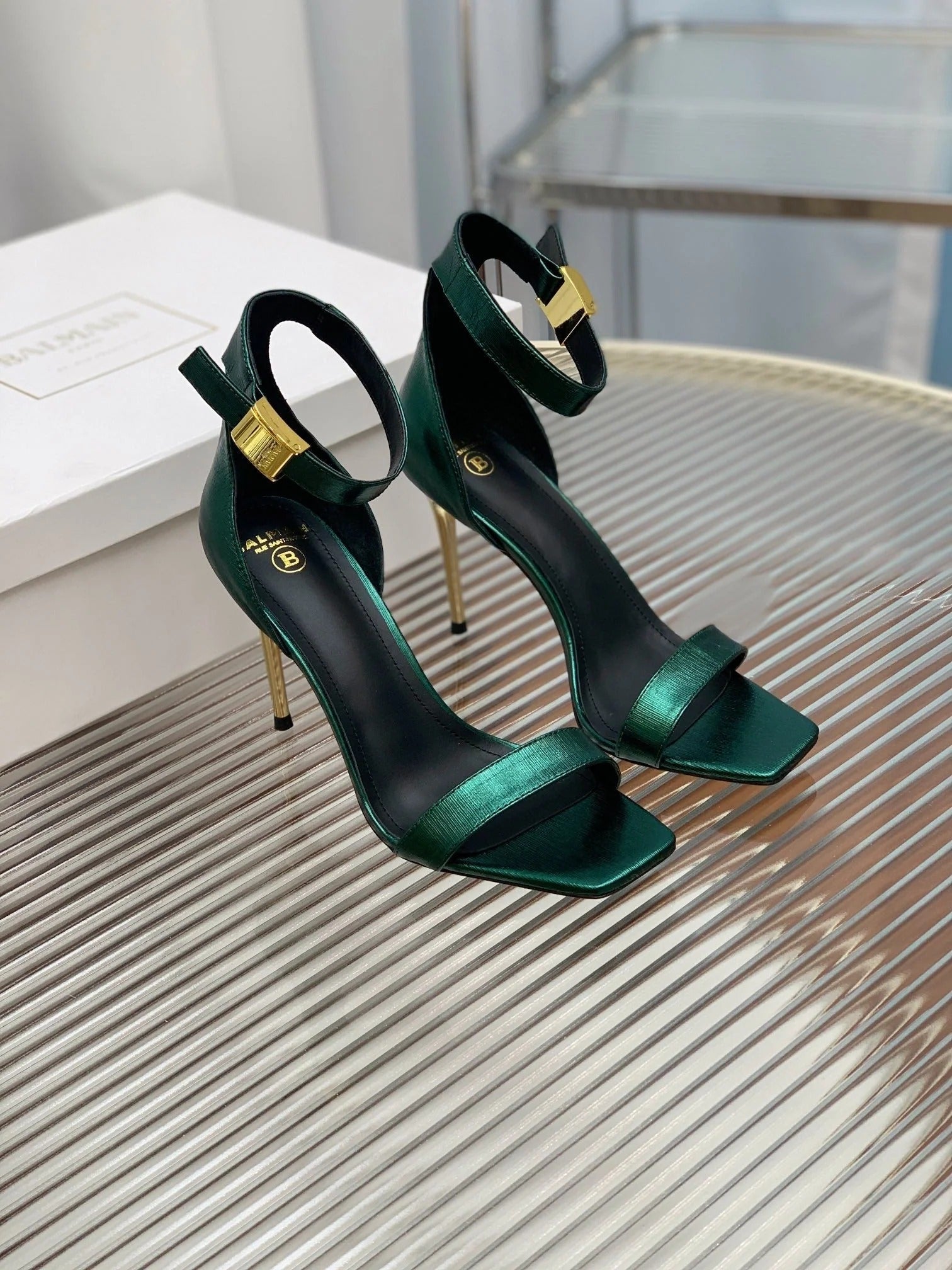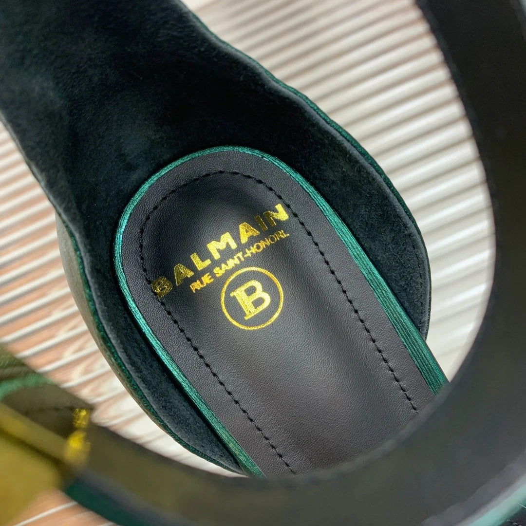 BALMAIN 25S METAL BUCKLE HIGH HEELS 95MM IN TEAL GREEN CALFSKIN
