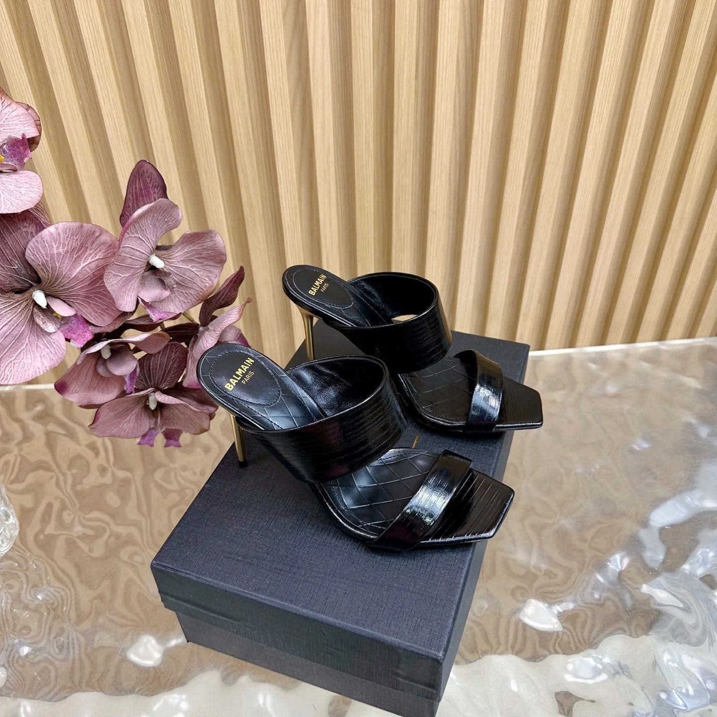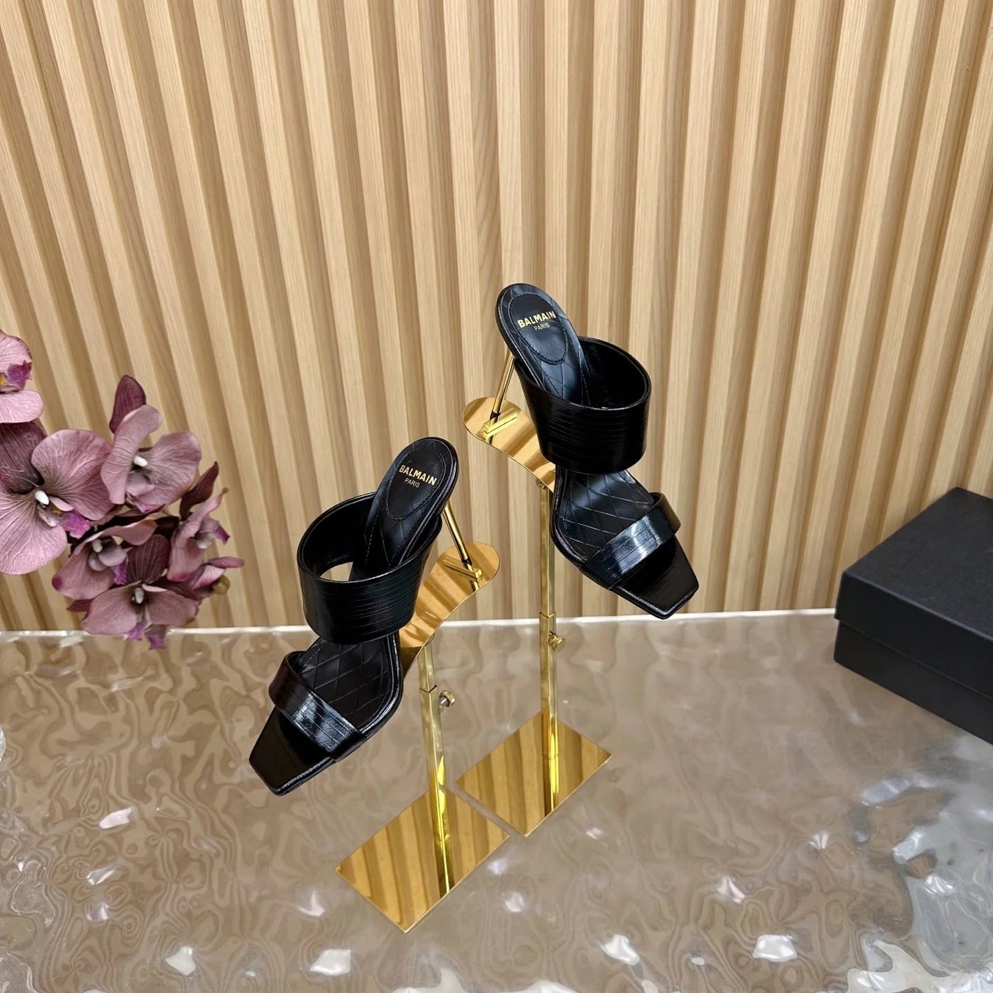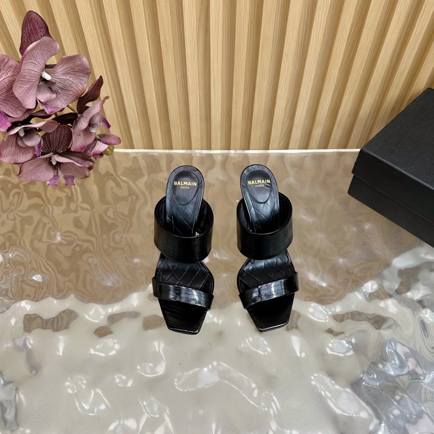 BALMAIN 25S MULES IN STRIPED LEATHER 95MM IN BLACK CALFSKIN