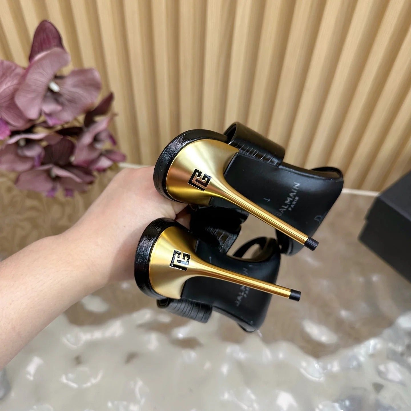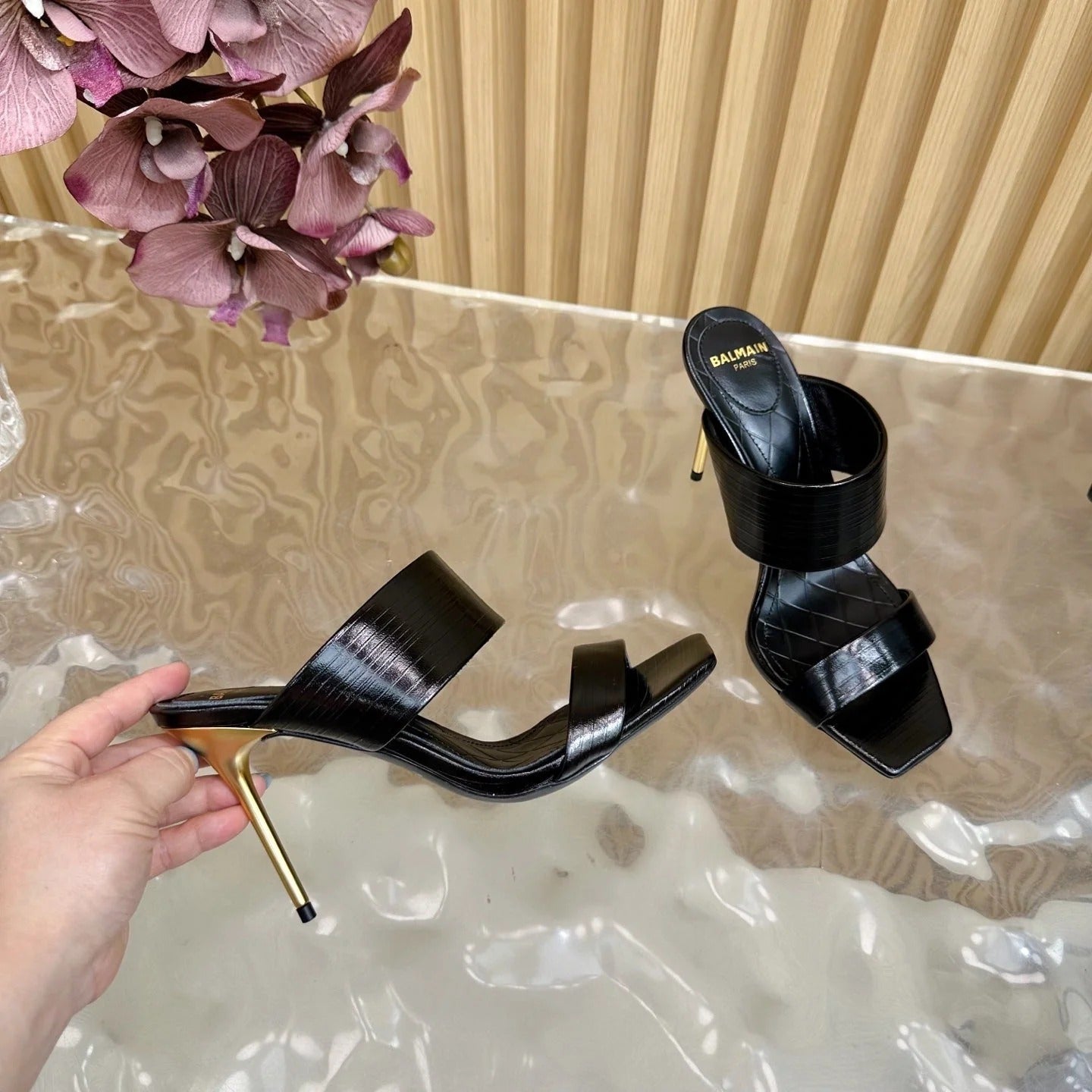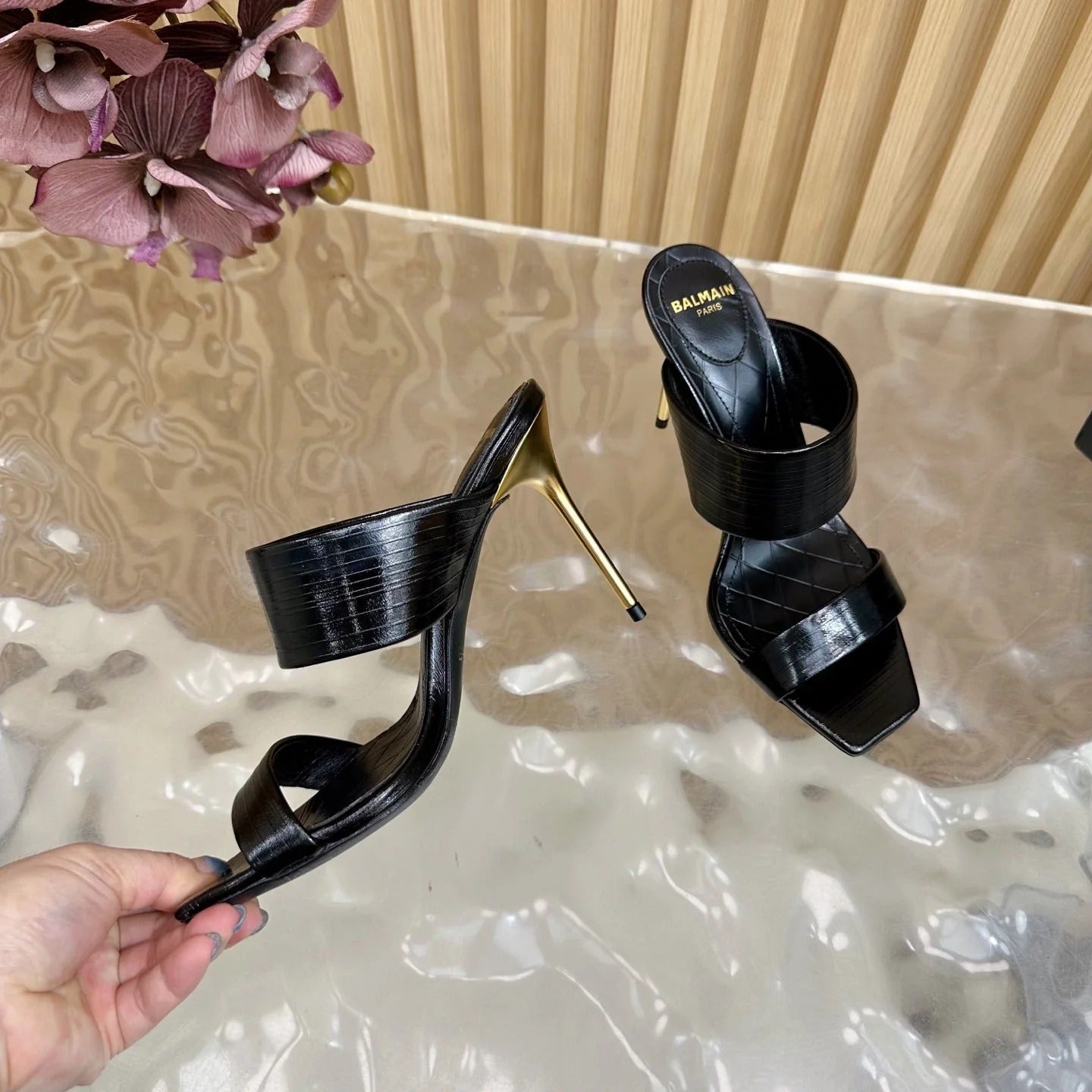 BALMAIN 25S MULES IN STRIPED LEATHER 95MM IN BLACK CALFSKIN