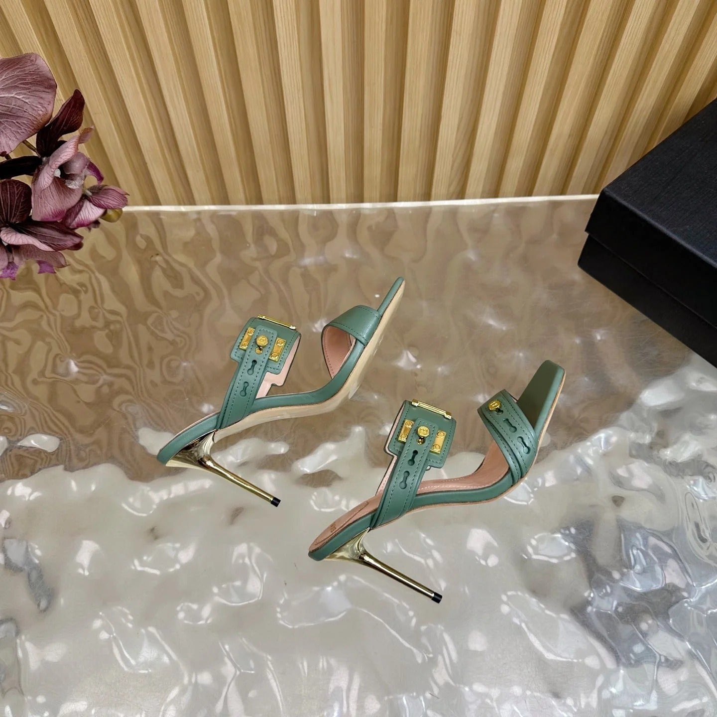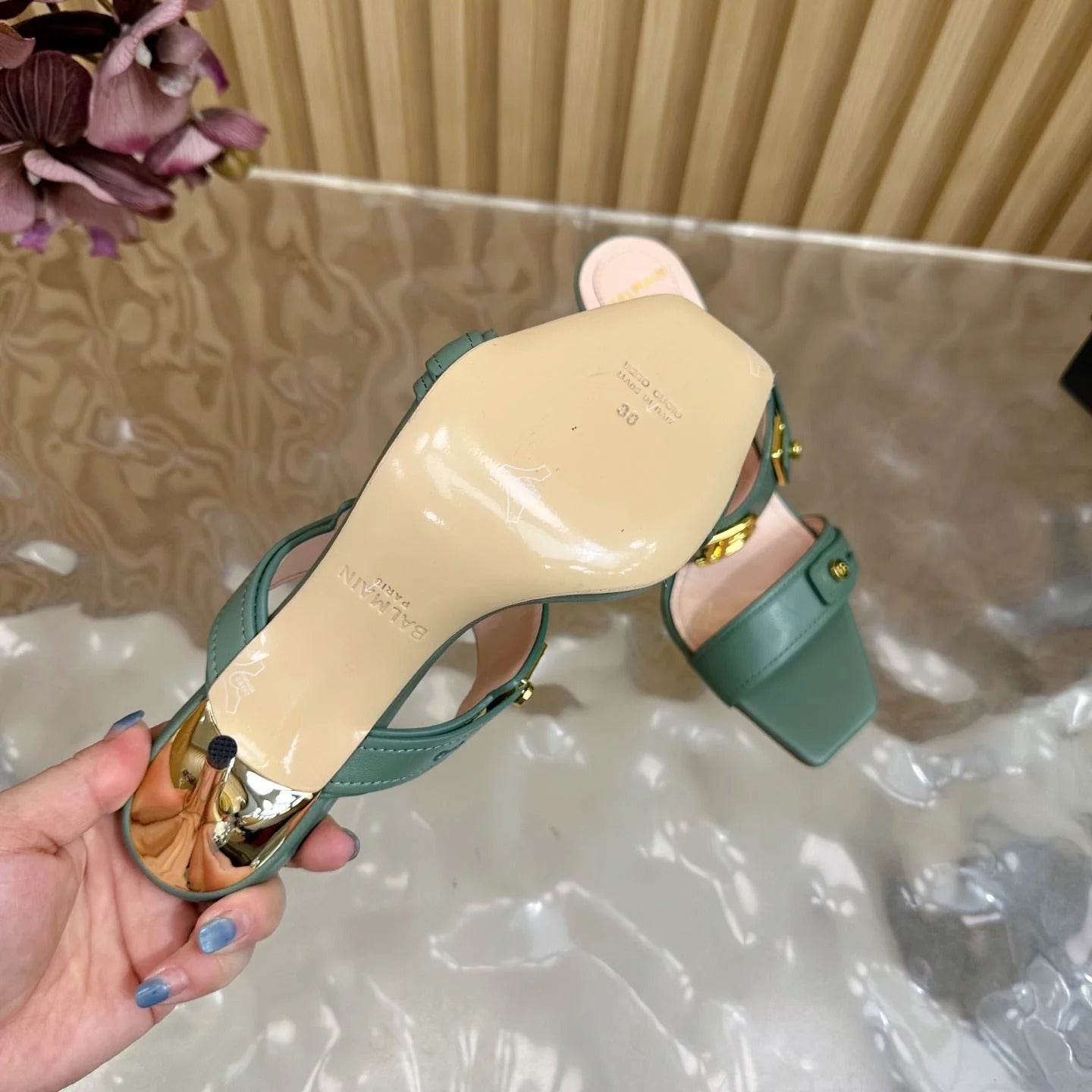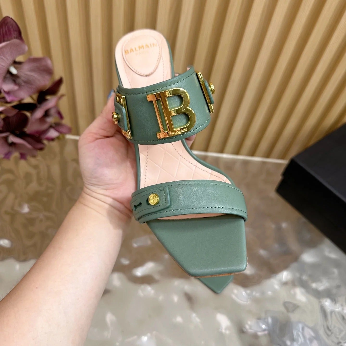 BALMAIN 25S MULES IN STRIPED LEATHER 95MM IN DUSTY GREEN CALFSKIN GOLD HARDWARE