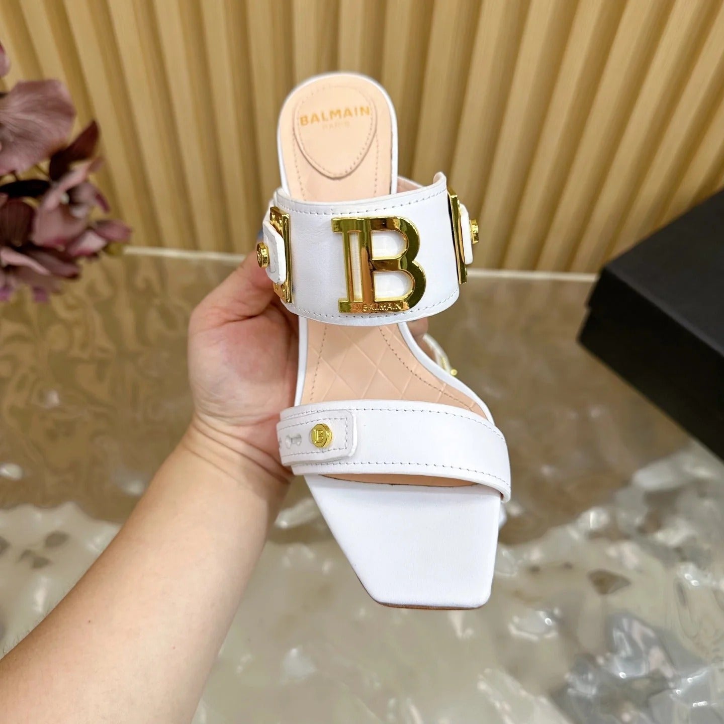 BALMAIN 25S MULES IN STRIPED LEATHER 95MM IN WHITE CALFSKIN GOLD HARDWARE