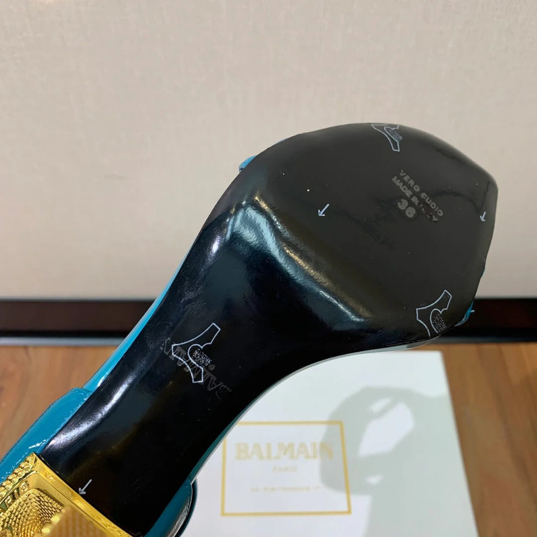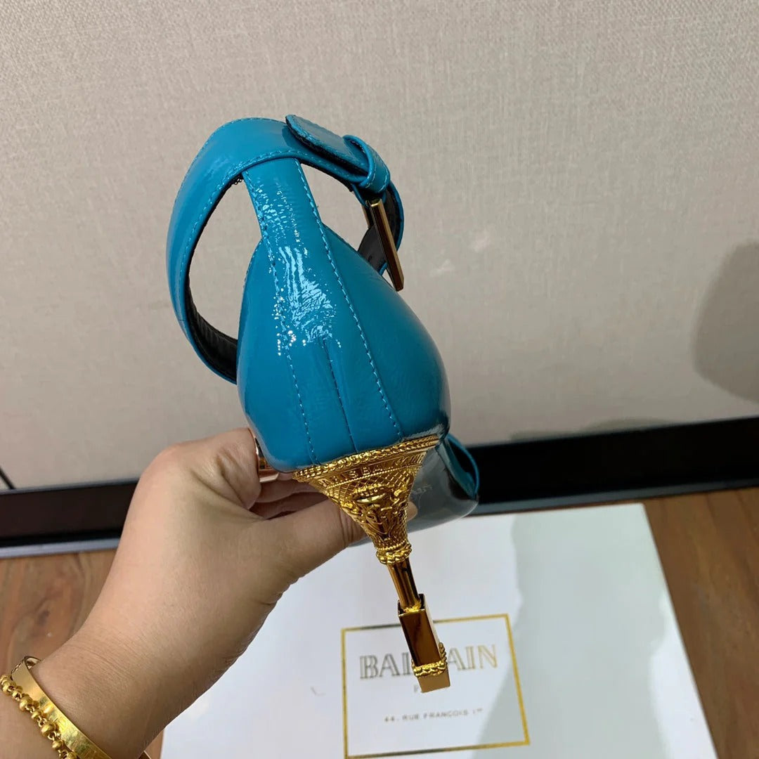 BALMAIN 25S SQUARE STRAP HIGH HEELS 100MM IN BLUE PATENT CALFSKIN
