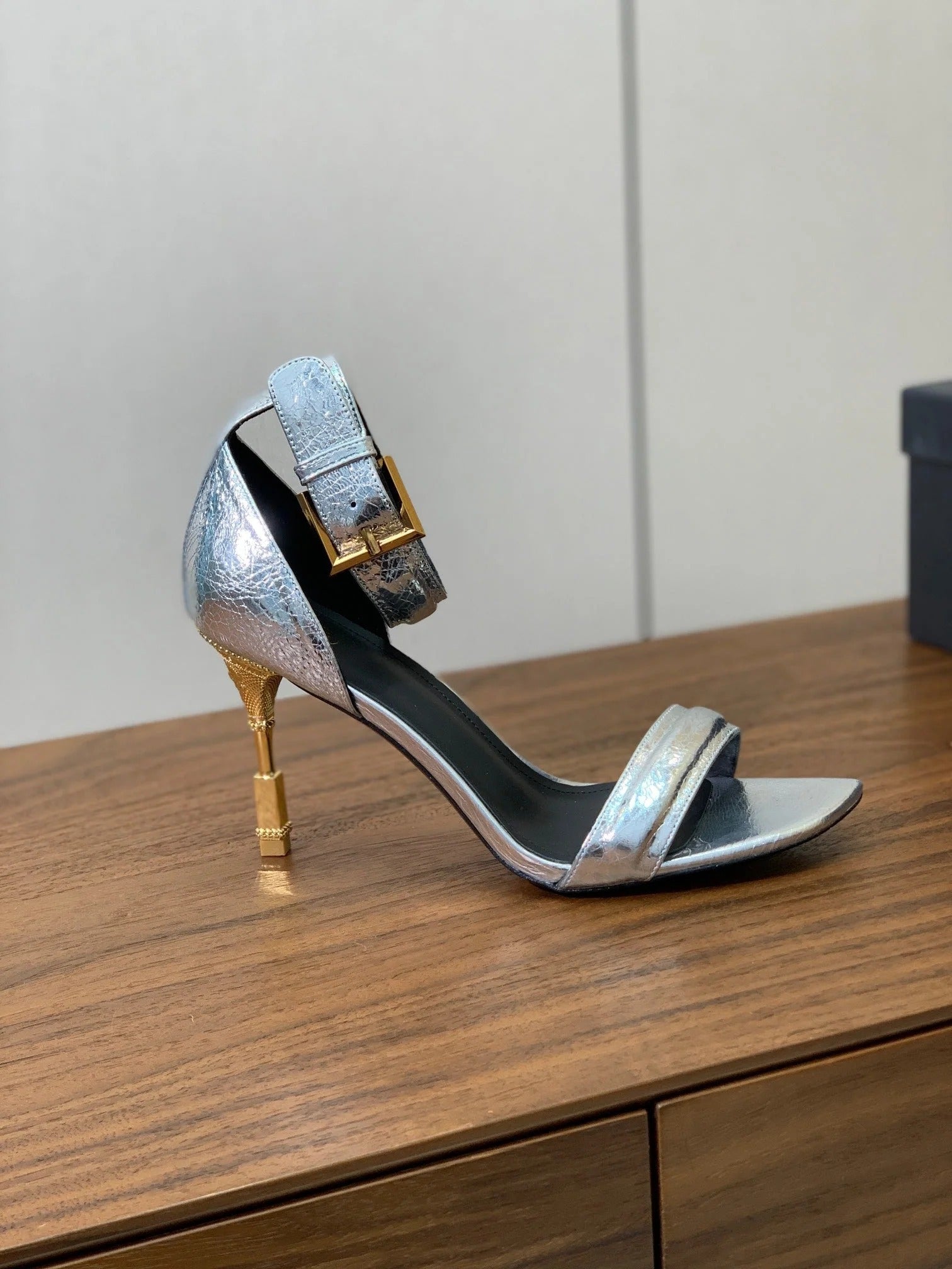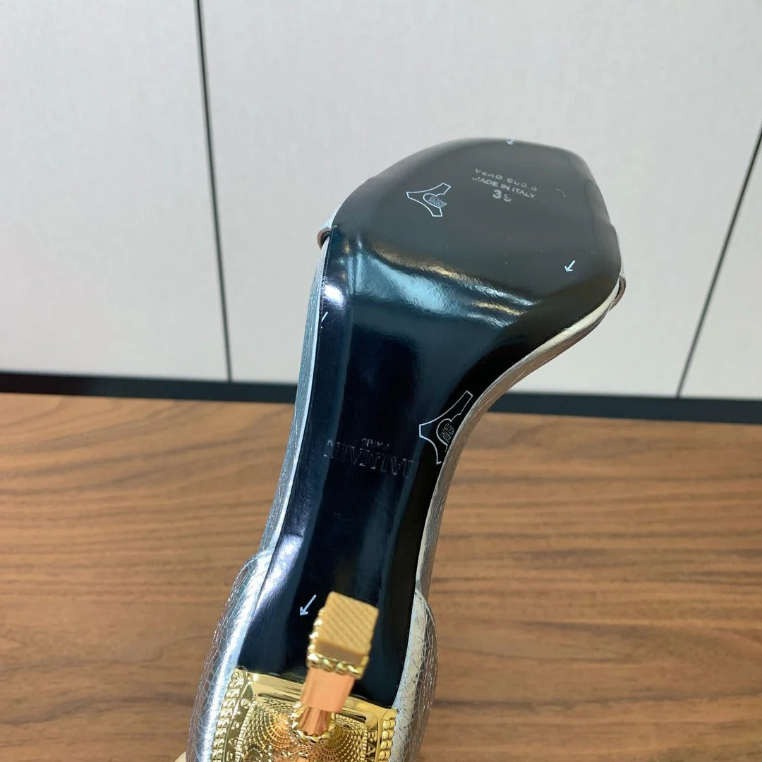 BALMAIN 25S SQUARE STRAP HIGH HEELS 100MM IN SILVER CALFSKIN