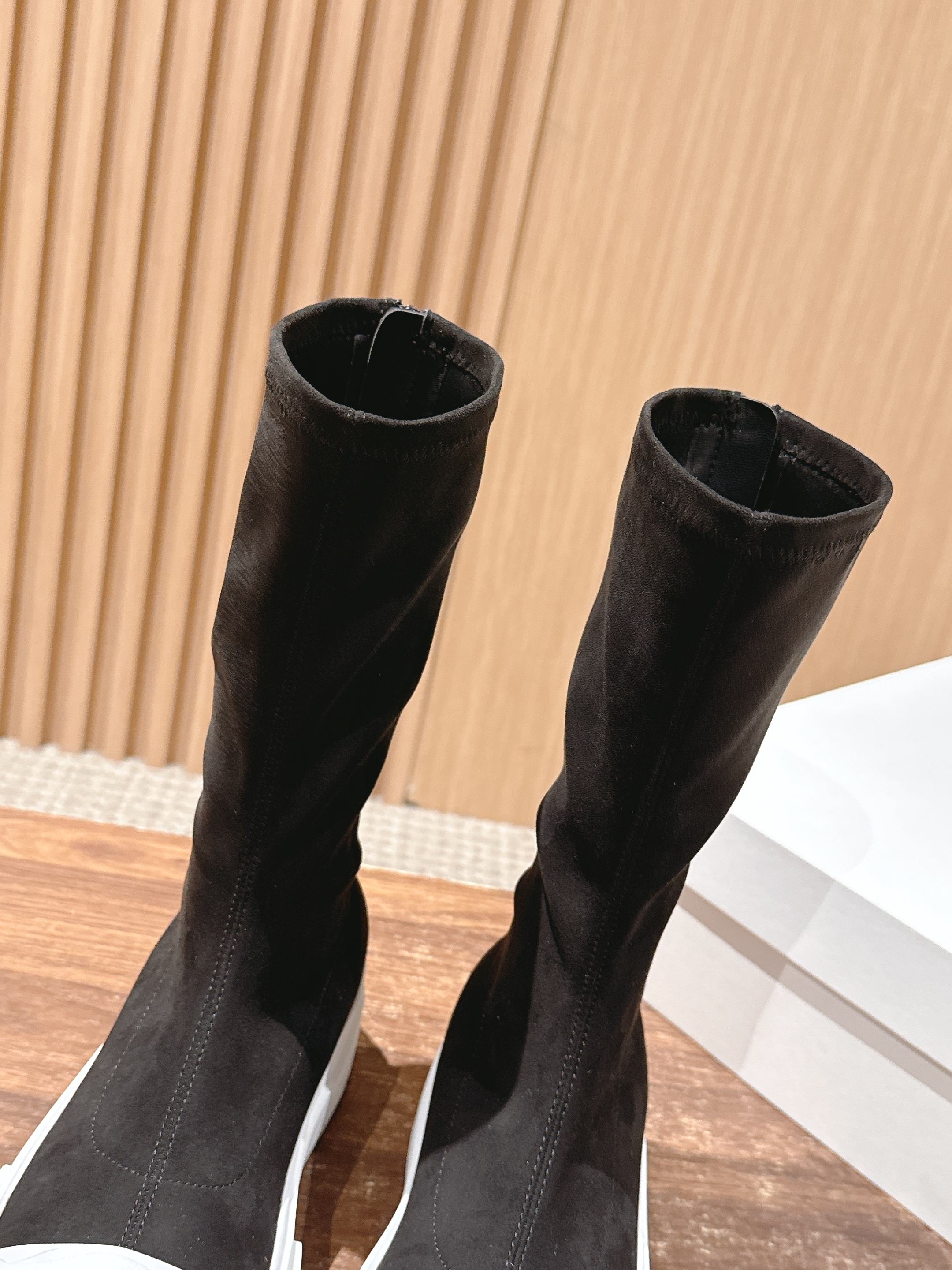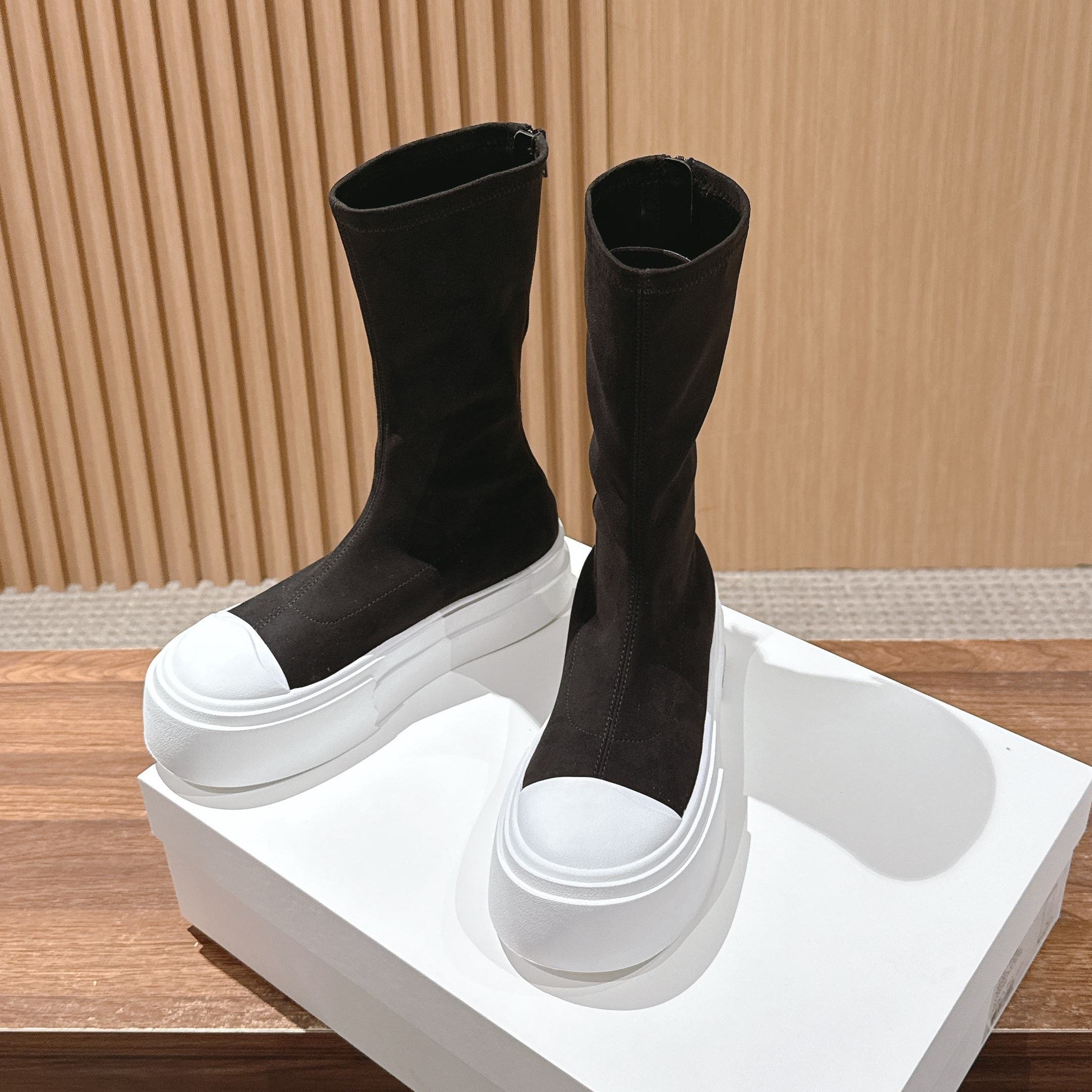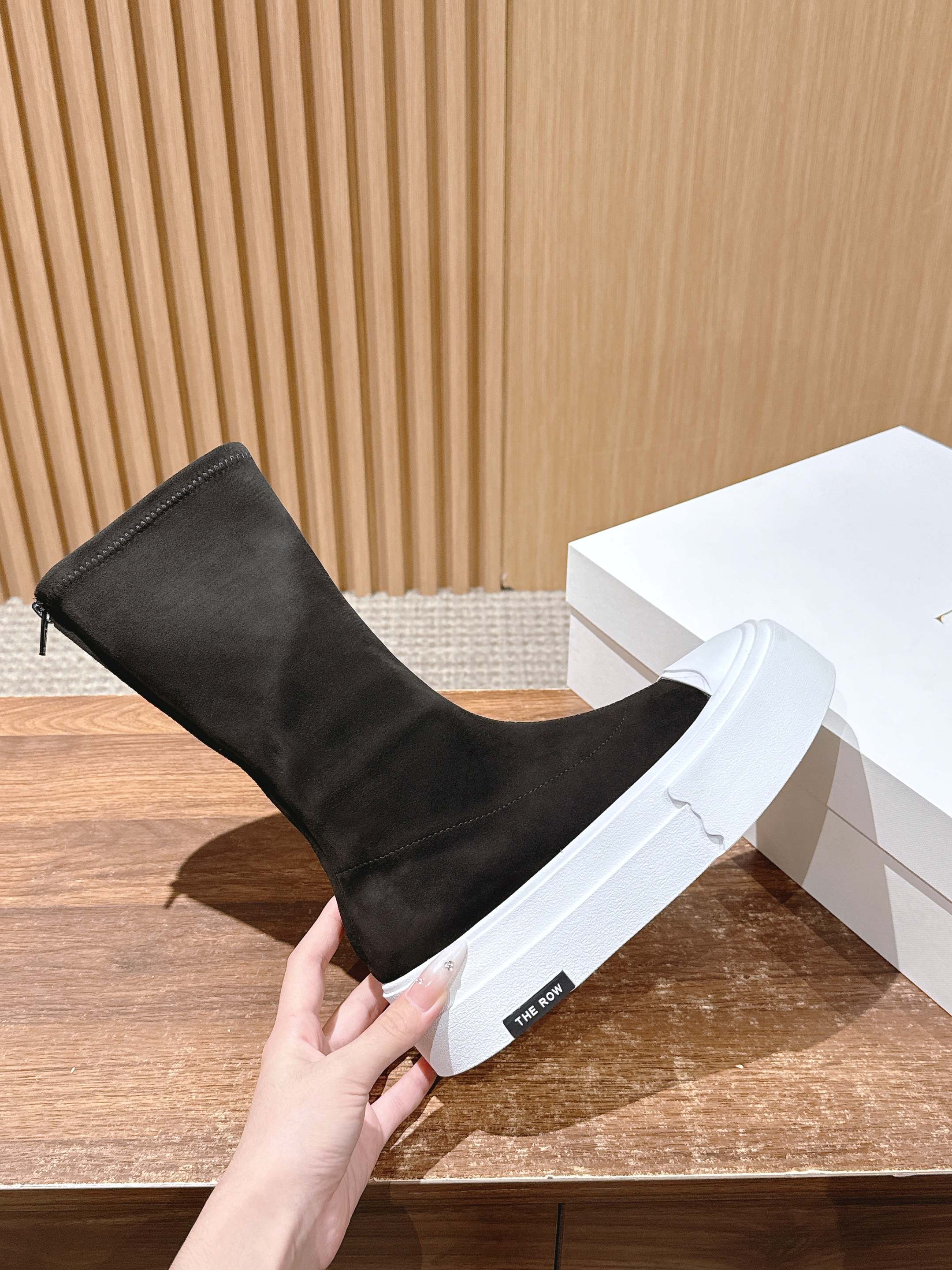 The Row Thick-soled Classic Round Toe Stretch Boots Black White Suede 444176