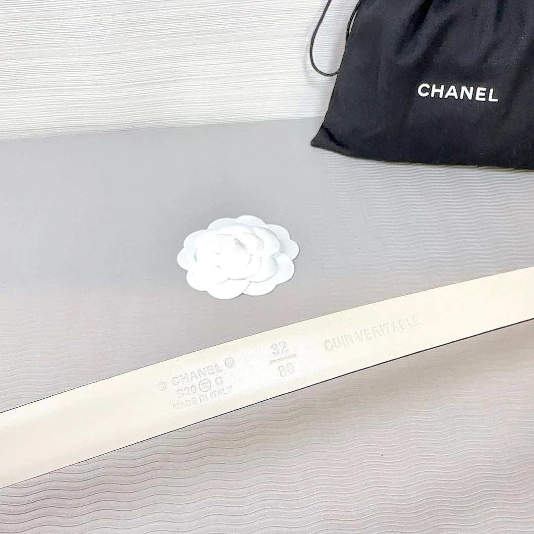 CC BELT 20MM IN WHITE CALFSKIN GOLD HARDWARE ATTACH PEARLS