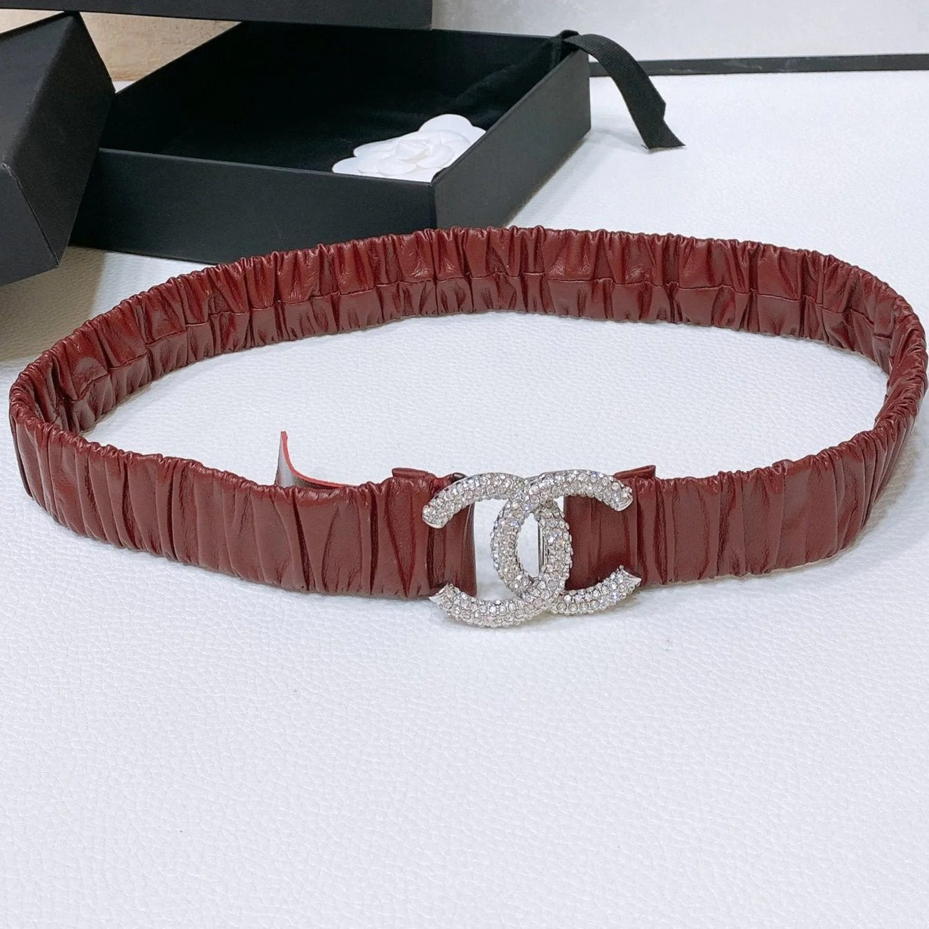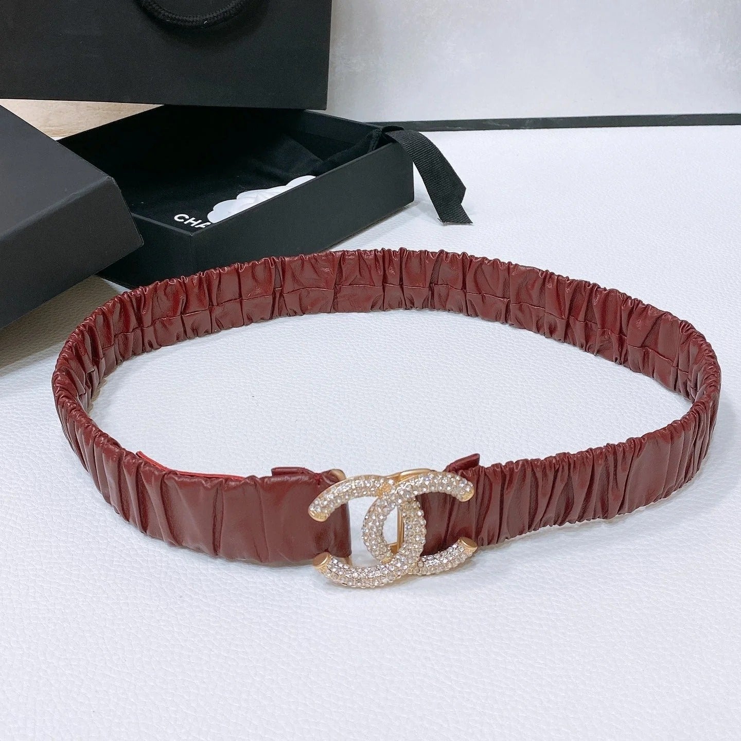 CC ELASTIC BELT 30MM IN WINE RED CALFSKIN GOLD HARDWARE WITH RHINSTONES