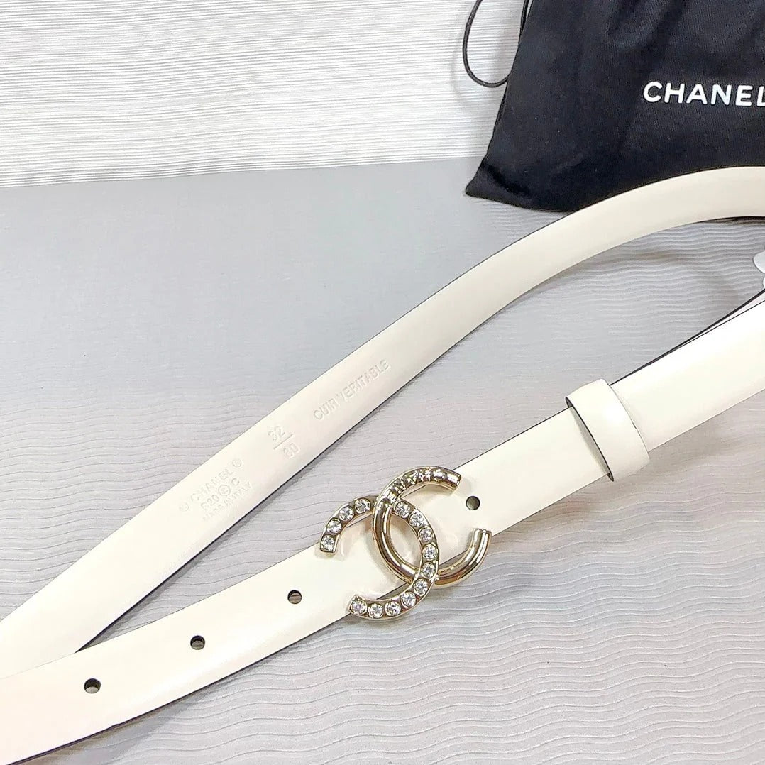 CC ELASTIC BELT 30MM IN WHITE CALFSKIN GOLD HARDWARE WITH RHINSTONES