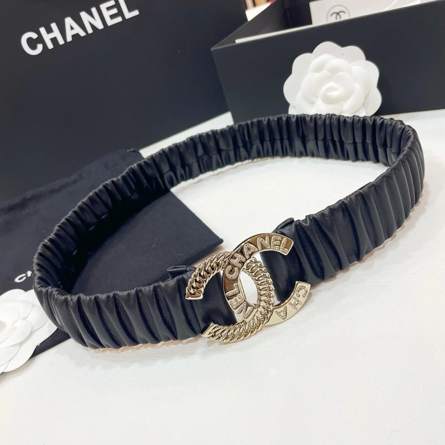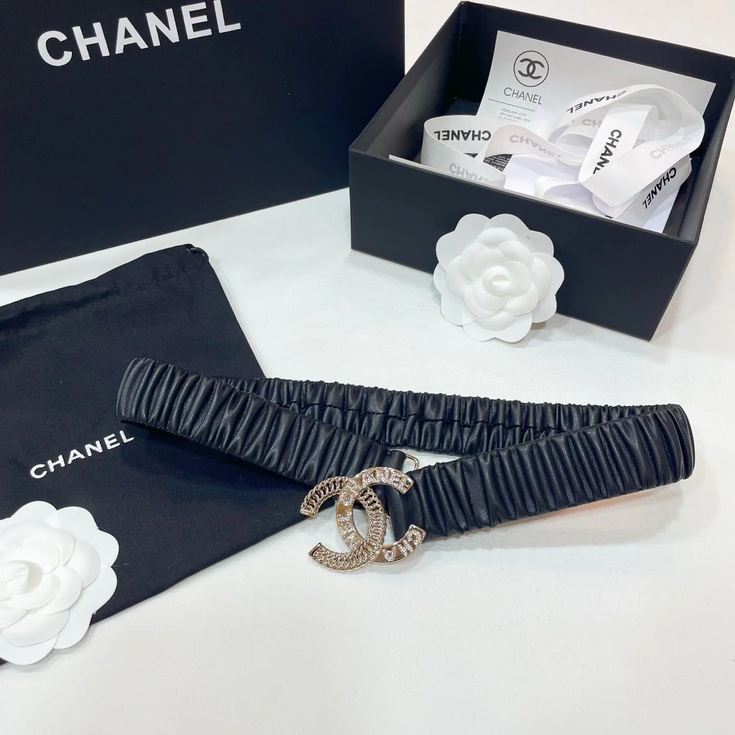 DOUBLE CC 30MM STRETCH BELT IN BLACK CALFSKIN WITH GOLD CHAIN BUCKLE CRYSTAL DETAIL