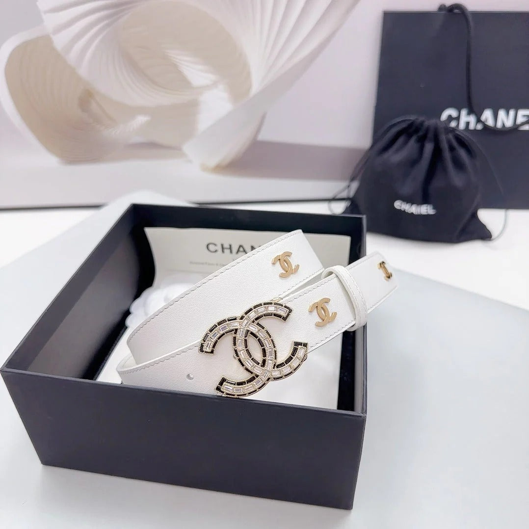 CC 30MM BELT IN WHITE CALFSKIN GOLD HARDWARE ATTACH PEARLS