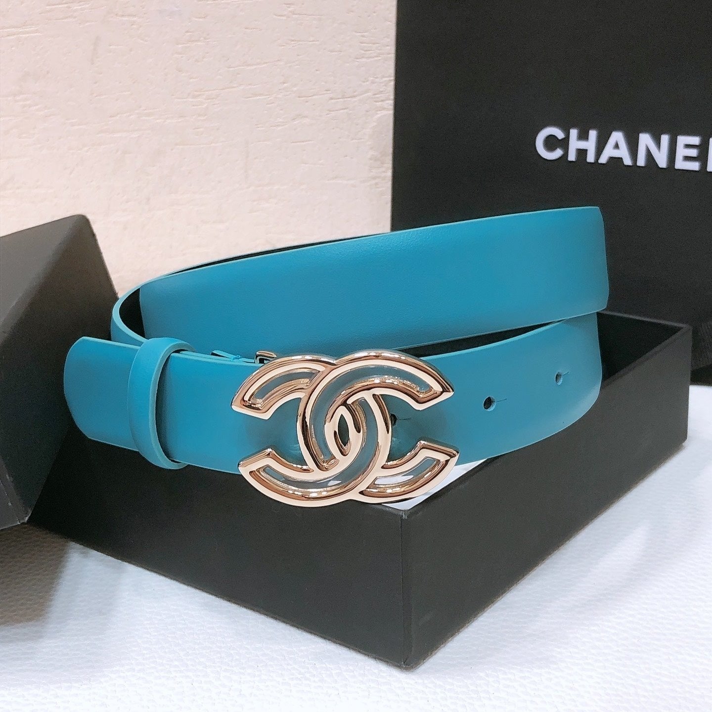 CHANEL BELT 3CM IN COLUMBIA BLUE LAMBSKIN WITH CRYSTAL GOLD HARDWARE