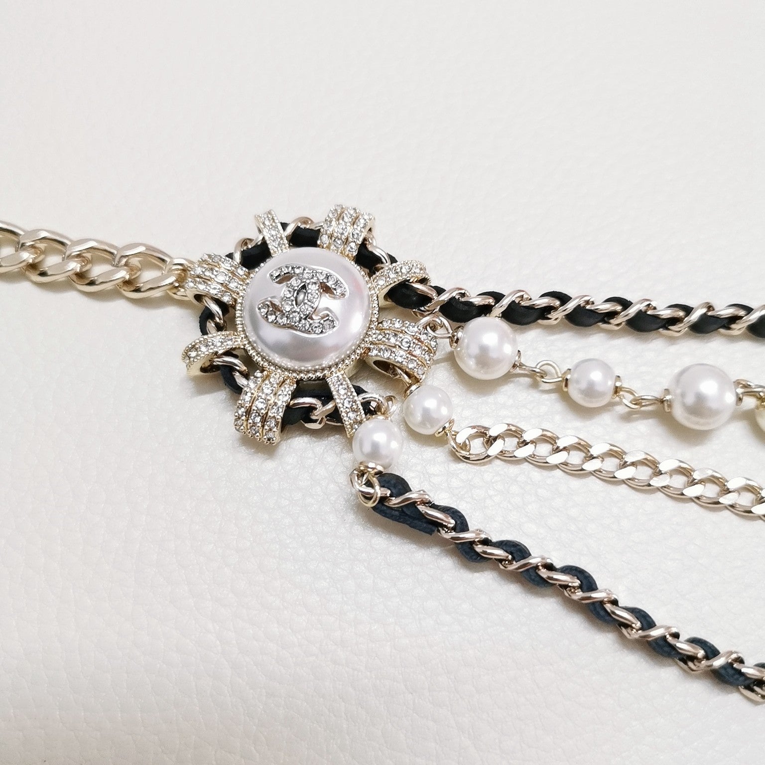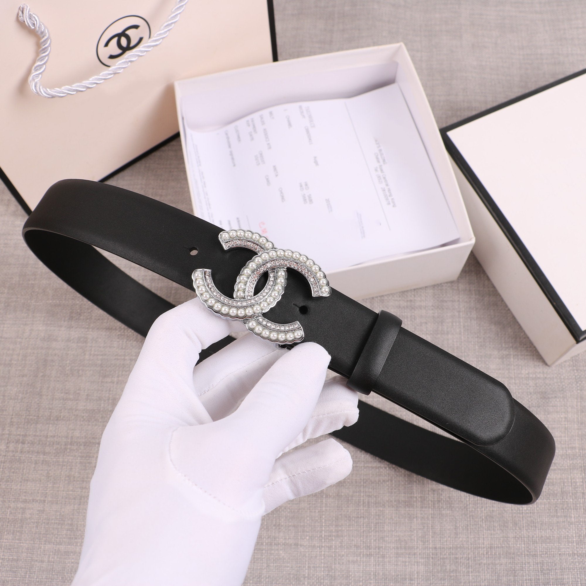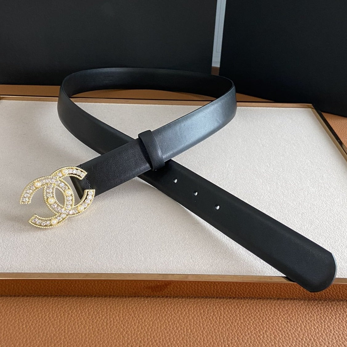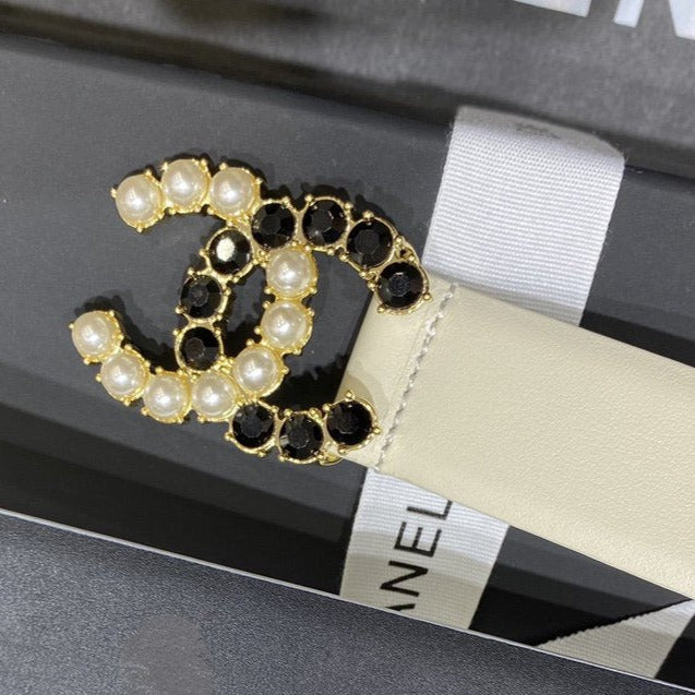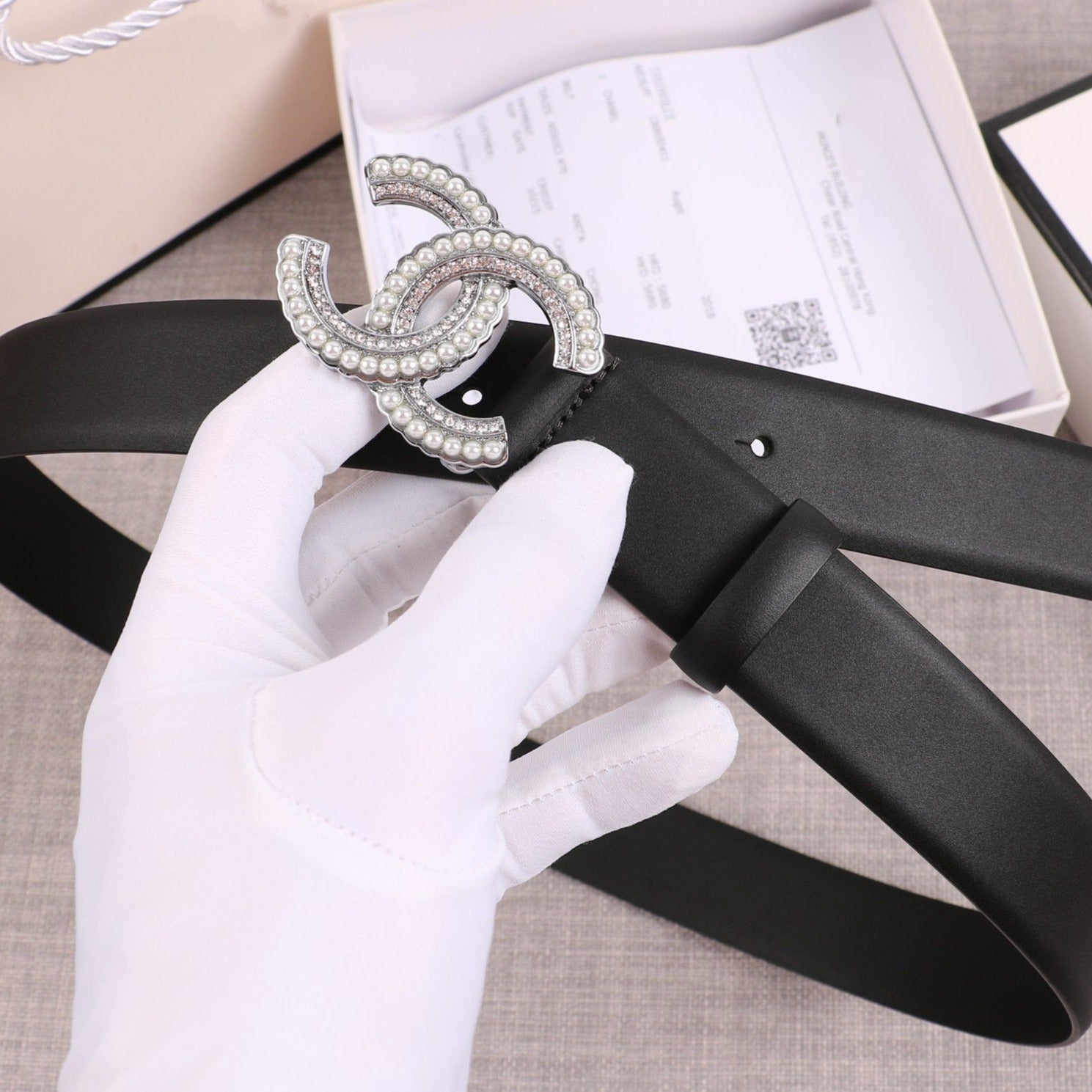 CC BELT 3.0CM LEATHER BLACK BUCKLE GOLD PEARL WHITE DIAMOND