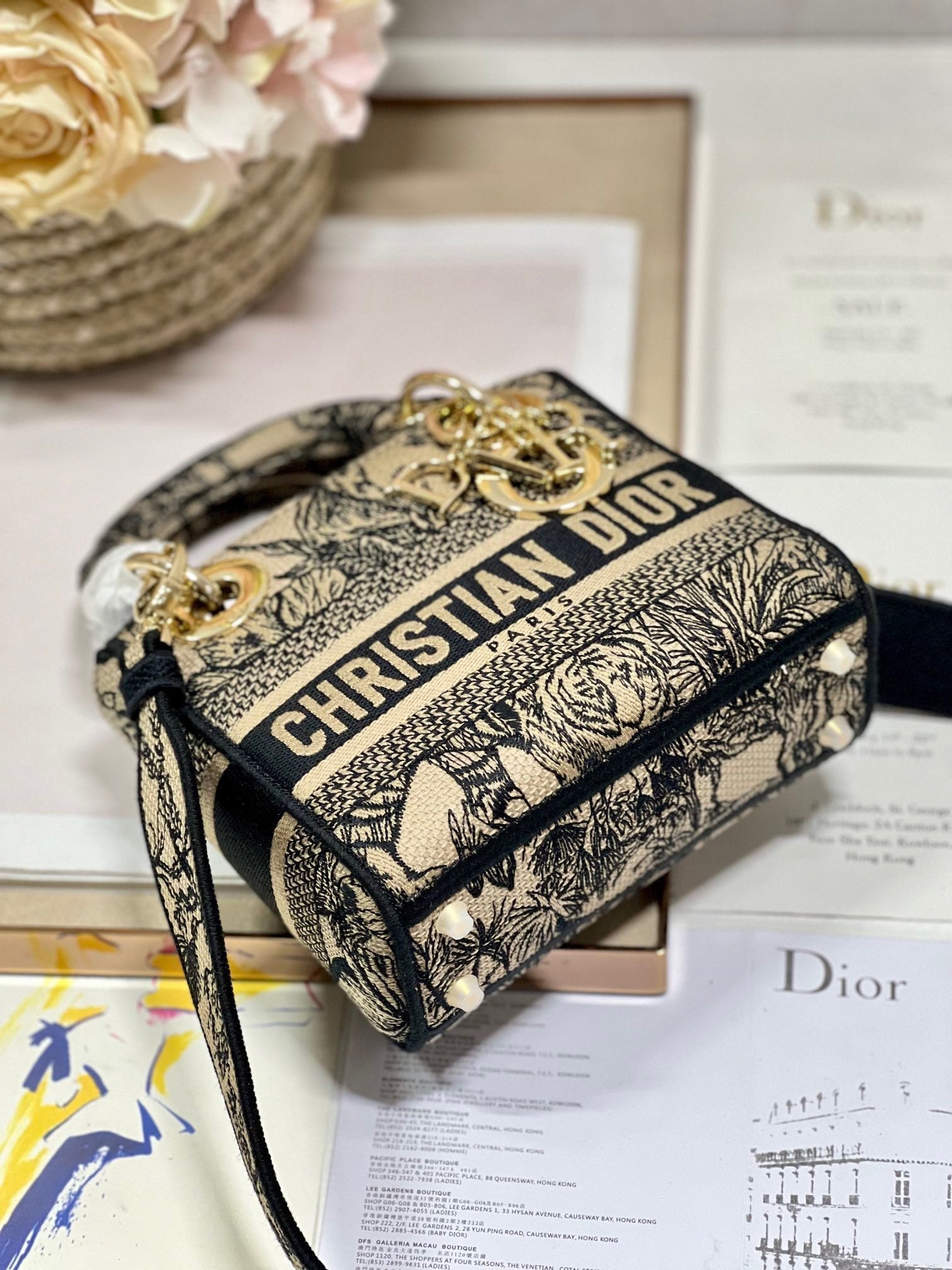 CD Small Dior Book Tote Tropical Pattern Black Beige Cotton