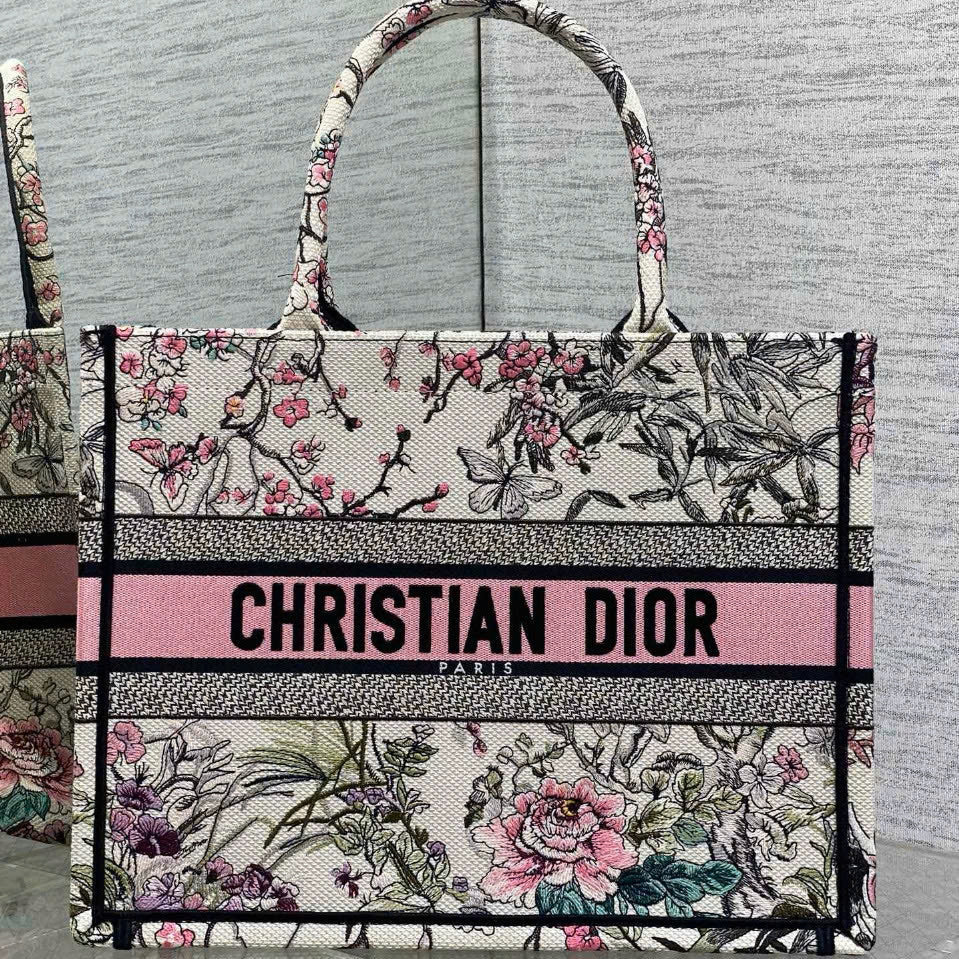 CD Medium Dior Book Tote Floral Motif White Pink Cotton