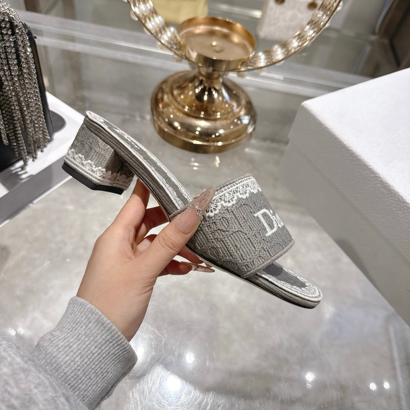 CD 26 Embroidered Sandals 45mm Gray White Canvas 592239