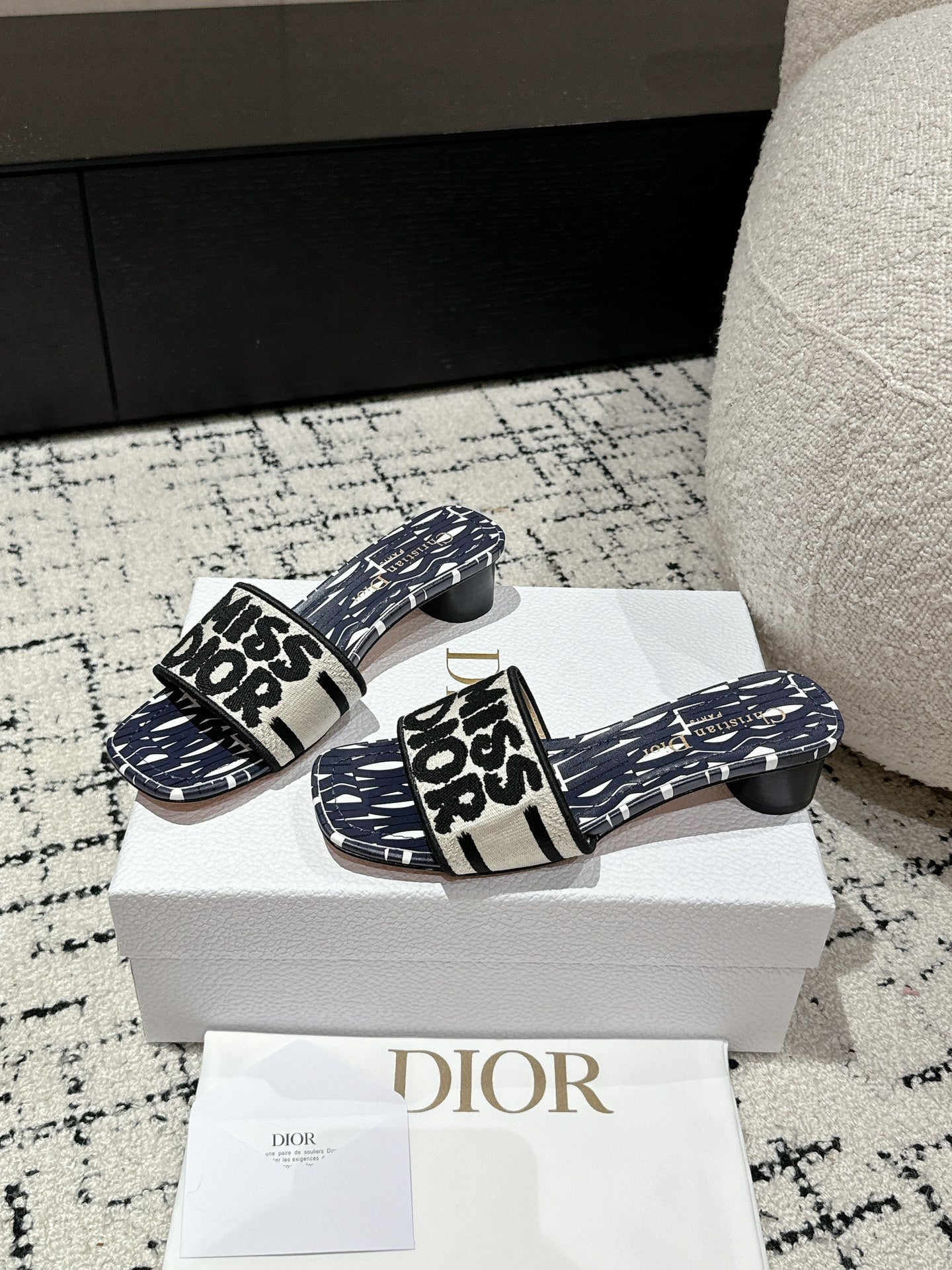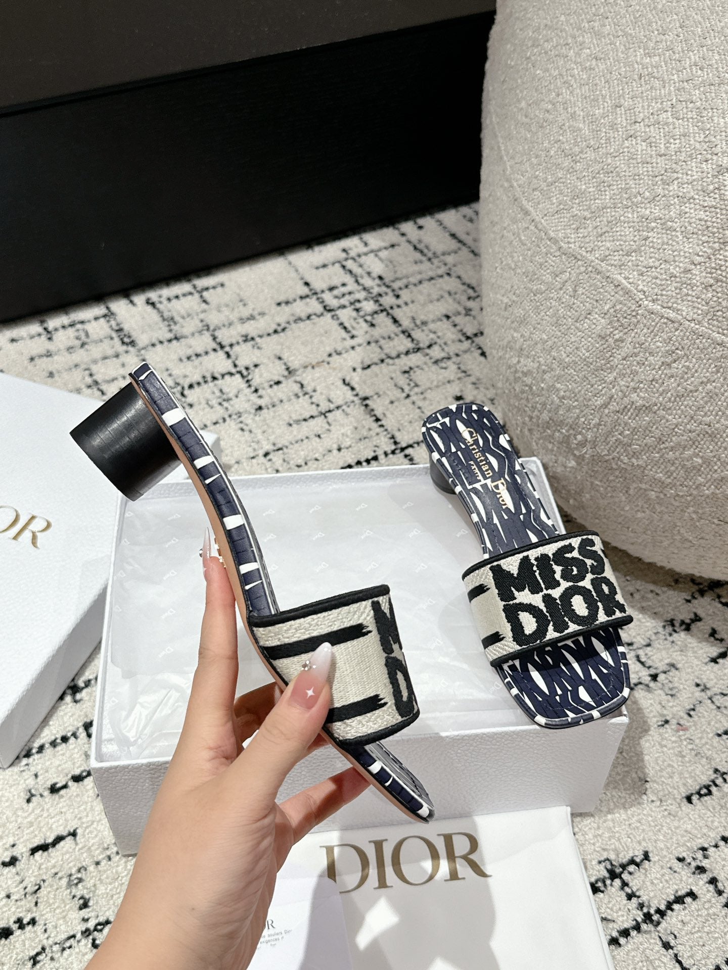 CD Dway Heeled Slide Blue Black Embroidered Cotton
