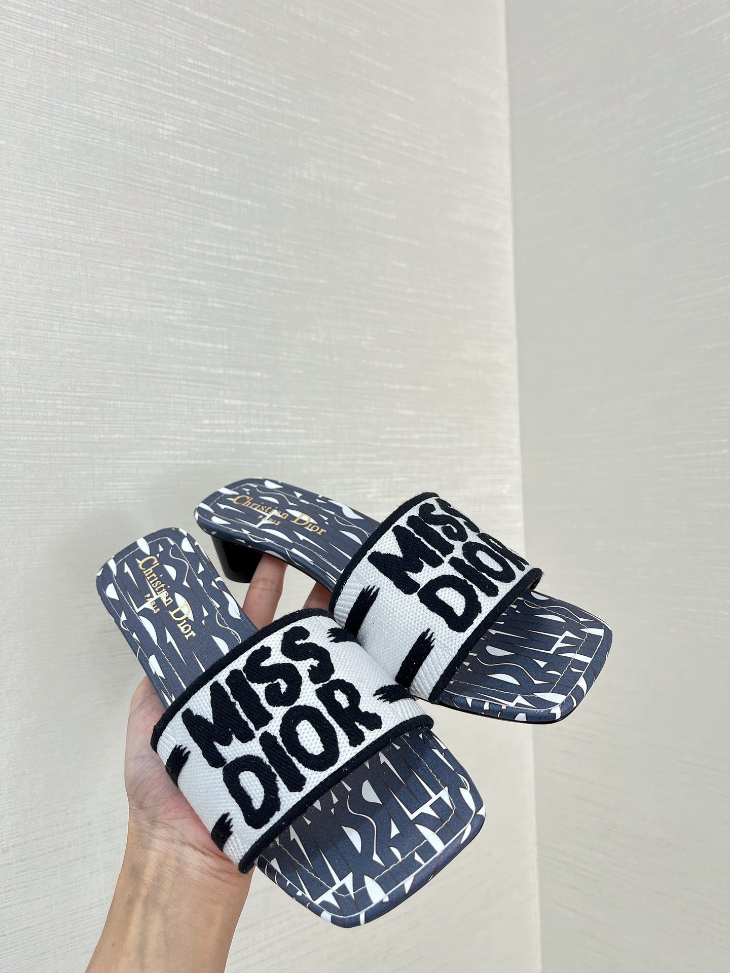 dway heeled slide 35 embroidered cotton grey miss cd alllover motif