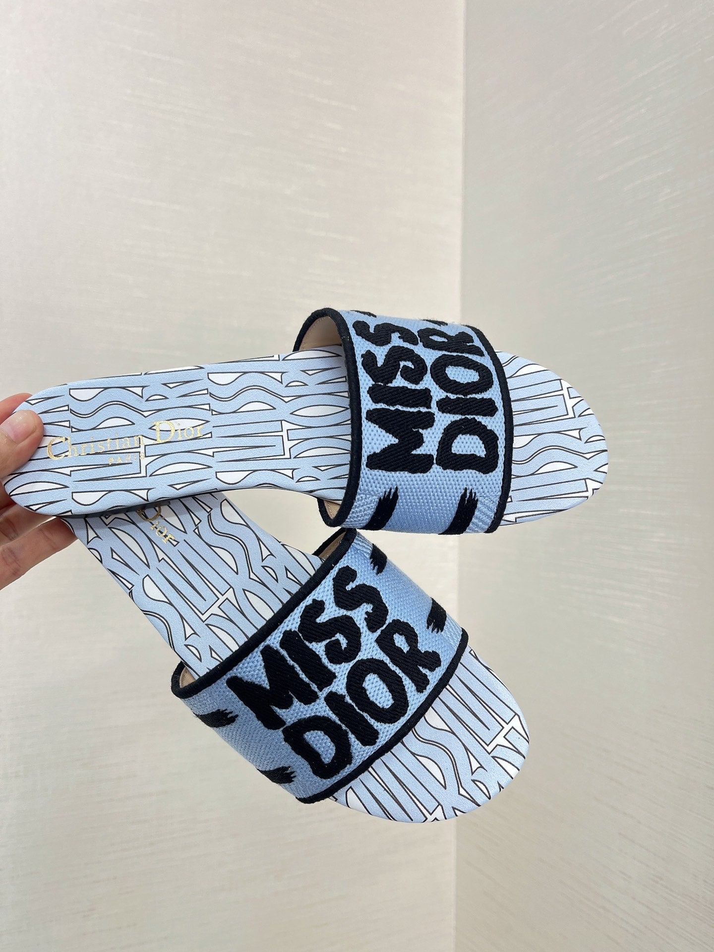 dway slide embroidered cotton cloud blue miss cd alllover motif