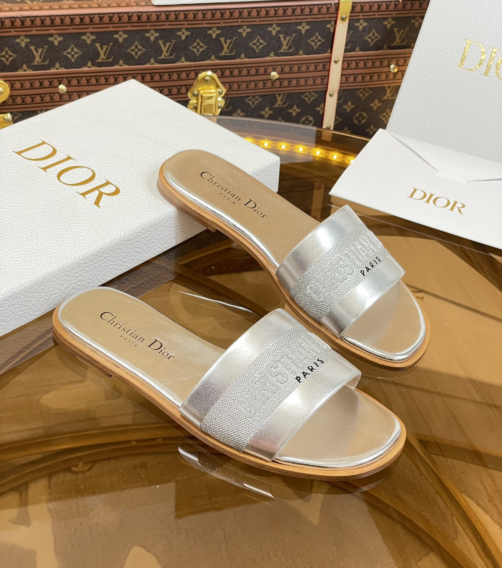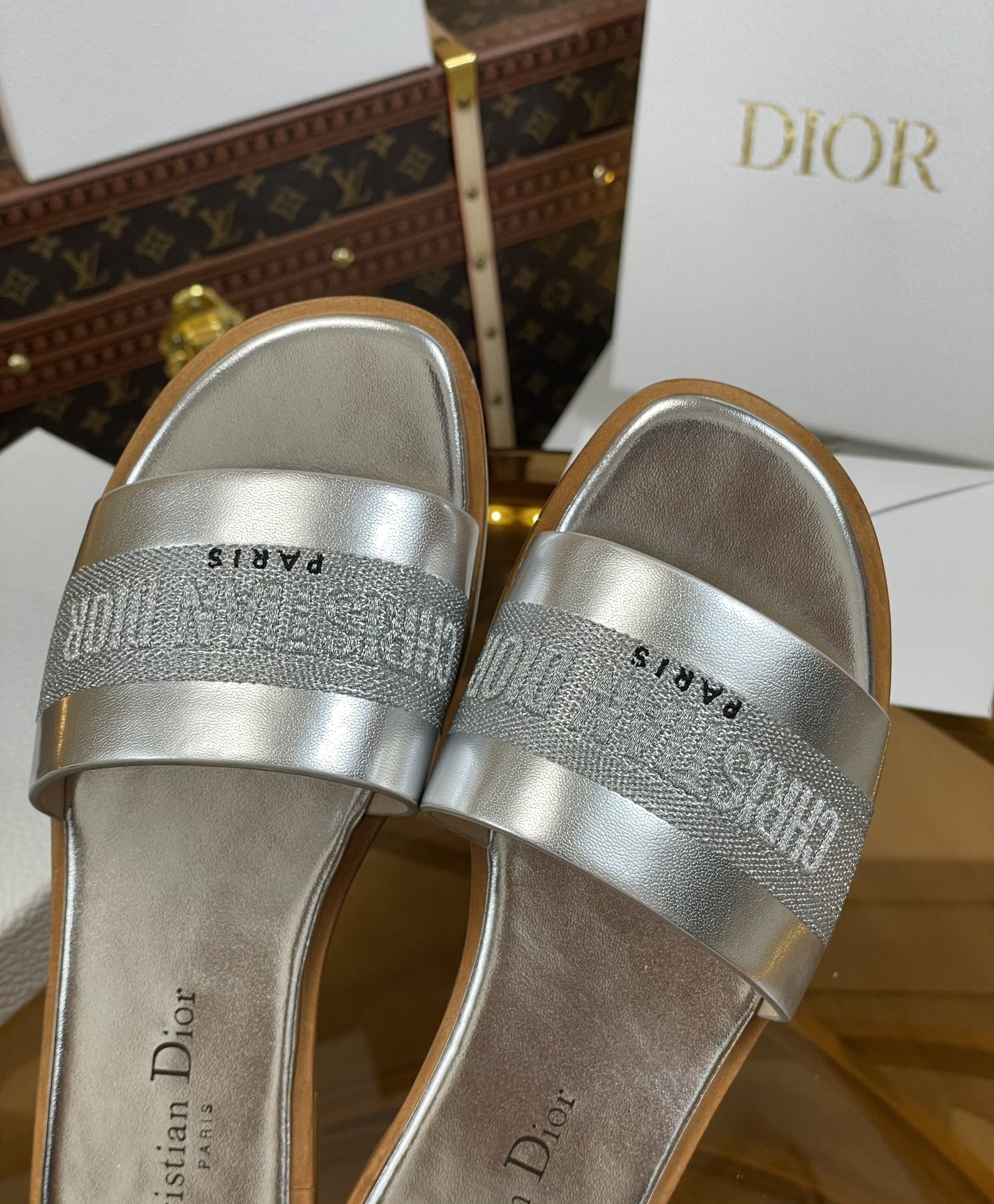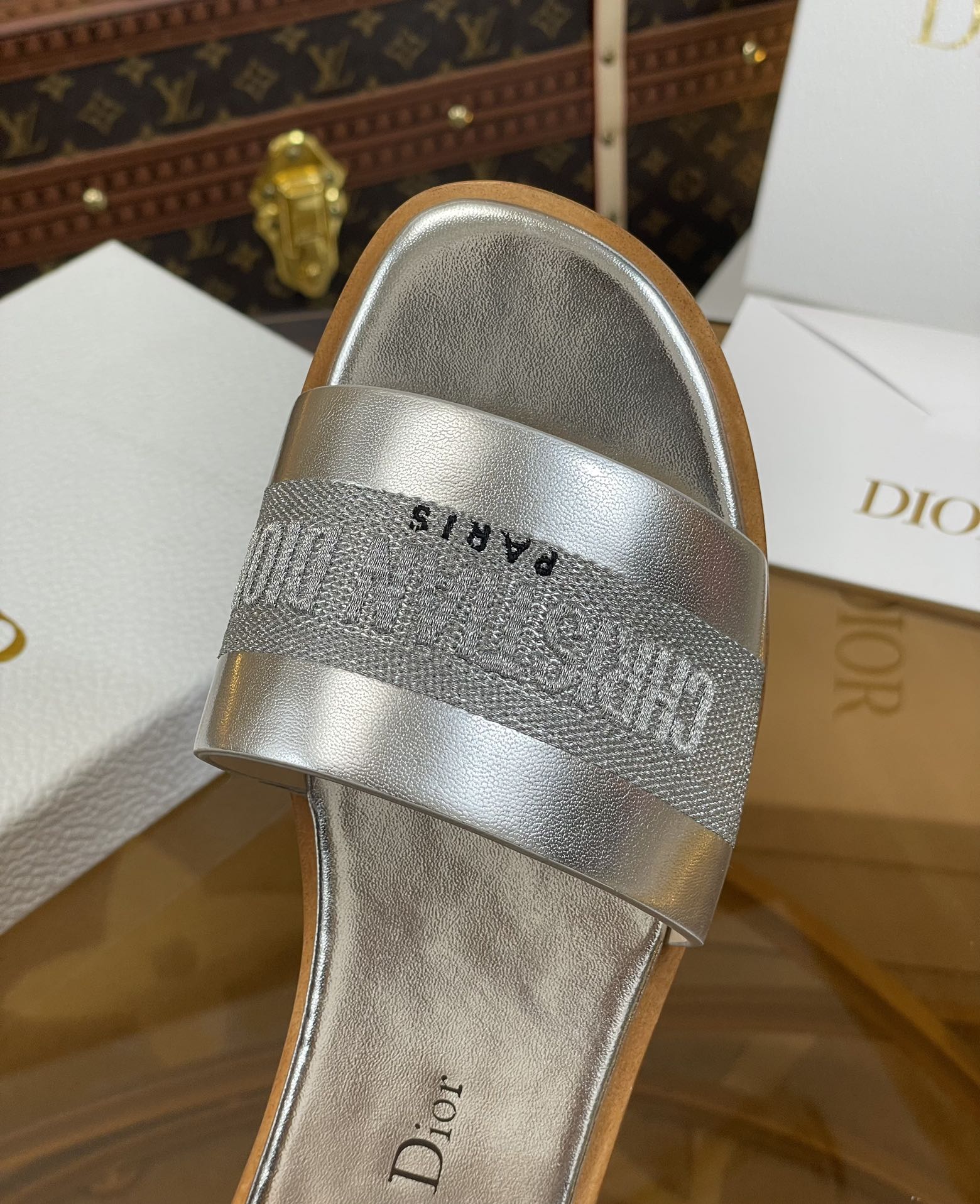 cd slide silver metalic calfskin embroidered cotton